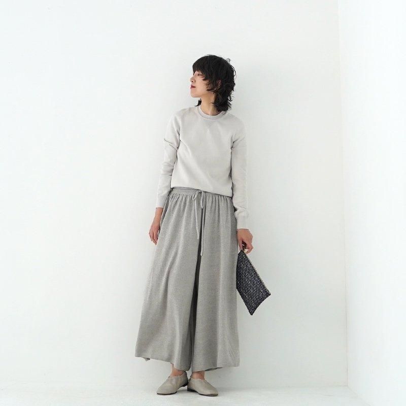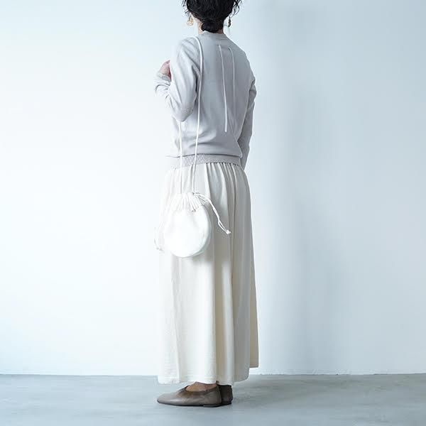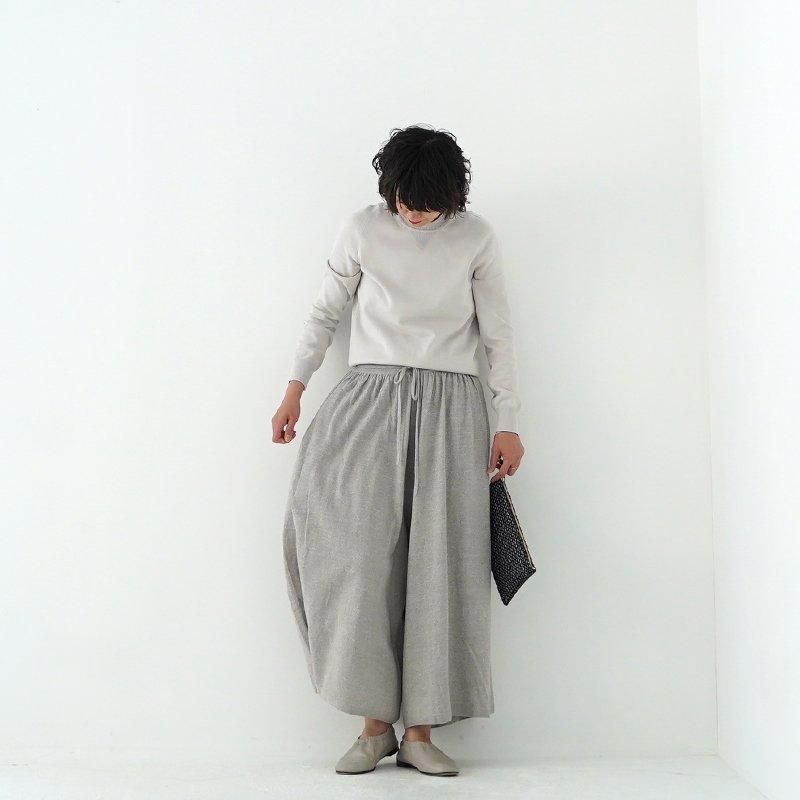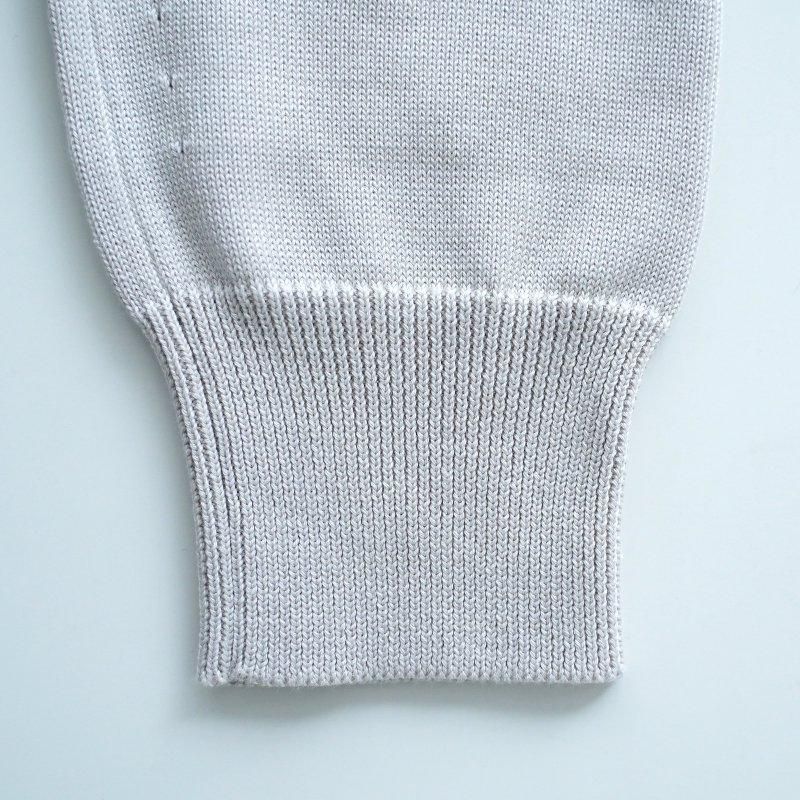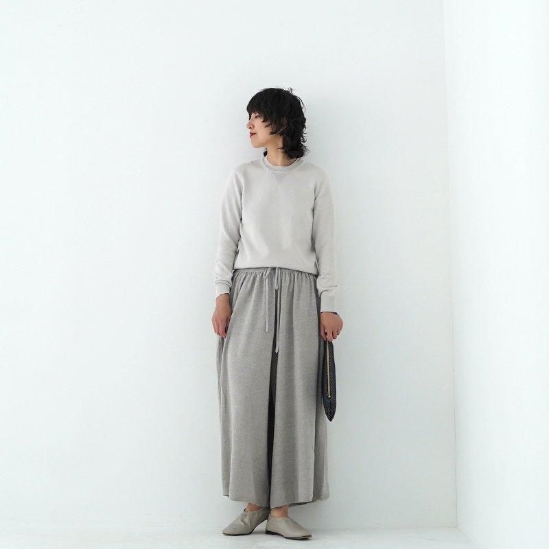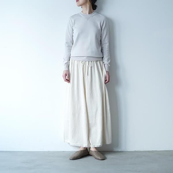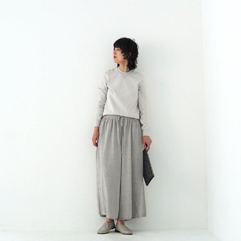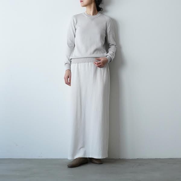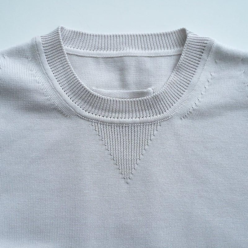 こちらは12Gのベーシック厚みのラウンドネックのロングスリーブニット「THIRZA」。素材は超長繊維綿のピマコットン糸を使用。軽くしなやかでシルクのような光沢があり、繰り返し洗濯してもへたりにくい仕上がりとなっています。襟ぐり、肩のラインや減らし目の模様などのディテールにYURI PARKらしい拘りを感じます。また縫い代が非常に美しく、リバーシブルで着て頂く事が可能です。永くご愛用いただける一枚です。
