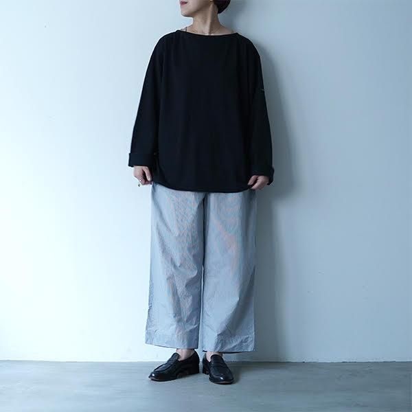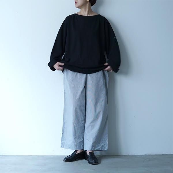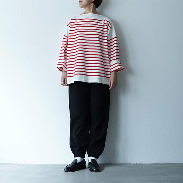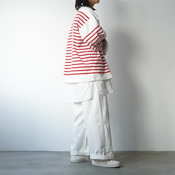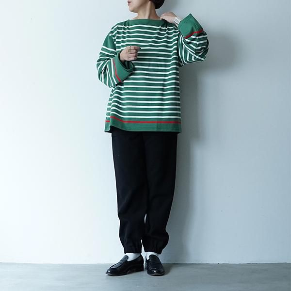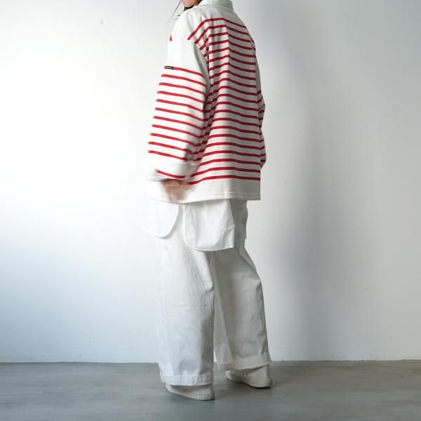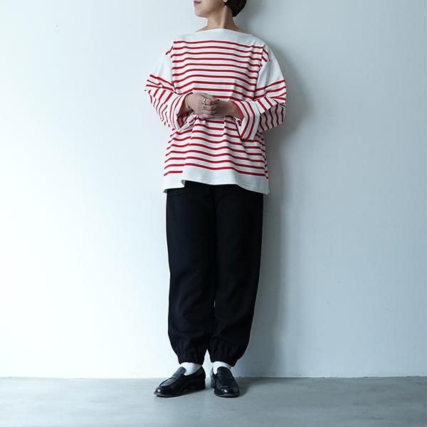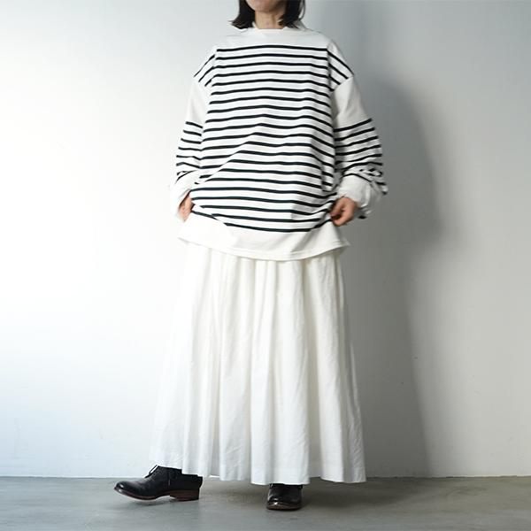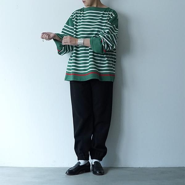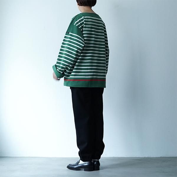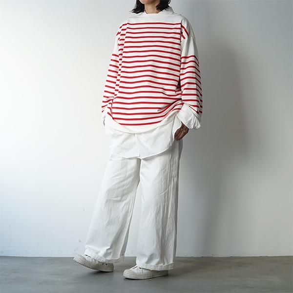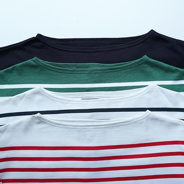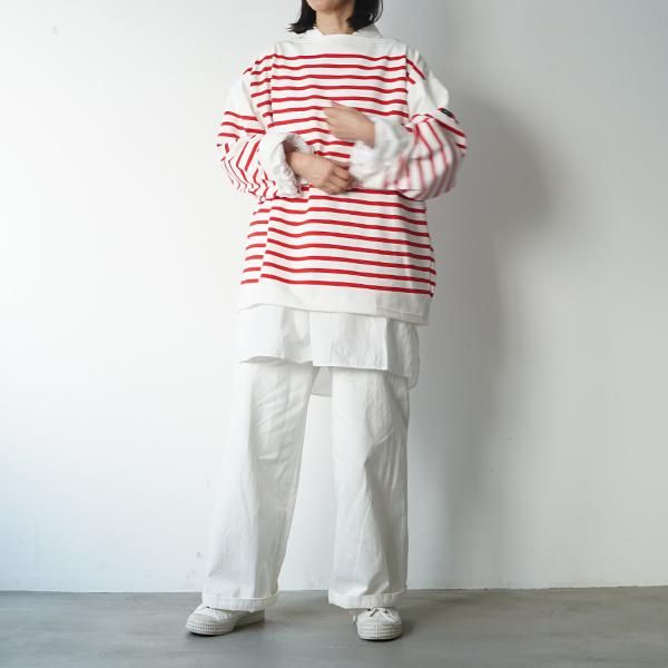 outil(ウティ)は、古くからのフランスのワークウェアから多くの手がかりを得ています。生産はフランスと日本を中心に行っています。"Outil" とは、フランス語で〈道具〉〈ツール〉意味。人と人を繋ぐため、生きるための衣服を提案しています。 Outilのアイコン的なアイテム、フランス製のバスクシャツ ボーダー。こちらは度詰のコットン天竺素材、おなじみのドロップショルダー、アームホールも広めの他にないバランス感が新鮮なリラックスしたシルエットです。ざっくりと着てみたり、ロールアップして袖に変化をつけたり、シャツの上に重ねてみたりと様々なスタイリングを楽しんでいただけます。ユニセックスでお召しいただけるので兼用もおすすめです。 size:0 / 1 0着丈66cm , 身幅61cm , 袖丈57.5cm , 肩幅54cm 1着丈69cm , 身幅65cm , 袖丈61cm , 肩幅58cm color: Myrthe/Off/Flamescarlet Off/Flamscarlet Off/Seamoss Black material:cotton100% model:158cm(Off/Flamscarlet /0,Off/Seamoss /1着用) 165cm(サイズ0着用) お取り扱い店舗・・・dieci kyutaro店