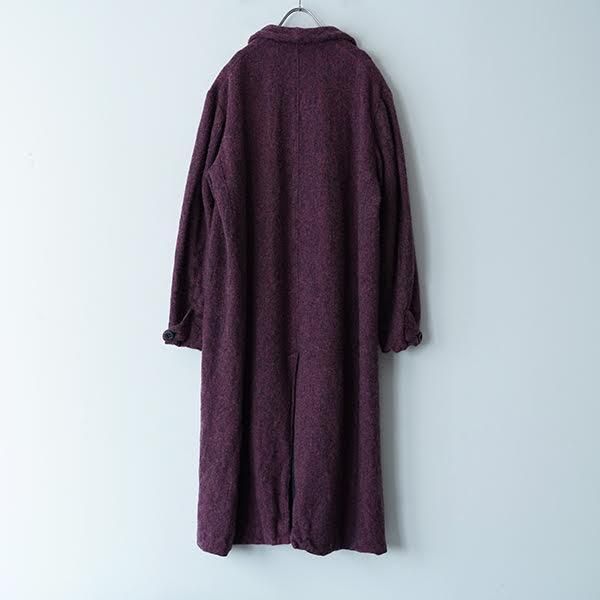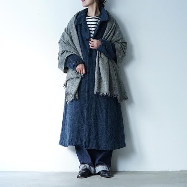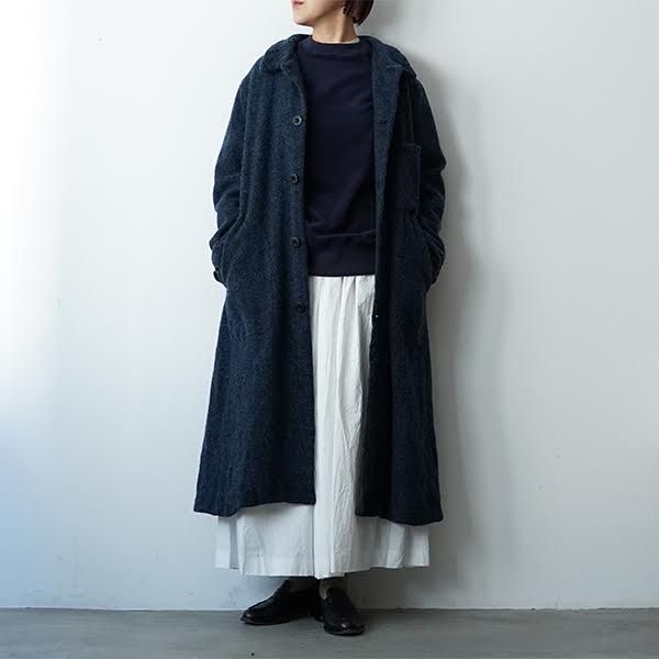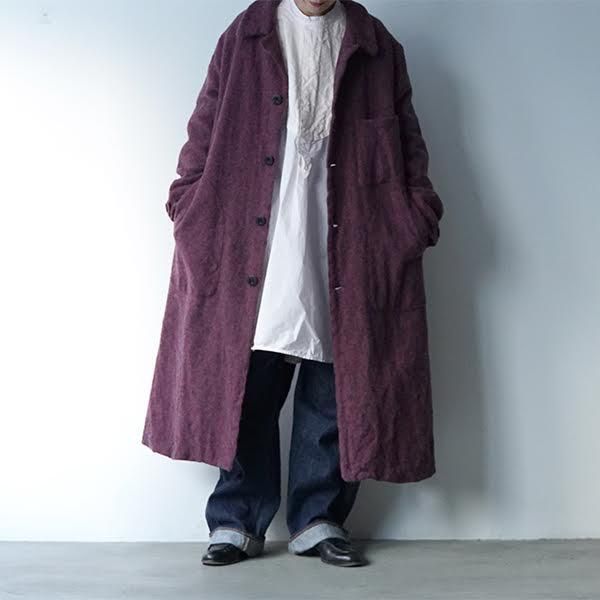 1930年代のフランスのワークコートをベースにデザインされ身幅には程よくゆとりをもたせ袖はスッキリと形成していたりバックスタイルの裾は大きなスリットで動きやすく雰囲気ある容姿にまとめられています。シルエットの綺麗なコートですが縮絨加工による少しの毛羽感と細かくシワのある表情がとても素敵なコートです。