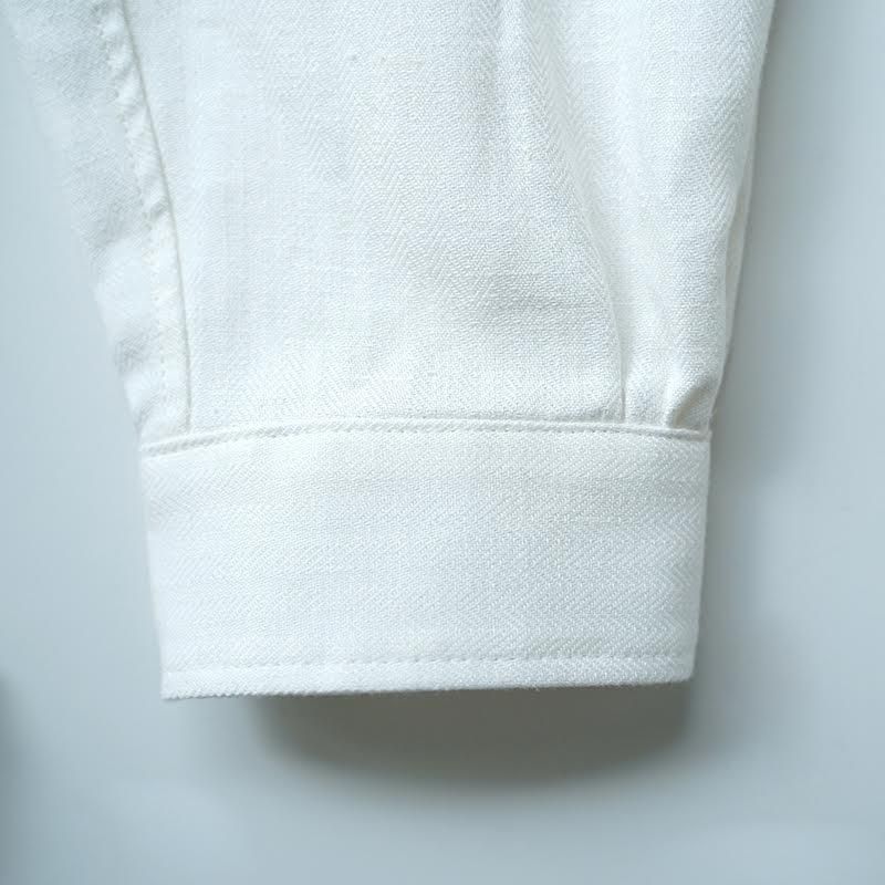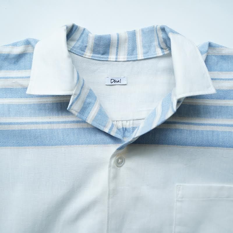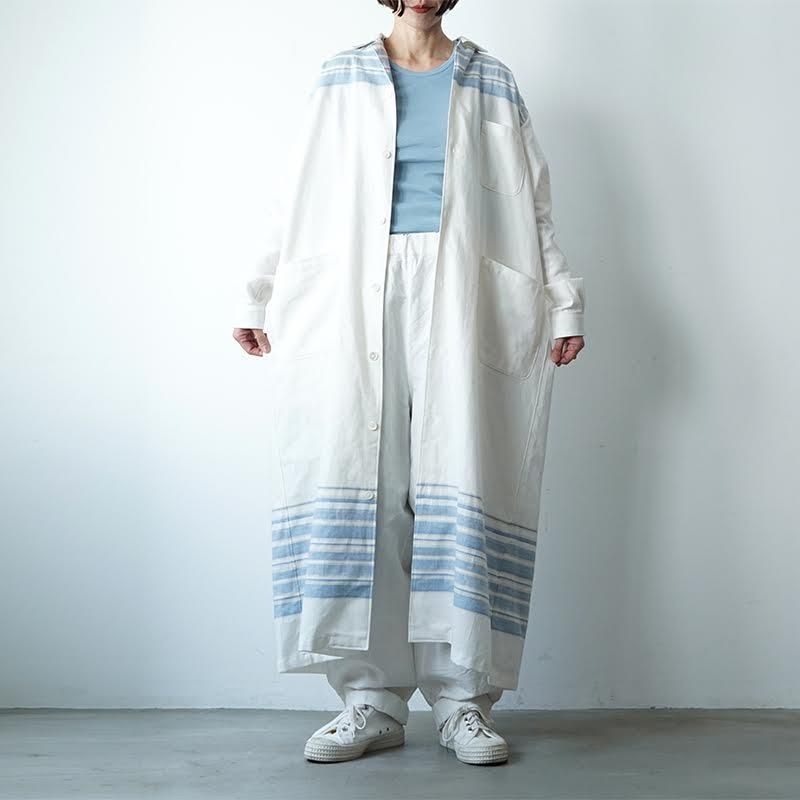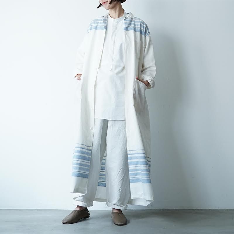 Dhalというブランド名には、ダル(豆)のように、洋服やお店が人の活力や栄養となってほしい、という願いが込められています。 ドビー機械を使用することで、軽さと気品のあるワンピースになっています。白柄部分にも柄があり、細部にまでこだわった素材です。コットンリネン素材が暖かくなるこれからにぴったりです。水色の織りが爽やかな季節を感じさせます。シャツワンピースなので開けてワークコートのように羽織りにしていただくのもおすすめです。 size:F 着丈120cm , 身幅61cm , 肩幅44cm ,袖丈54.5cm color:white×blue Material:Cotton70%,Linen30% model:158cm 取扱い店舗・・・dieci kyutaro店2F