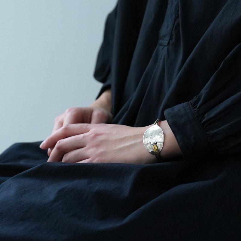 フランス語で『古き良き、往年の麻』を意味するブランド Atelier d'antan(アトリエ・ダンタン)。時を経ても変わることの無い上質な素材というテーマを中心に、年齢や体型にとらわれない、どんな人も自分らしいお洒落を楽しんで欲しいという思いが込められたお洋服をつくられています。 「Born with a Silver Spoon in his mouth」 ヨーロッパでは銀の匙を加えて生まれてくるとその子は幸せに恵まれる、という言い伝えがあります。 古き良き時代の幸せの象徴、古いものでは200年以上前の価値高いスターリングシルバーのアンティークスプーンをお守りのようにとアクセサリーに蘇らせた「Revivre」シリーズ。デザート、ティー、コーヒー、シュガー、ソルトなど用途によるスプーンの大きさ長さの違いに応じてデザインが生まれています。経年変化が織りなす佇まいはもちろん、素材、年代、生産地などを証明するために打ち込まれた美しいホールマーク、家柄を表すイニシャルや文様を彫り込んだ持ち手。一本一本異なるデザインを眺めていると、遠い国から長い時を経て今こうして自分の手元に届いたのだと感慨深い気持ちになります。 ルヴィーブルのバングルは美しく個性豊かなアンティークスプーンを使用しています。 スプーンとひと括りに言っても、デザート、シュガー、コーヒーといった様々な大きさや形状があり、素材や年代などを記すホールマーク、柄に施されたレリーフなど一点一点個性があり、独特の雰囲気を感じます。 つけ始めは新しい輝きに存在感を感じますが、時が経ち落ち着いてきた光沢も魅力的です。普段のスタイリングにも馴染みやすいので毎日身に付けていただけます。 Coffee Spoon Bangle どんと印象的なボリューム感とスプーンの面影感じるシルエット。 size:0 内径 約12.5cm material: Sterling Silver + Brass お取り扱い店舗・・・dieici kyutaro店2F