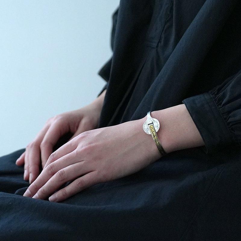 フランス語で『古き良き、往年の麻』を意味するブランド Atelier d'antan(アトリエ・ダンタン)。時を経ても変わることの無い上質な素材というテーマを中心に、年齢や体型にとらわれない、どんな人も自分らしいお洒落を楽しんで欲しいという思いが込められたお洋服をつくられています。 「Born with a Silver Spoon in his mouth」 ヨーロッパでは銀の匙を加えて生まれてくるとその子は幸せに恵まれる、という言い伝えがあります。 古き良き時代の幸せの象徴、古いものでは200年以上前の価値高いスターリングシルバーのアンティークスプーンをお守りのようにとアクセサリーに蘇らせた「Revivre」シリーズ。デザート、ティー、コーヒー、シュガー、ソルトなど用途によるスプーンの大きさ長さの違いに応じてデザインが生まれています。経年変化が織りなす佇まいはもちろん、素材、年代、生産地などを証明するために打ち込まれた美しいホールマーク、家柄を表すイニシャルや文様を彫り込んだ持ち手。一本一本異なるデザインを眺めていると、遠い国から長い時を経て今こうして自分の手元に届いたのだと感慨深い気持ちになります。 ルヴィーブルのバングルは美しく個性豊かなアンティークスプーンを使用しています。 スプーンとひと括りに言っても、デザート、シュガー、コーヒーといった様々な大きさや形状があり、素材や年代などを記すホールマーク、柄に施されたレリーフなど一点一点個性があり、独特の雰囲気を感じます。 つけ始めは新しい輝きに存在感を感じますが、時が経ち落ち着いてきた光沢も魅力的です。普段のスタイリングにも馴染みやすいので毎日身に付けていただけます。 Baby Spoon Bangle シルバーと真鍮の割合が程よく、さまざまなスタイルに馴染む一本。 size:0 内径 約12.5cm material: Sterling Silver + Brass お取り扱い店舗・・・dieici kyutaro店2F