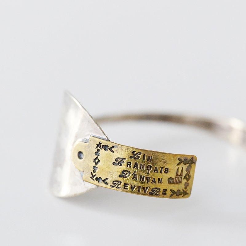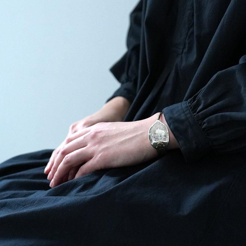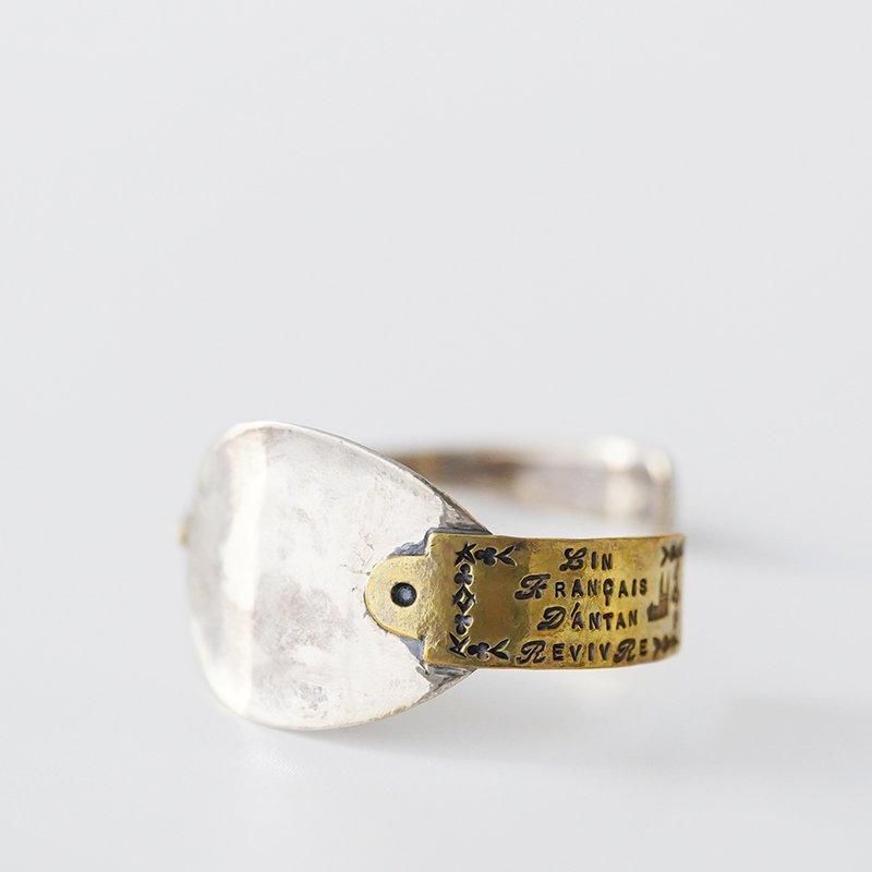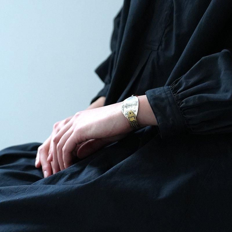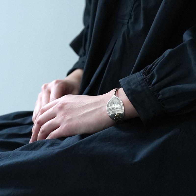 フランス語で『古き良き、往年の麻』を意味するブランド Atelier d'antan(アトリエ・ダンタン)。時を経ても変わることの無い上質な素材というテーマを中心に、年齢や体型にとらわれない、どんな人も自分らしいお洒落を楽しんで欲しいという思いが込められたお洋服をつくられています。 「Born with a Silver Spoon in his mouth」 ヨーロッパでは銀の匙を加えて生まれてくるとその子は幸せに恵まれる、という言い伝えがあります。 古き良き時代の幸せの象徴、古いものでは200年以上前の価値高いスターリングシルバーのアンティークスプーンをお守りのようにとアクセサリーに蘇らせた「Revivre」シリーズ。デザート、ティー、コーヒー、シュガー、ソルトなど用途によるスプーンの大きさ長さの違いに応じてデザインが生まれています。経年変化が織りなす佇まいはもちろん、素材、年代、生産地などを証明するために打ち込まれた美しいホールマーク、家柄を表すイニシャルや文様を彫り込んだ持ち手。一本一本異なるデザインを眺めていると、遠い国から長い時を経て今こうして自分の手元に届いたのだと感慨深い気持ちになります。 ルヴィーブルのバングルは美しく個性豊かなアンティークスプーンを使用しています。 スプーンとひと括りに言っても、デザート、シュガー、コーヒーといった様々な大きさや形状があり、素材や年代などを記すホールマーク、柄に施されたレリーフなど一点一点個性があり、独特の雰囲気を感じます。 つけ始めは新しい輝きに存在感を感じますが、時が経ち落ち着いてきた光沢も魅力的です。普段のスタイリングにも馴染みやすいので毎日身に付けていただけます。 Tea Spoon Bangle どんと存在感のあるボリューム感と真鍮のラベルが印象的。 size:0 内径 約12.5cm material: Sterling Silver, Brass お取り扱い店舗・・・dieici kyutaro店2F