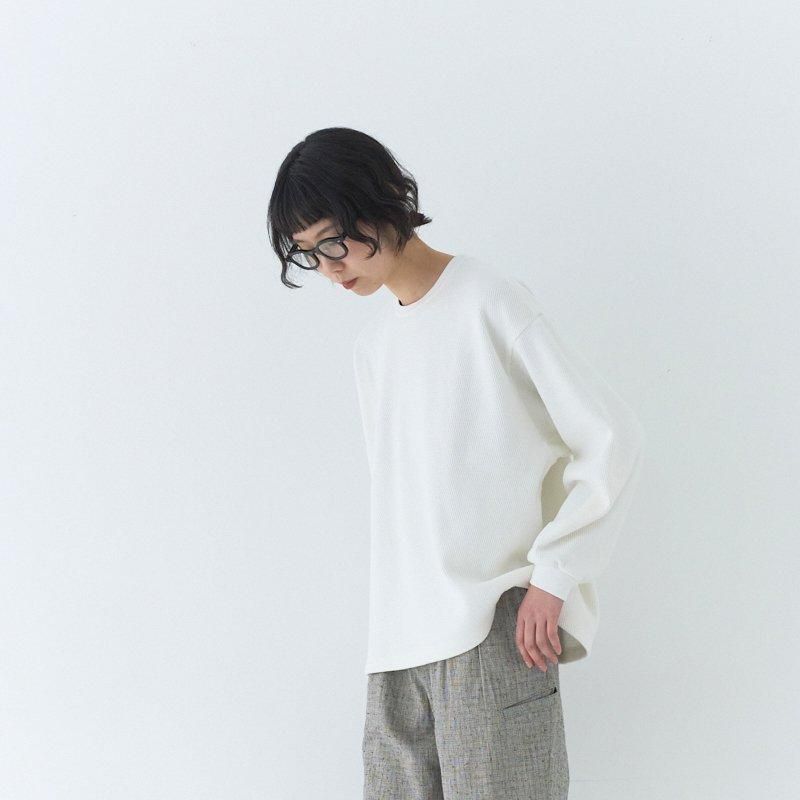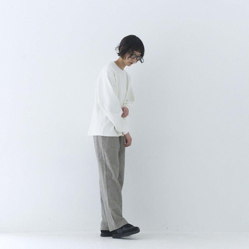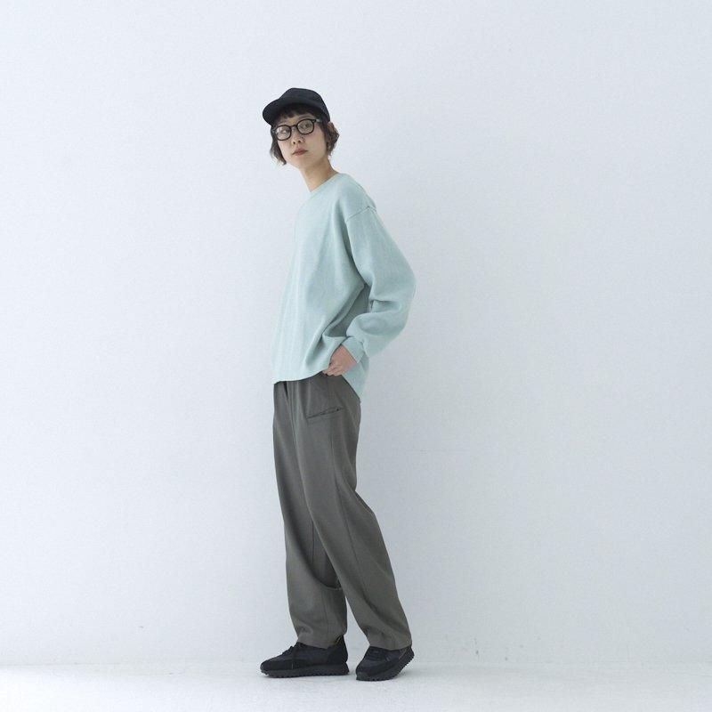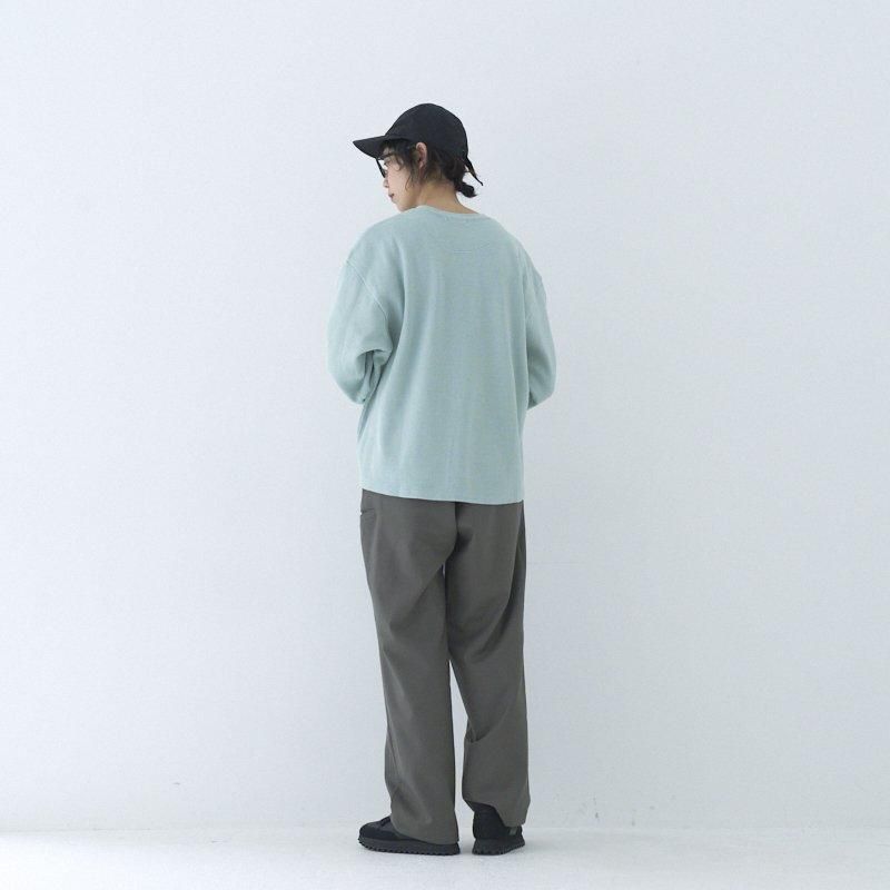 ポリプロイド(POLYPLOID)は、2017年にドイツ・ベルリンにてイゾルデ・オーギュスト・リッチリー(Isolde Auguste Richly)により設立。2018-19年秋冬コレクションにてデビュー。ブランド名のポリプロイドは化学用語で、「多倍数体」を意味する。3種類の異なる素材と色で展開することで、プロダクトに奥行きや広がりをもたらす実験的アプローチを試みている。生産はドイツおよび日本で行っている。ヨーロッパのマテリアルはドイツで縫製され、日本のマテリアルは日本で作られる。 ヘビーウエイトのダブルフェイスサーマル生地を使用したロングスリーブTシャツです。 凹凸のある生地に程よい厚みがあるのでスウエット感覚で楽しんでいただけます。 全体的にゆったりとしたパターンですが、袖口はキュッと絞られ、裾も前後差があるので華奢な方や小柄な方でも着用しやすく、着る方の体格を選ばないカットソーです。 日本製 25SS size:1 着丈62cm(後ろ身頃67cm),身幅64cm,肩幅54cm, 袖丈57cm color: WHITE,SAGE material:COTTON 100% model:170cm 取り扱い店舗・・・dieci kyutaro店2F