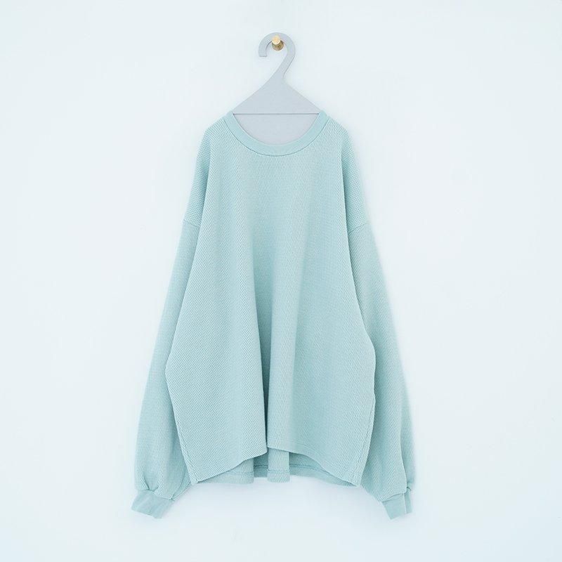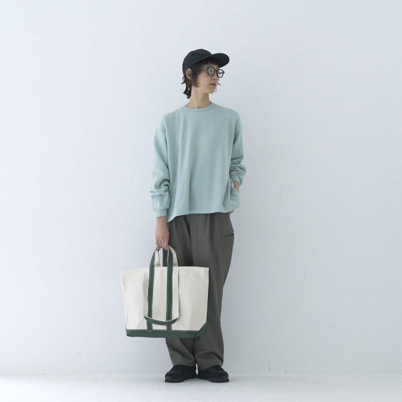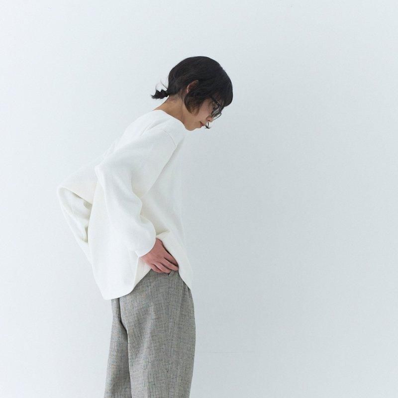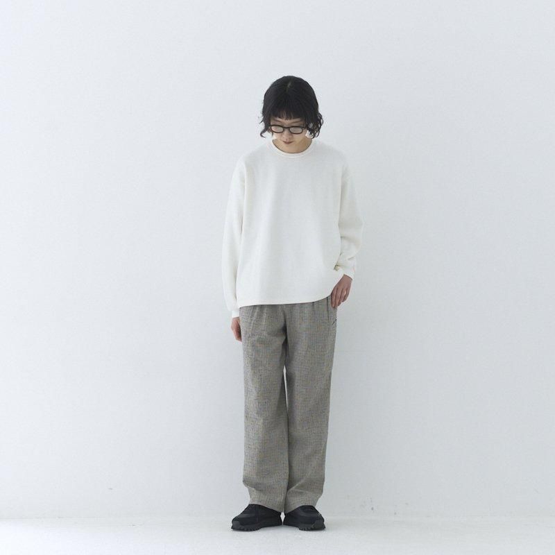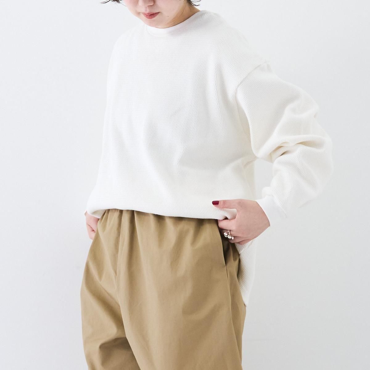 ポリプロイド(POLYPLOID)は、2017年にドイツ・ベルリンにてイゾルデ・オーギュスト・リッチリー(Isolde Auguste Richly)により設立。2018-19年秋冬コレクションにてデビュー。ブランド名のポリプロイドは化学用語で、「多倍数体」を意味する。3種類の異なる素材と色で展開することで、プロダクトに奥行きや広がりをもたらす実験的アプローチを試みている。生産はドイツおよび日本で行っている。ヨーロッパのマテリアルはドイツで縫製され、日本のマテリアルは日本で作られる。 ヘビーウエイトのダブルフェイスサーマル生地を使用したロングスリーブTシャツです。 凹凸のある生地に程よい厚みがあるのでスウエット感覚で楽しんでいただけます。 全体的にゆったりとしたパターンですが、袖口はキュッと絞られ、裾も前後差があるので華奢な方や小柄な方でも着用しやすく、着る方の体格を選ばないカットソーです。 日本製 25SS size:1 着丈62cm(後ろ身頃67cm),身幅64cm,肩幅54cm, 袖丈57cm color: WHITE,SAGE material:COTTON 100% model:170cm 取り扱い店舗・・・dieci kyutaro店2F