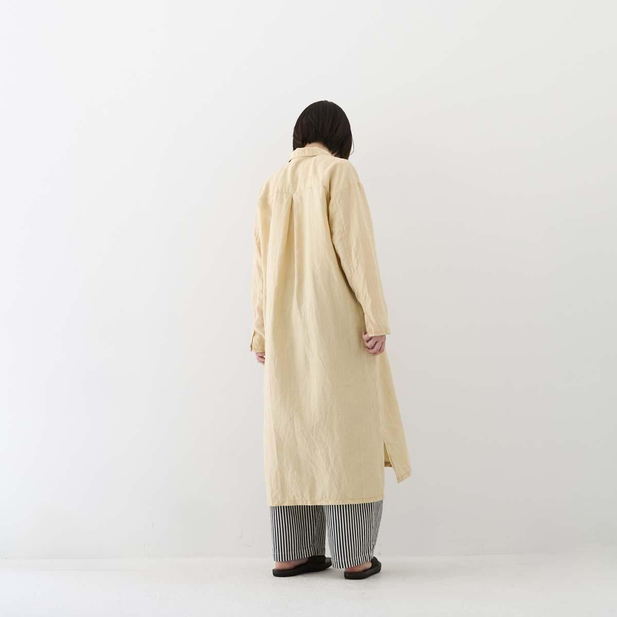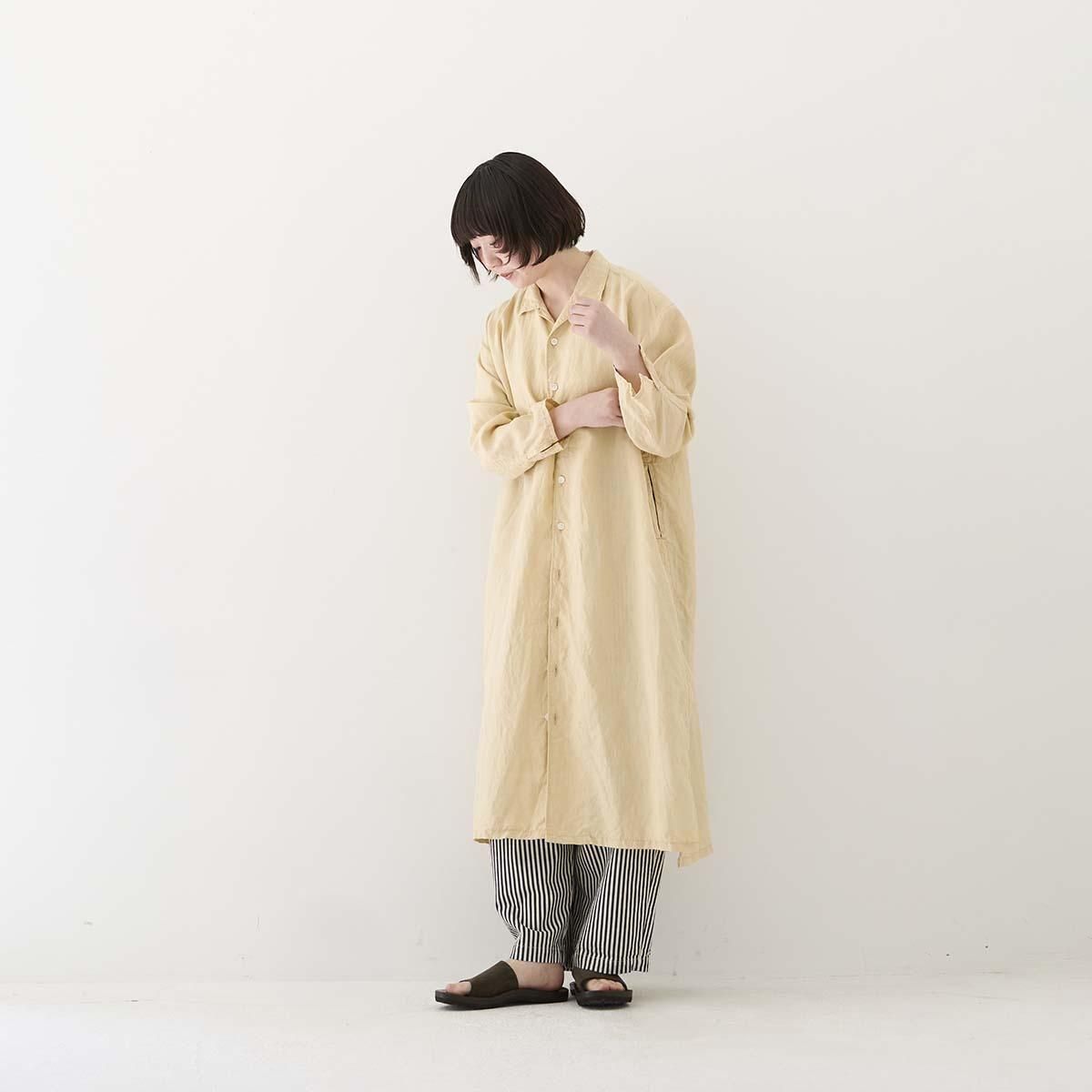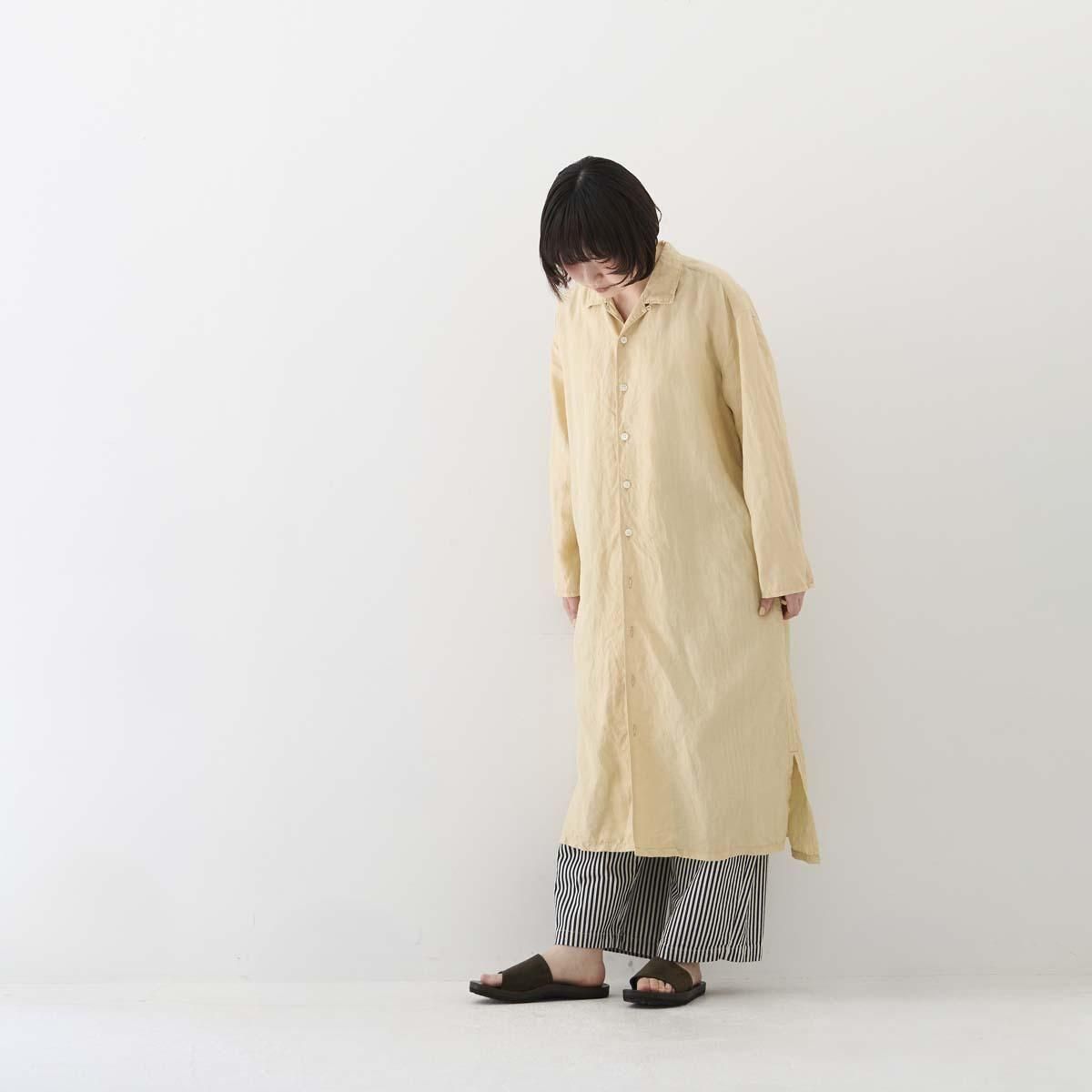 homspun(ホームスパン)は2000年にスタートされたブランドです。シンプルで毎日着たいと思える、そんな思いから生まれました。 定番リネンバイオ素材のシャリっと気持ちの良いシャツワンピースです。 シャリっとした肌離れのよいリネンバイオ生地はファンが多い定番生地の一つです。前を開けて羽織の様にも、パンツを入れてレイヤードスタイルもお楽しみ頂けます。 size:F 着丈114.5cm 身幅55.5cm 裄丈79cm color: クリーム / ネイビー / ブラック material: linen100% お取り扱い店舗・・・dieci kyutaro2F size_chart