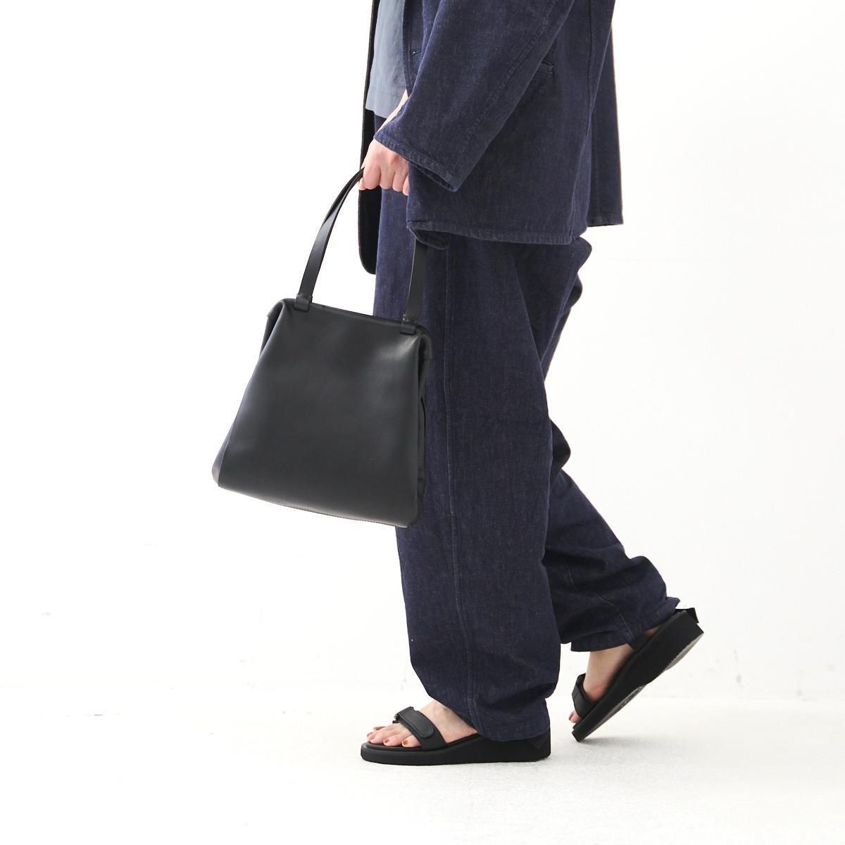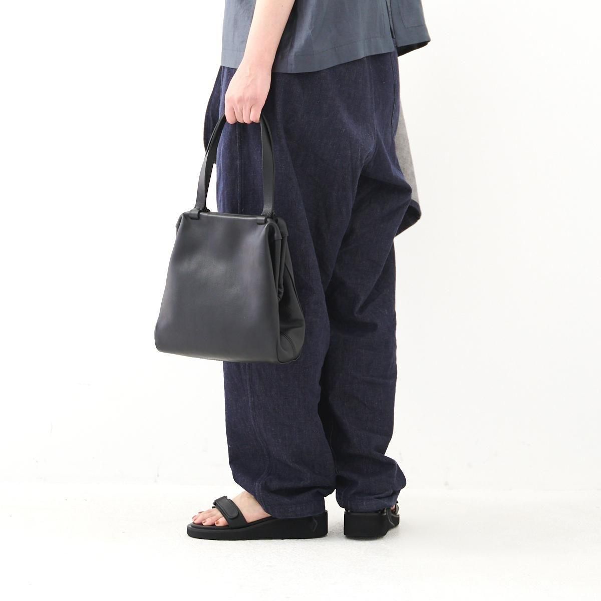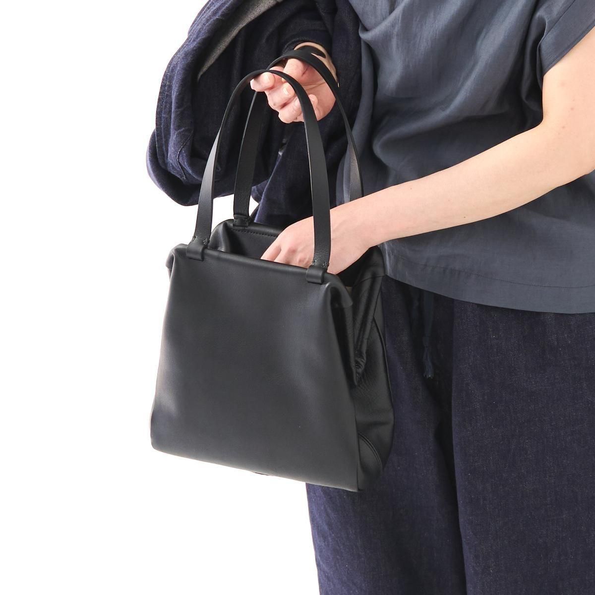 こちらはフレームトートのSサイズ。 天然の渋で鞣した山羊革を使用。軽く、しなやかでありながら強靭で型くずれが少なく、全体に入った天然のシボ模様と光沢が魅力です。 大きく口が開くがま口が非常に使いやすく、マグネットで閉めることが可能です。内側にはオリジナルのヘンプ生地の内張りが施されており、ジップ付きのポケットが付いています。程よい長さの持ち手なので、肩掛けもできます。マチがあるふっくらとしたシルエットで物を入れた時も美しく、自立してくれるので使い勝手も良く、コンパクトすぎずとても良いサイズ感です。カジュアルはもちろん、フォーマルなシチュエーションにも最適です。オリジナルのヘンプ生地で製作された巾着が付属します。 color:Black material:表/GOAT LEATER size:W22 x H12 x D5 cm ※天然皮革を使用しているため、小ジワ、小キズなどが見られます。 革の持つ個体差、風合いとしてご了承ください。 ※ご利用のブラウザによって実際の商品とカラーが多少異なって見える場合がございます。予めご了承下さい。 お取り扱い店舗・・・dieci kyutaro店2F -------------------------------------------------------- style craft(スタイルクラフト) 2000年2月 南埜次郎がスタートさせたバックブランド。 使用している素材は生産の現場まで南埜次郎が赴き、オリジナルレシピにより作成されたものです。革は姫路で作られている本ヌメ革を使用。昔ながらの渋槽を使った鞣し(なめし)で時間をかけて仕上げられた本物のヌメ革です。主に、牛革、山羊革、ラクダ革、水牛革等を使用しています。その他、金具類も真鍮や木製等を使ったオリジナルを使用。いずれの素材も使い込む程に独特の風合いが増していきます。