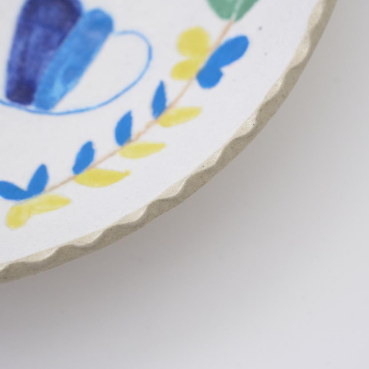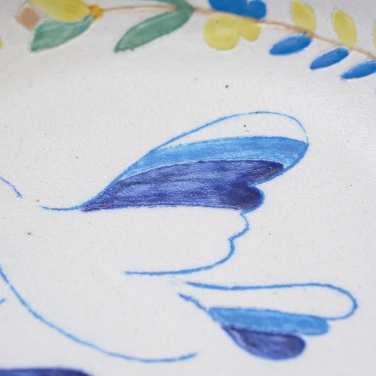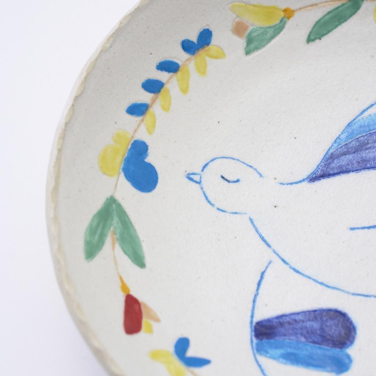こちらはカラフルな絵付けが可愛らしいお皿です。羽ばたく鳥は一つ一つ手描きされています。手仕事感じる温かみのある作品です。個体差がございます。