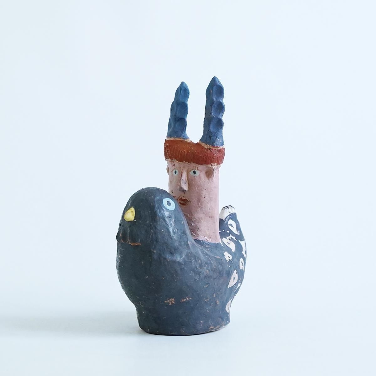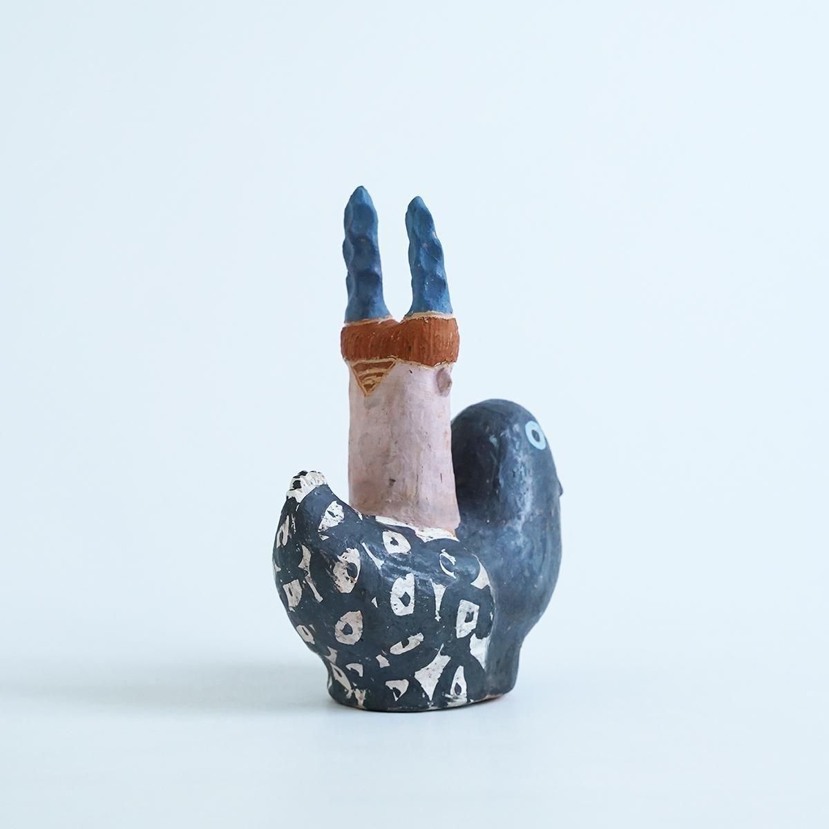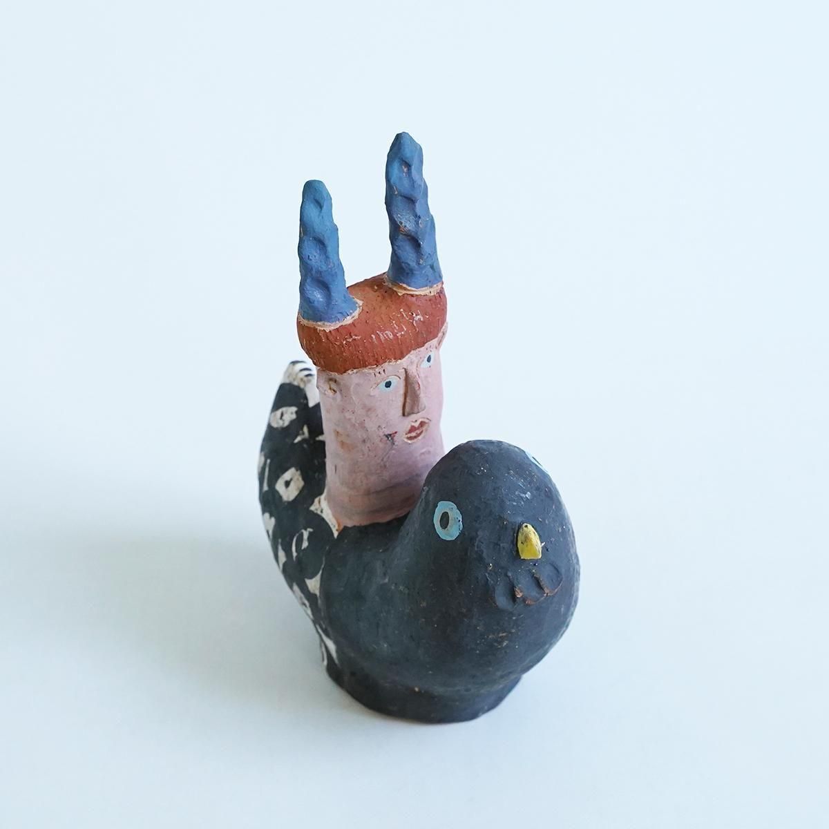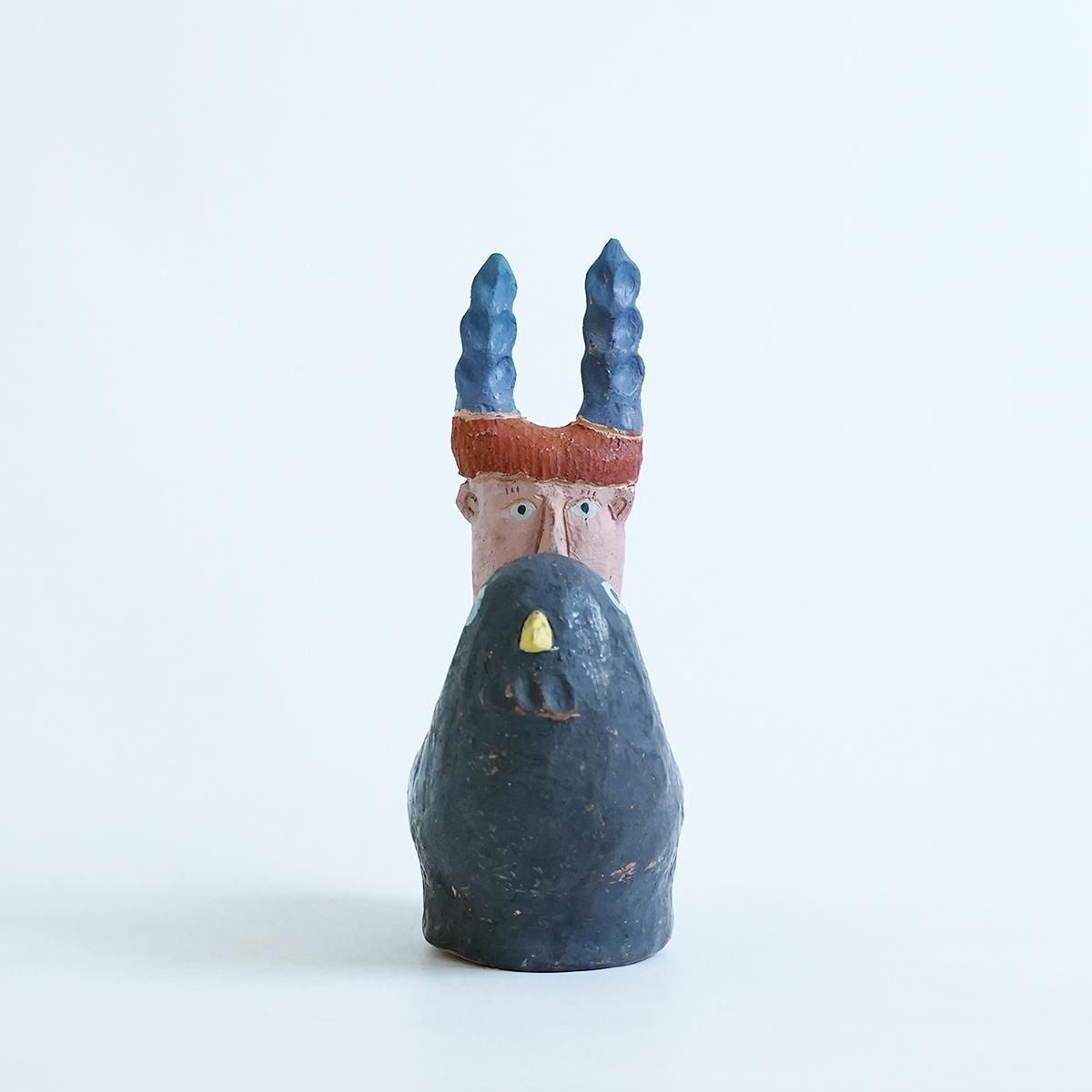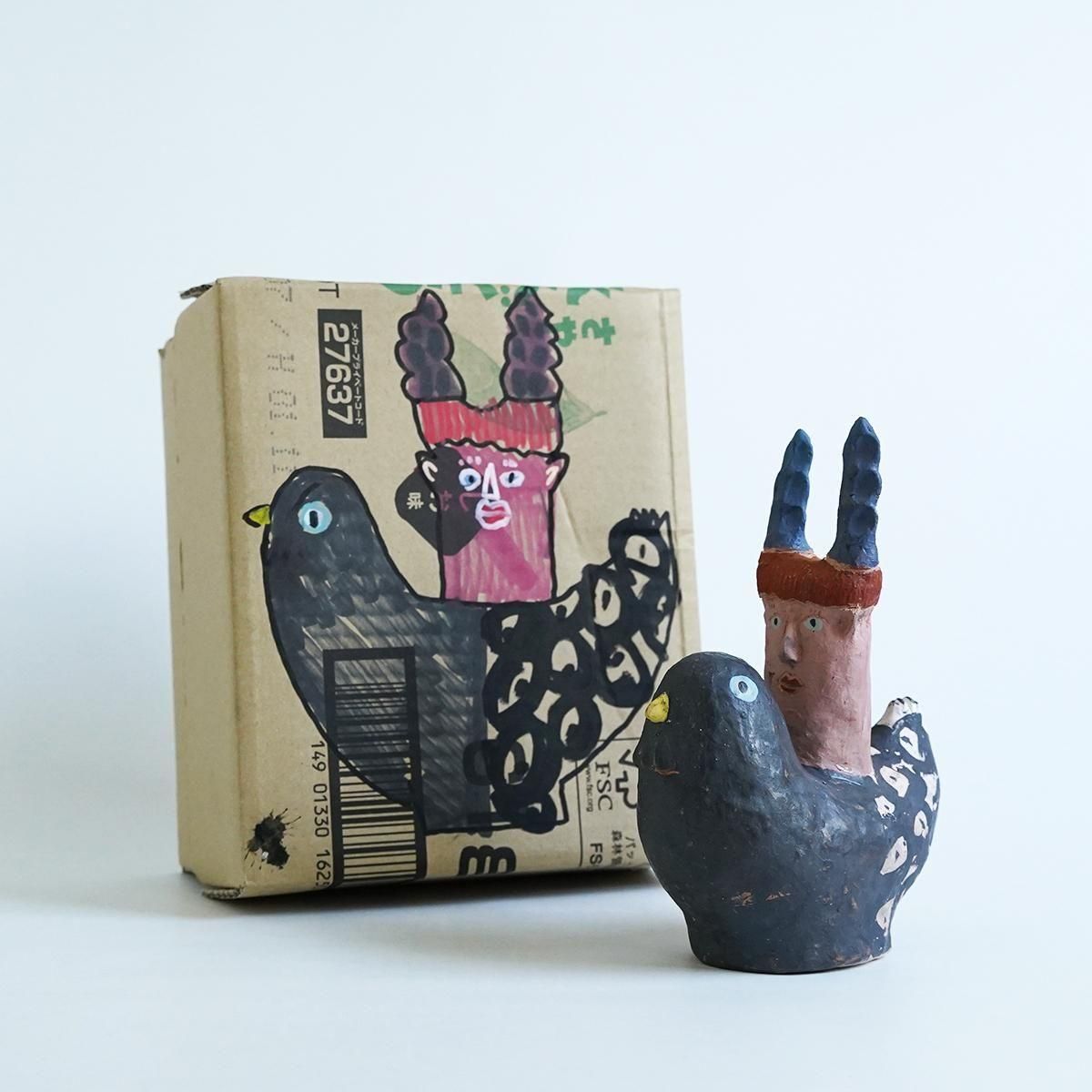 佐賀県にて活動されている三浦宏基さんの作品。 野焼きやガス窯などを使い分け、彩りあふれる器やオブジェなどを日々製作されています。自由な発想が行き交うような作品群は、見ているだけで何か強いエネルギーを感じさせてくれます。 こちらの作品は野焼きで焼かれたオブジェです。 野焼きならではの、土のようなテクスチャーの仕上がりです。 トリの背中から飛び出した青いツノの人。このちょっと不思議で楽しい組み合わせが、見る人の心をくすぐります。 ひと目見たら忘れられない、インパクトたっぷりの作品です。 お部屋のオブジェとしてお楽しみいただける作品です。 通称「お布団箱」と呼ばれるリサイクルの箱を使ったパッケージにも絵が描かれているので、こちらも作品として飾ることができます。 size:W約8.5cm×H約21.5cm×D約16cm ※小さい欠けや傷、ひびがある場合がございます。製作途中に出来たものですので、作品の風合いとしてお楽しみください。 ※野焼きにて制作されていますので、ススがつくことがあります。家具などに置かれる際はご注意ください。 取り扱い店舗・・・dieci 天神橋店