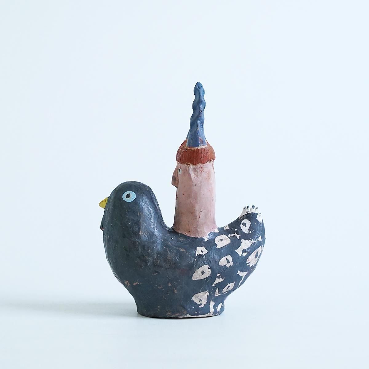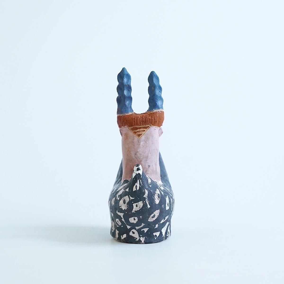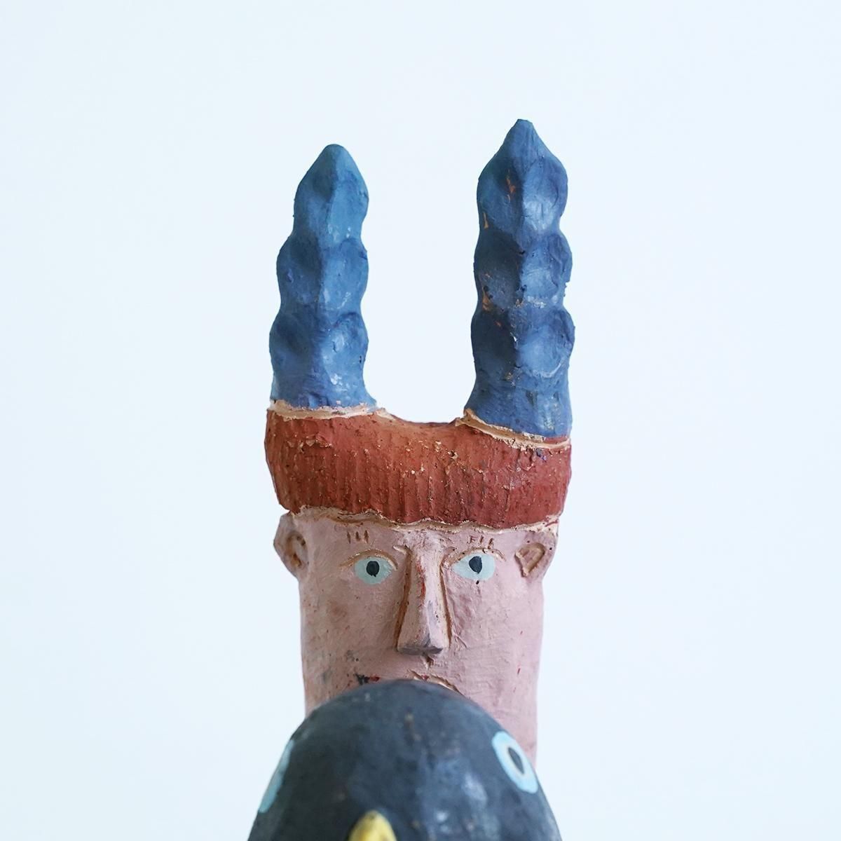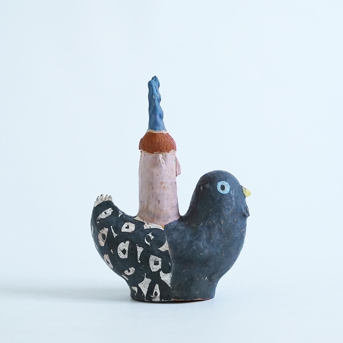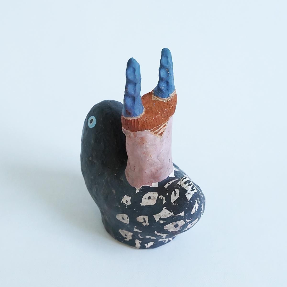 佐賀県にて活動されている三浦宏基さんの作品。 野焼きやガス窯などを使い分け、彩りあふれる器やオブジェなどを日々製作されています。自由な発想が行き交うような作品群は、見ているだけで何か強いエネルギーを感じさせてくれます。 こちらの作品は野焼きで焼かれたオブジェです。 野焼きならではの、土のようなテクスチャーの仕上がりです。 トリの背中から飛び出した青いツノの人。このちょっと不思議で楽しい組み合わせが、見る人の心をくすぐります。 ひと目見たら忘れられない、インパクトたっぷりの作品です。 お部屋のオブジェとしてお楽しみいただける作品です。 通称「お布団箱」と呼ばれるリサイクルの箱を使ったパッケージにも絵が描かれているので、こちらも作品として飾ることができます。 size:W約8.5cm×H約21.5cm×D約16cm ※小さい欠けや傷、ひびがある場合がございます。製作途中に出来たものですので、作品の風合いとしてお楽しみください。 ※野焼きにて制作されていますので、ススがつくことがあります。家具などに置かれる際はご注意ください。 取り扱い店舗・・・dieci 天神橋店