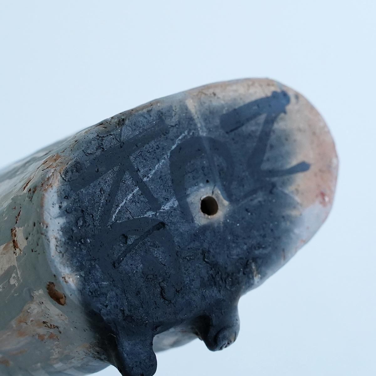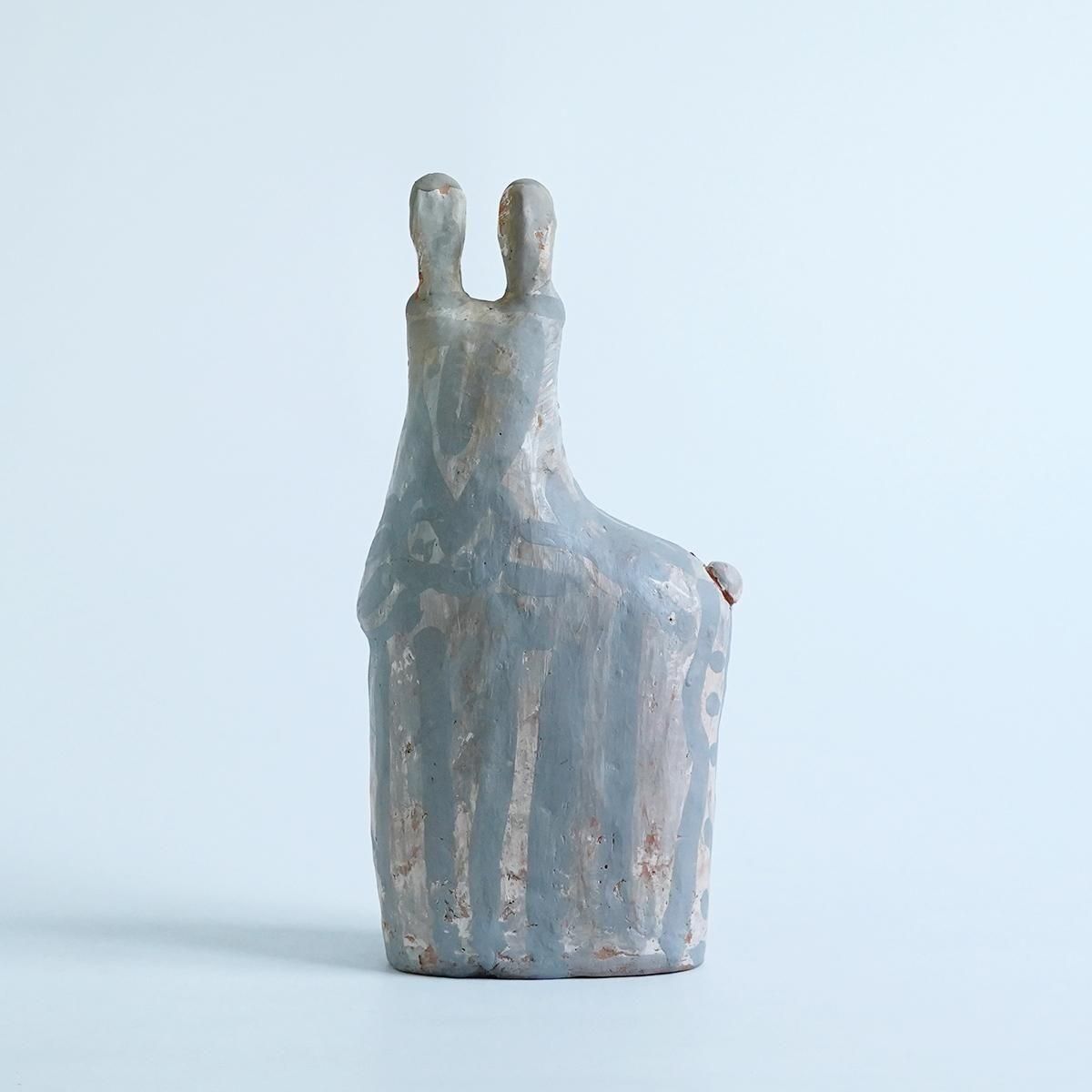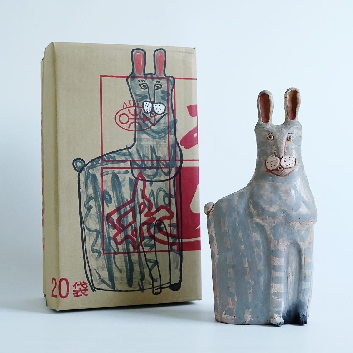 佐賀県にて活動されている三浦宏基さんの作品。 野焼きやガス窯などを使い分け、彩りあふれる器やオブジェなどを日々製作されています。自由な発想が行き交うような作品群は、見ているだけで何か強いエネルギーを感じさせてくれます。 こちらの作品は野焼きで焼かれたウサギのオブジェです。 野焼きならではの、土のようなテクスチャーの仕上がりです。 描かれたリズミカルな模様にウサギの落ち着いた表情が心和む一点です。 存在感があるサイズ感でお部屋に一つ飾るだけでも十分な存在感が伺えます。 通称「お布団箱」と呼ばれるリサイクルの箱を使ったパッケージにも絵が描かれているので、こちらも作品として飾ることができます。 size:W約15.5cm×H約31.5cm×D約8cm ※小さい欠けや傷、ひびがある場合がございます。製作途中に出来たものですので、作品の風合いとしてお楽しみください。 ※野焼きにて制作されていますので、ススがつくことがあります。家具などに置かれる際はご注意ください。 取り扱い店舗・・・dieci 天神橋店