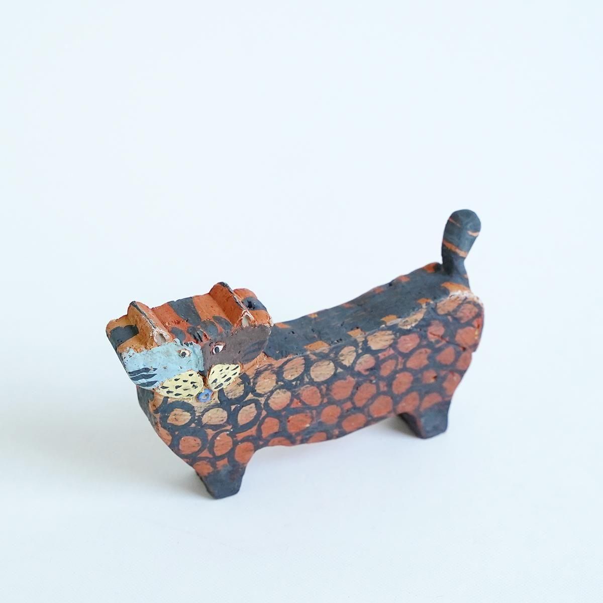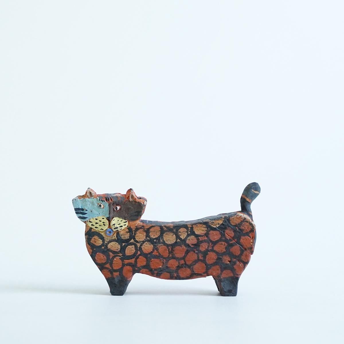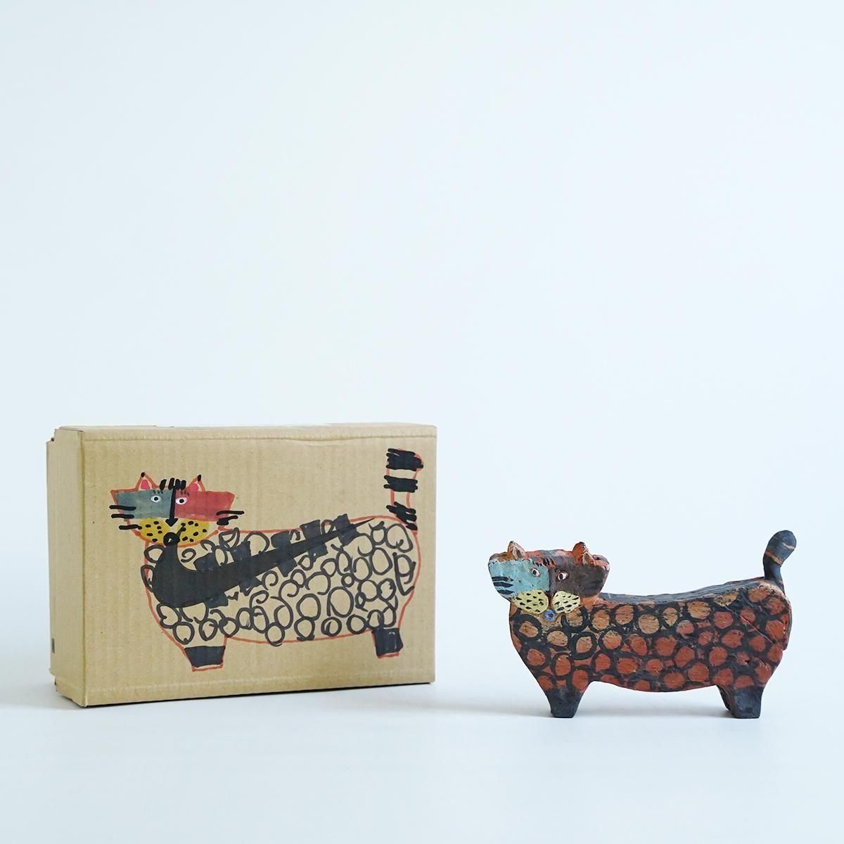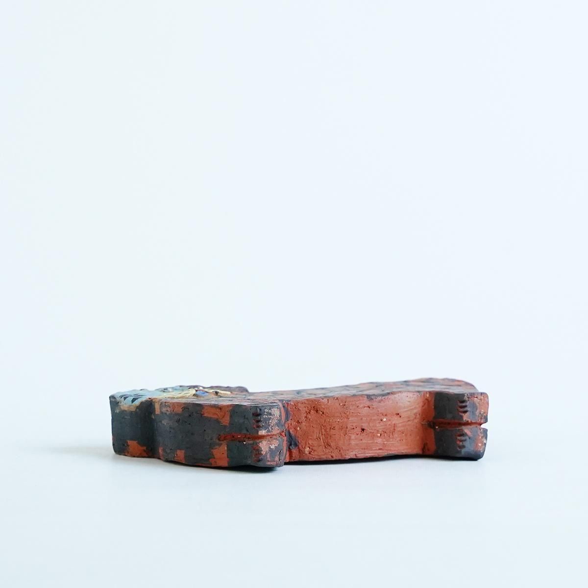 佐賀県にて活動されている三浦宏基さんの作品。 野焼きやガス窯などを使い分け、彩りあふれる器やオブジェなどを日々製作されています。自由な発想が行き交うような作品群は、見ているだけで何か強いエネルギーを感じさせてくれます。 こちらの作品は野焼きで焼かれたネコのオブジェです。 野焼きならではの、土のようなテクスチャーの仕上がりです。 平面的なファルムでありながら、顔の表情と体の模様が目を引く小さめのサイズながらも存在感が感じられる作品です。 コンパクトで飾りやすくお部屋のアクセントとなり楽しめる作品です。 通称「お布団箱」と呼ばれるリサイクルの箱を使ったパッケージにも絵が描かれているので、こちらも作品として飾ることができます。 size:W約16cm×H約9.5cm×D約2.5cm ※小さい欠けや傷、ひびがある場合がございます。製作途中に出来たものですので、作品の風合いとしてお楽しみください。 ※野焼きにて制作されていますので、ススがつくことがあります。家具などに置かれる際はご注意ください。 取り扱い店舗・・・dieci 天神橋店