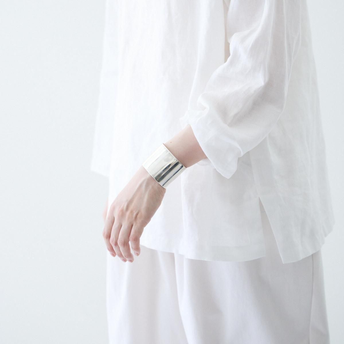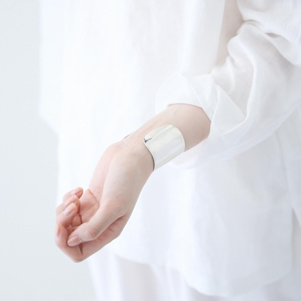 YAECA(ヤエカ)は細かな仕立ての良さが特徴です。特にパンツやシャツなどのデイリー使いのアイテムは、一見普通に感じさせるデザインに絶妙なさじ加減のディテールが男女年齢問わず、愛されています。 こちらはYAECAの井出さんも愛用しているシルバーアクセサリーシリーズ。 インドの伝統的な装身具をモチーフにして作った、シンプルで過不足のない形です。 ともに年を重ねていけるようにシルバーで職人が一つ一つ手作業で制作しています。 磨いていくことで変化していく色合いや艶、使っていくことでできる傷やへこみ。時間とともに自分らしく育っていく様を、長くお楽しみください。 夏はもちろん、冬もニットからちらっと覗くのも素敵です。使い込むほどに味わいの出るアクセサリーです。 素材:silver(SV925) size: S(16.5cm) 幅4.5cm ※サイズの()内は手をいれる部分を含めた円周の長さです。ハンドメイドのため個体差がございます。 取扱い店舗…dieci芝川ビル店/ dieci kyutaro店