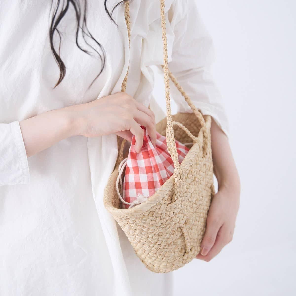 東京・吉祥寺のショップ「CINQ」のオリジナル、ギンガムチェックの巾着です。 化粧品やお薬など、バッグのなかで散らかりやすい小物をまとめるのにピッタリな、嵩張らないコンパクトなサイズです。 手に下げて持てば、赤いギンガムチェックがコーディネートをパッと明るくしてくれます。 生地は、ペットボトルや繊維屑などが原料のリサイクルポリエステル(ECOPET)とコットンが使用されたもの。しっかりとした風合いがあり、洗濯による縮みの少ない素材のため、お手入れもしやすい素材です。 CINQとマダガスカルを拠点とするバッグブランドAMPIANAのコラボのカゴバッグとも相性がよく、ギンガムチェックの模様を覗かせるように入れていただくのがおすすめです。(CINQ/AMPIANA ミニショルダー:https://shop.dieci-cafe.com/?pid=187333086) もちろん、お持ちのカゴバッグとも合わせていただいても。 material : ポリエステル 50%、コットン 50%(リサイクル原料使用率 50%) size : W約26cm/H約21cm/絞ったときの紐の長さ 約24cm(マチなし) 取り扱い店舗・・・dieci kyutaro店 1F