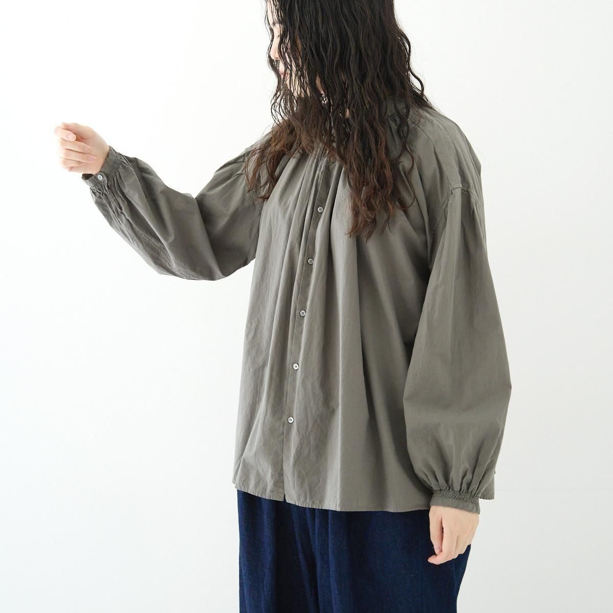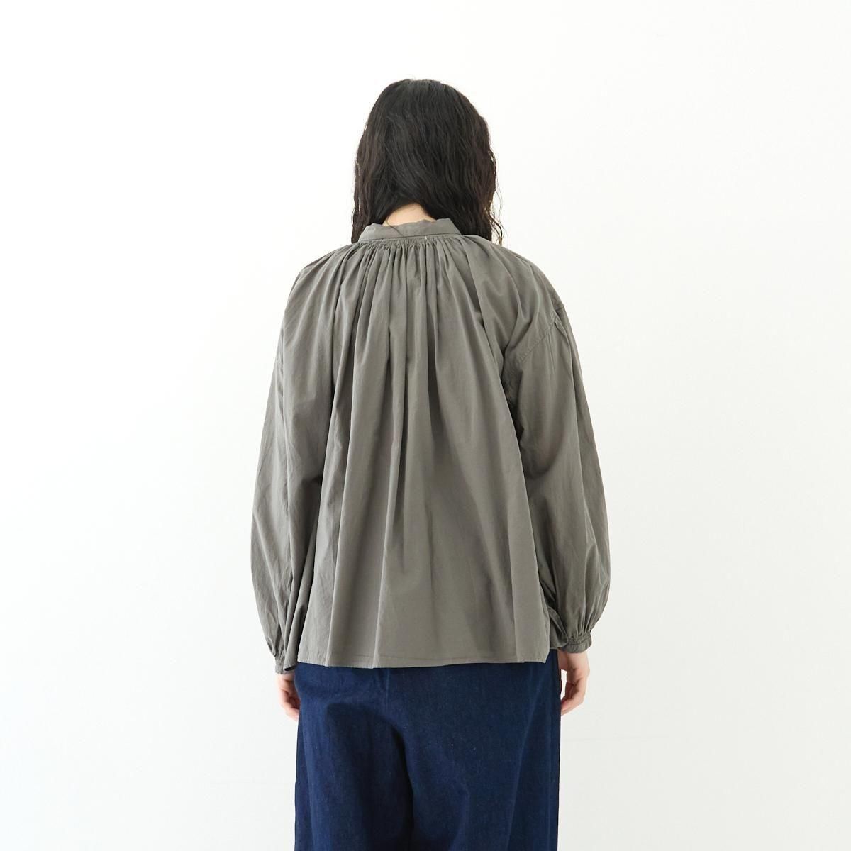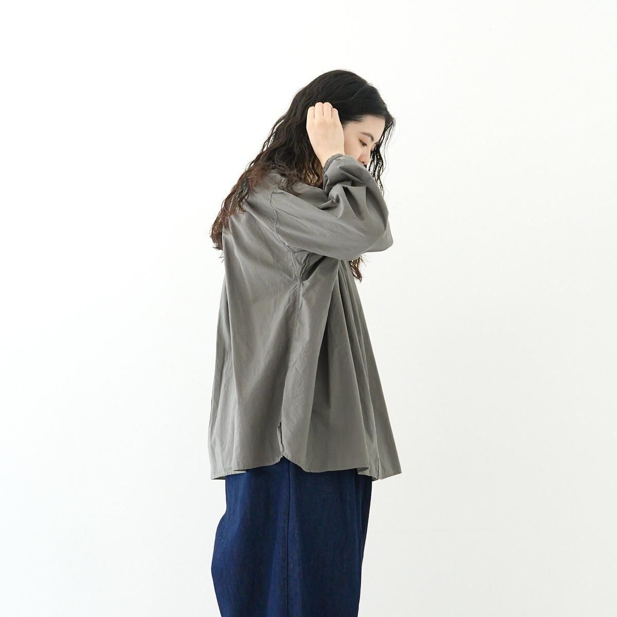 Veritecoeur定番のアンティークブラウス。 今季は細番手の糸で織られた柔らかなテキスタイルが登場しました。 衿ぐりと袖口にギャザーをたっぷり寄せた、ふんわりとしたシルエット。ガーゼのような薄手のコットンボイル生地は落ち感が美しく、着用した際にボリュームが出過ぎないのがポイントです。サイドのスリットもさりげないアクセントになっています。繊細なギャザーが作る、空気を含んだような優しい着心地が魅力の一枚です。 25AW size:F 着丈68cm/身幅71cm/肩幅56cm/袖丈71cm/袖口幅10.7cm/裾幅90cm ※サイズ計測の多少の誤差はご了承下さい。 material:cotton100% color:GRAY / WHITE お取り扱い店舗・・・dieci kyutaro店2F -------------------------------------------------------- Veritecoeur(ヴェリテクール) 真心という意味を込めて名付けたVeritecoeur。 素材の持つ魅力を活かし、着心地を大切にした、どこか人の手の温もりを感じるモノ作り。フォーマルからデイリーまで、ブランドらしさを失わない豊富なコレクション。 着て、洗ってを繰り返し、自分らしい愛着のある1枚へと育てて欲しい作り手の想い。 それぞれの暮らしを想い描きながら届ける、心豊かになれる日常着です。 size_chart