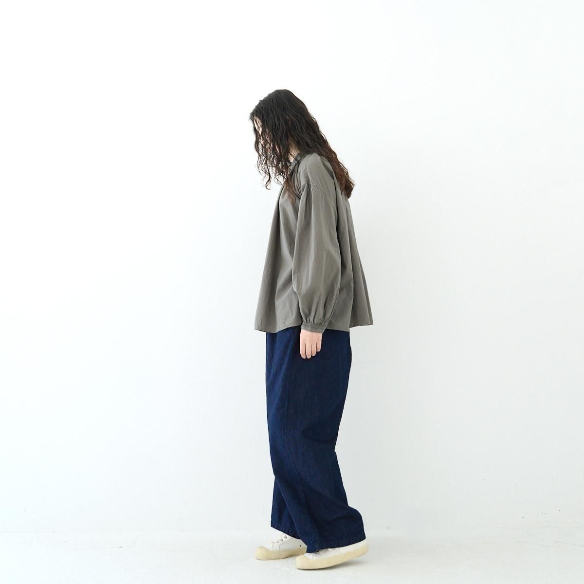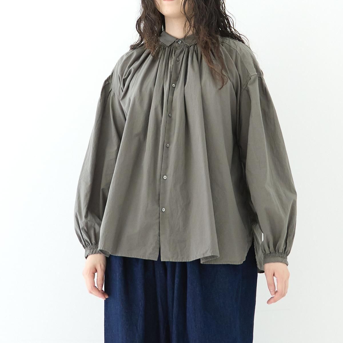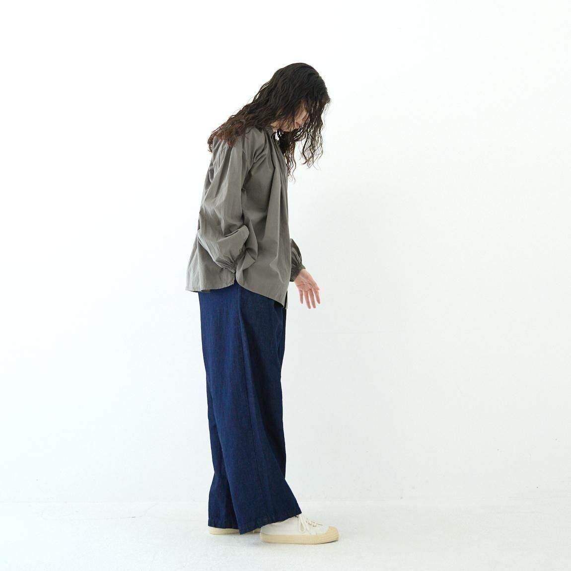 Veritecoeur定番のアンティークブラウス。 今季は細番手の糸で織られた柔らかなテキスタイルが登場しました。 衿ぐりと袖口にギャザーをたっぷり寄せた、ふんわりとしたシルエット。ガーゼのような薄手のコットンボイル生地は落ち感が美しく、着用した際にボリュームが出過ぎないのがポイントです。サイドのスリットもさりげないアクセントになっています。繊細なギャザーが作る、空気を含んだような優しい着心地が魅力の一枚です。 25AW size:F 着丈68cm/身幅71cm/肩幅56cm/袖丈71cm/袖口幅10.7cm/裾幅90cm ※サイズ計測の多少の誤差はご了承下さい。 material:cotton100% color:GRAY / WHITE お取り扱い店舗・・・dieci kyutaro店2F -------------------------------------------------------- Veritecoeur(ヴェリテクール) 真心という意味を込めて名付けたVeritecoeur。 素材の持つ魅力を活かし、着心地を大切にした、どこか人の手の温もりを感じるモノ作り。フォーマルからデイリーまで、ブランドらしさを失わない豊富なコレクション。 着て、洗ってを繰り返し、自分らしい愛着のある1枚へと育てて欲しい作り手の想い。 それぞれの暮らしを想い描きながら届ける、心豊かになれる日常着です。 size_chart