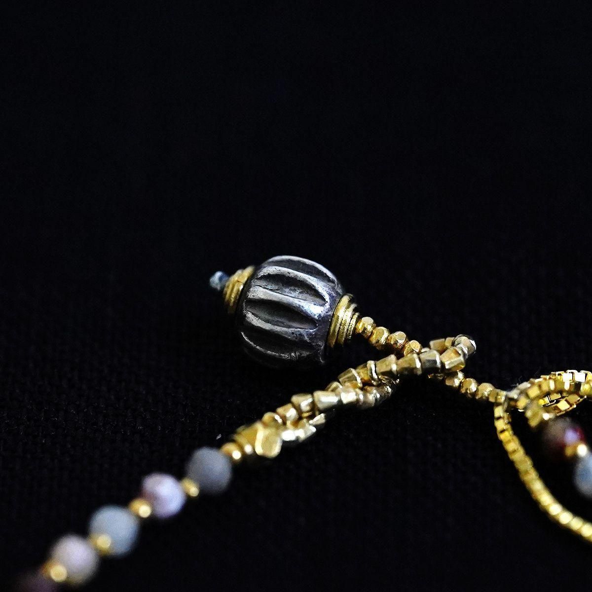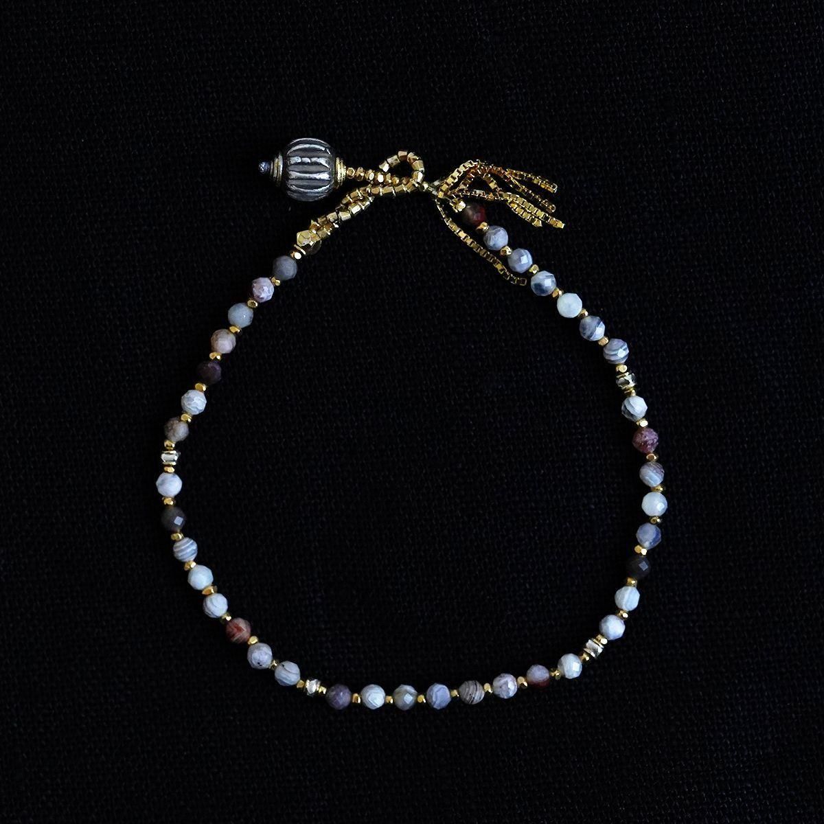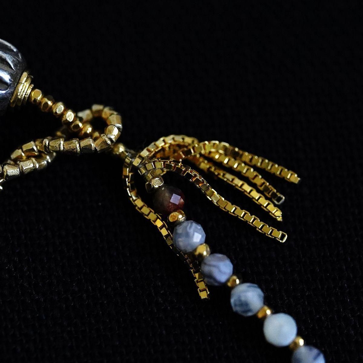 semeno24SSよりブレスレットのご紹介です。 19〜20世紀にインドやヨーロッパで作られた「種子」と呼ばれる小さなガラスのビーズを使って制作されるsemenoのアクセサリー。国籍や年代を越えて作られたアイテムは意外な程に様々なお洋服にはまってくれます。 25SS ◆gcb-01 ・ベースの石 アゲート 南米 現代 「和名はメノウと呼ばれます。細かな石英の結晶が集まった構造で、色合いや模様は様々、それぞれに個性があります。」 ・ストッパー(蜜柑型) オールドシルバー サハラ砂漠 1950年頃まで 「サハラ砂漠、アトラス山脈周辺に住むベルベル人系の部族によって作られたもの。」 ・金色のタッセル シルバー(金メッキ加工) 現代 ・その他 シルバー(金色部分は金メッキ加工) アジア 現代 *size(ベース部分の長さ):17cm お取り扱い店舗…dieci芝川ビル店 *留め部分のビーズを入れる輪は装着時にアクセサリーが外れる事を防止する為、自然に捩れる構造になっています。装着の際はよじれをほどくようにして輪を広げてからビーズを入れて下さい。 *semenoのアクセサリーはアンティークの石やガラスなどを使用しています。そのため、キズ・古色摩耗・カケ等がございます。アンティークの特性をご理解頂き、これらの持つ美しさ・風合いを感じて頂けたらと思います。 【ご購入につきまして】 semenoのアクセサリーのご注文は点数制限がございます。 シーズンごとにおひとりさま最多5点まで、 同一商品のご注文は3点までとなります。 制限を超えるご注文は弊社にてご注文数を調整、またはキャンセルさせていただく場合がございます。予めご了承くださいませ。