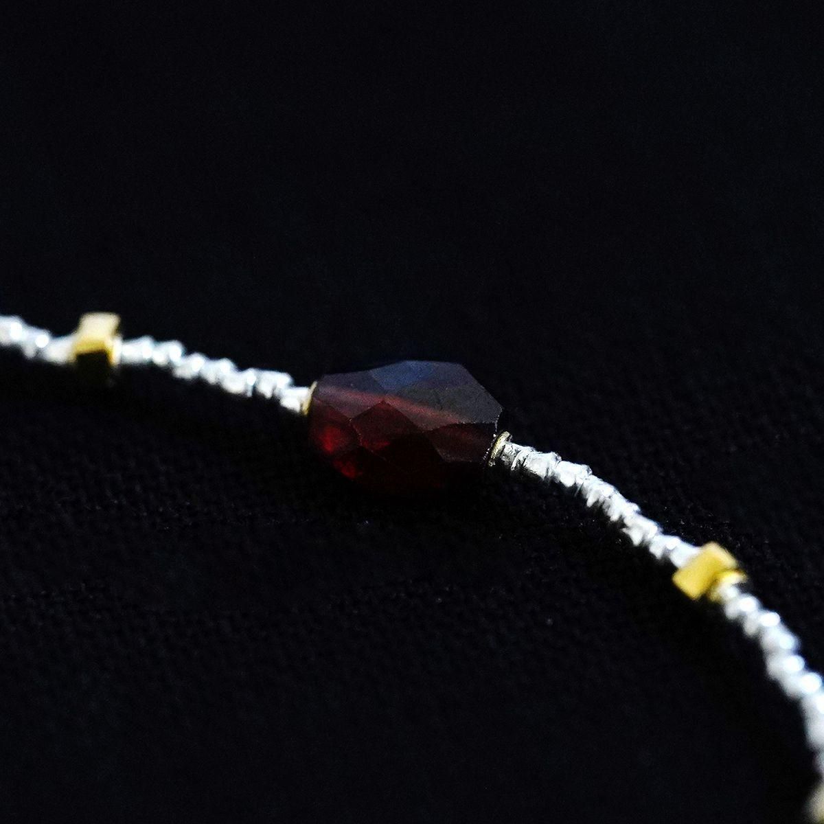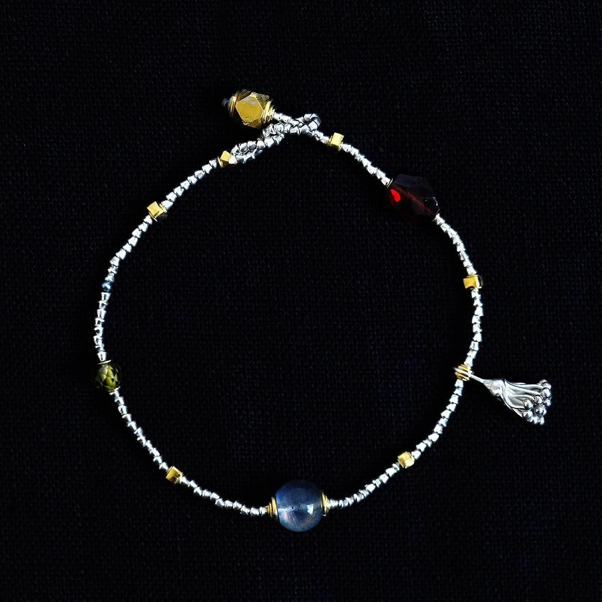 semeno24SSよりブレスレットのご紹介です。 19〜20世紀にインドやヨーロッパで作られた「種子」と呼ばれる小さなガラスのビーズを使って制作されるsemenoのアクセサリー。国籍や年代を越えて作られたアイテムは意外な程に様々なお洋服にはまってくれます。 25SS ◆gcb-06 ・灰色の石 ラブラドライト 現代 「角度や光の具合によって、青、黄、虹色の美しいシラー(光学効果)を見ることができます。」 ・緑色の石 ジルコン 現代 ・赤紫色の石 ガーネット アフリカ南部 現代 ・銀黒色(極小) 淡水パール(染色) 現代 ・花型のチャーム シルバー アジア 現代 ・ストッパー(14面体型) シルバー(金鍍金加工) アジア 現代 ・その他 シルバー(金色部分は金メッキ加工) アジア 現代 *size(ベース部分の長さ):17cm お取り扱い店舗…dieci芝川ビル店 *留め部分のビーズを入れる輪は装着時にアクセサリーが外れる事を防止する為、自然に捩れる構造になっています。装着の際はよじれをほどくようにして輪を広げてからビーズを入れて下さい。 *semenoのアクセサリーはアンティークの石やガラスなどを使用しています。そのため、キズ・古色摩耗・カケ等がございます。アンティークの特性をご理解頂き、これらの持つ美しさ・風合いを感じて頂けたらと思います。 【ご購入につきまして】 semenoのアクセサリーのご注文は点数制限がございます。 シーズンごとにおひとりさま最多5点まで、 同一商品のご注文は3点までとなります。 制限を超えるご注文は弊社にてご注文数を調整、またはキャンセルさせていただく場合がございます。予めご了承くださいませ。