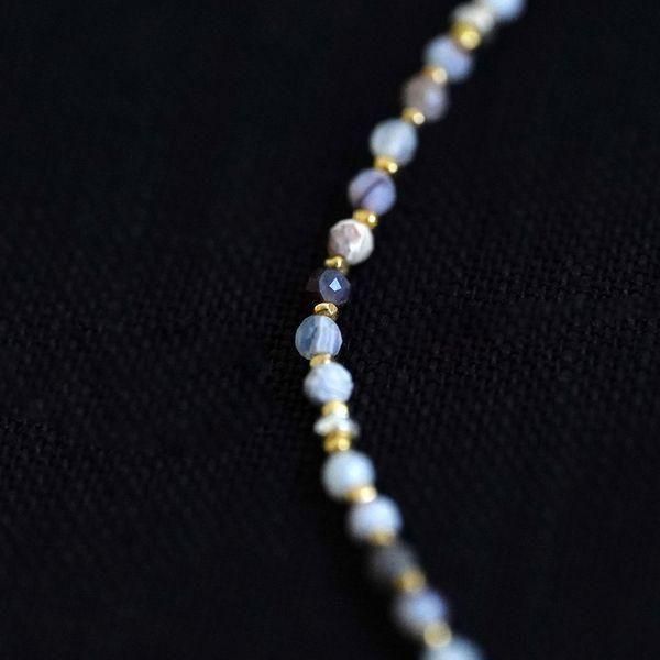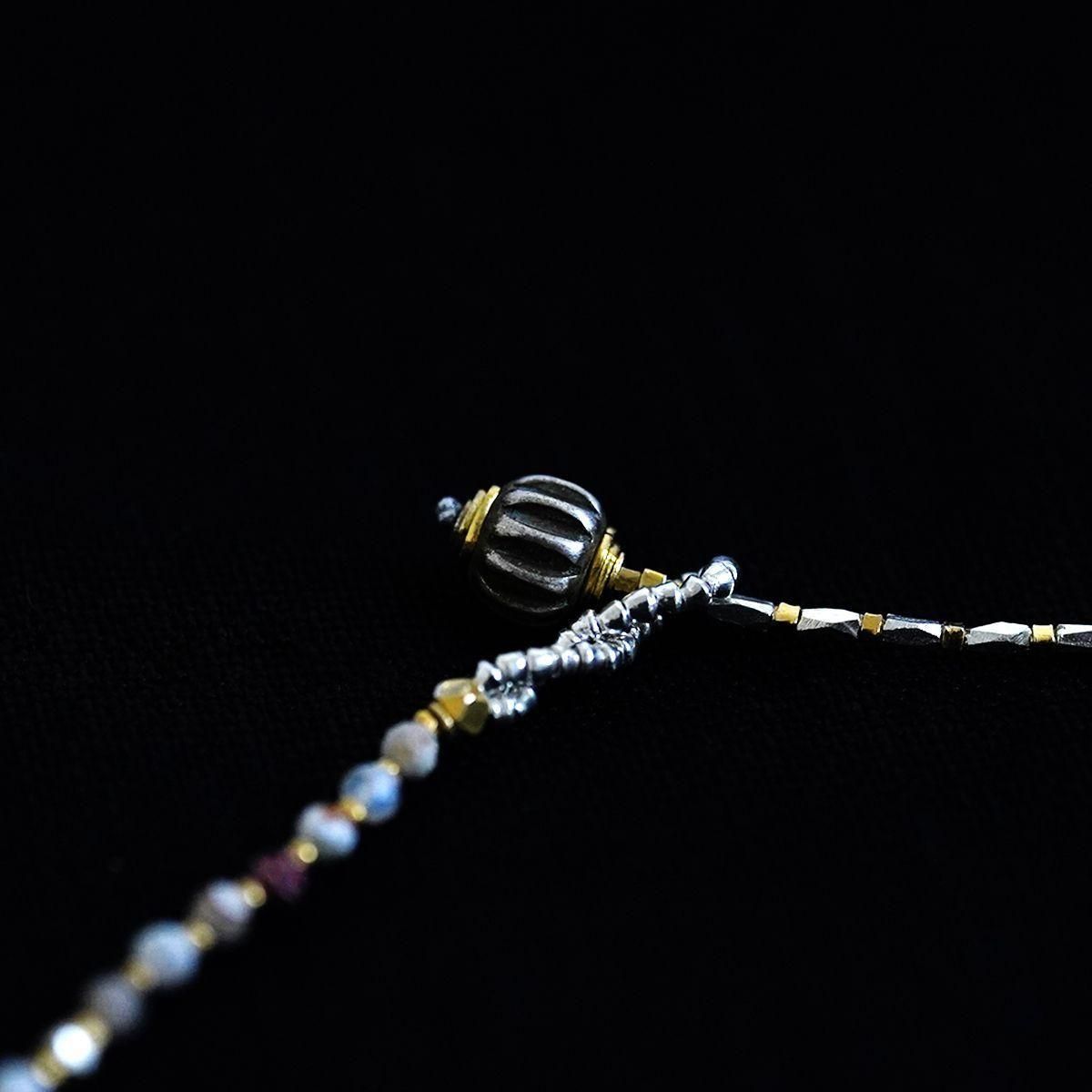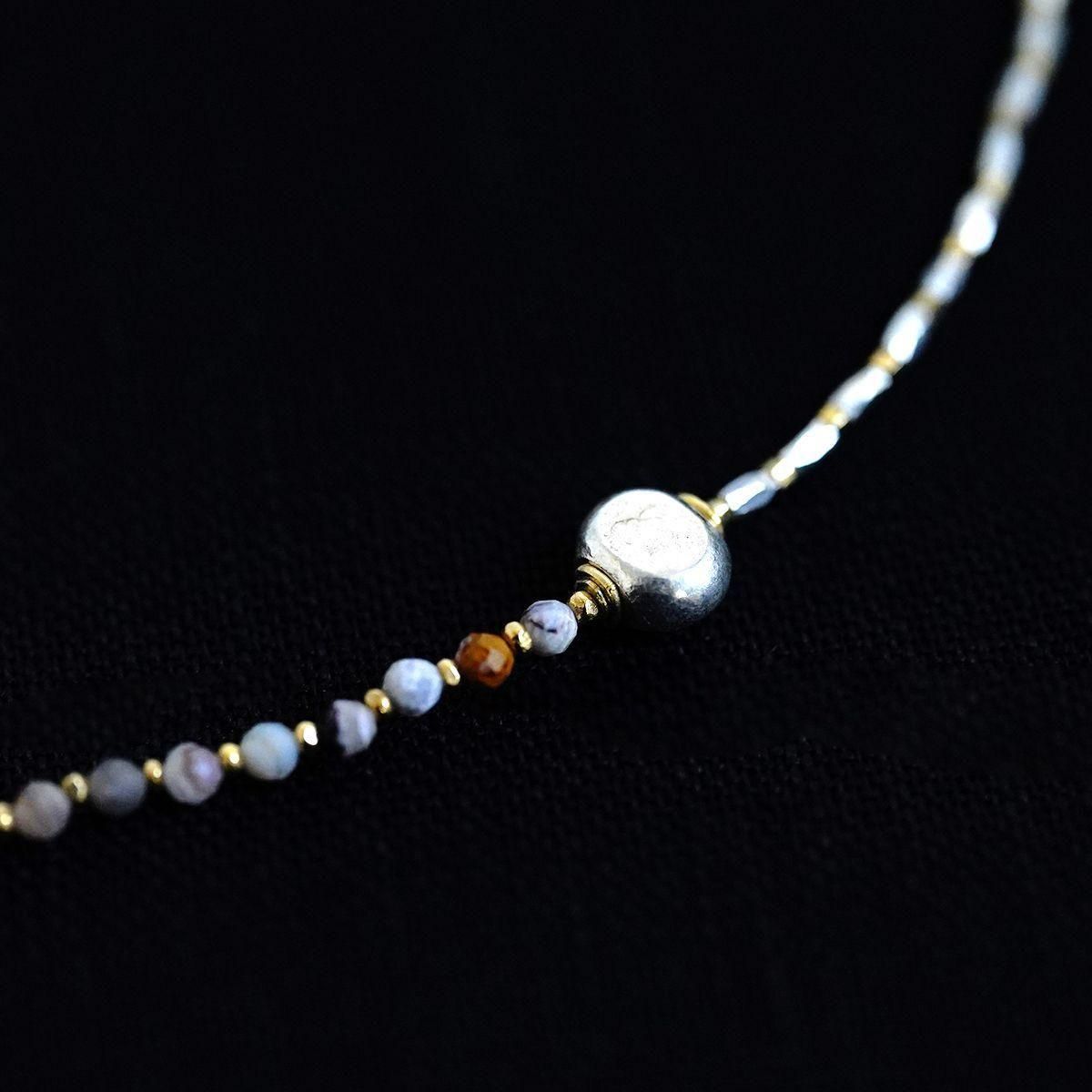 semeno24SSよりネックレスのご紹介です。 19〜20世紀にインドやヨーロッパで作られた「種子」と呼ばれる小さなシルバービーズなどを使って制作されるsemenoのアクセサリー。国籍や年代を越えて作られたアイテムは意外な程に様々なお洋服にはまってくれます。 25SS ◆gcn-01 ・ベースの石 アゲート 南米 現代 「和名はメノウと呼ばれます。細かな石英の結晶が集まった構造で、色合いや模様は様々、それぞれに個性があります。」 ・ストッパー(蜜柑型) オールドシルバー サハラ砂漠 1950年頃まで 「サハラ砂漠、アトラス山脈周辺に住むベルベル人系の部族によって作られたもの。」 ・その他 シルバー(金色部分は金鍍金加工) アジア 現代 *size(ベース部分の長さ):40cm お取り扱い店舗…dieci芝川ビル店 *留め部分のビーズを入れる輪は装着時にアクセサリーが外れる事を防止する為、自然に捩れる構造になっています。装着の際はよじれをほどくようにして輪を広げてからビーズを入れて下さい。 *semenoのアクセサリーはアンティークの石やガラスなどを使用しています。そのため、キズ・古色摩耗・カケ等がございます。アンティークの特性をご理解頂き、これらの持つ美しさ・風合いを感じて頂けたらと思います。 【ご購入につきまして】 semenoのアクセサリーのご注文は点数制限がございます。 シーズンごとにおひとりさま最多5点まで、 同一商品のご注文は3点までとなります。 制限を超えるご注文は弊社にてご注文数を調整、またはキャンセルさせていただく場合がございます。予めご了承くださいませ。