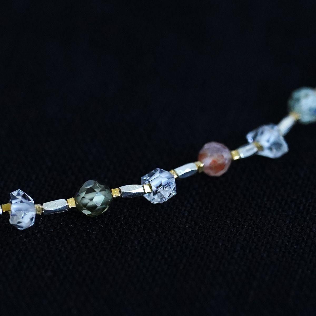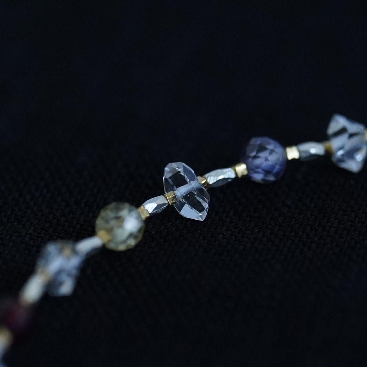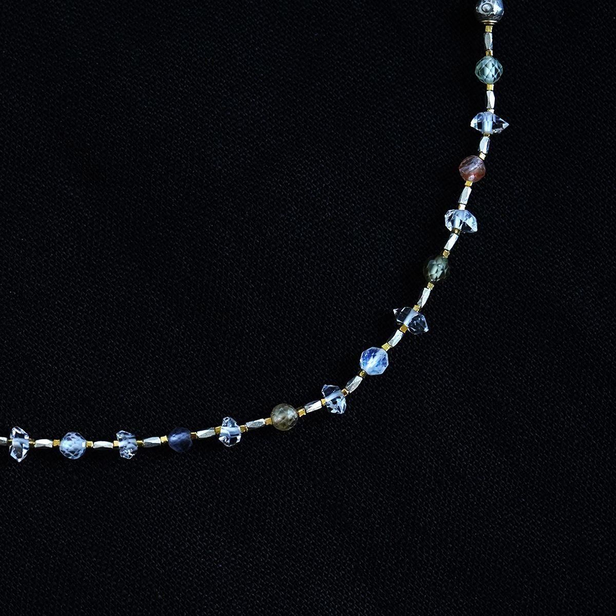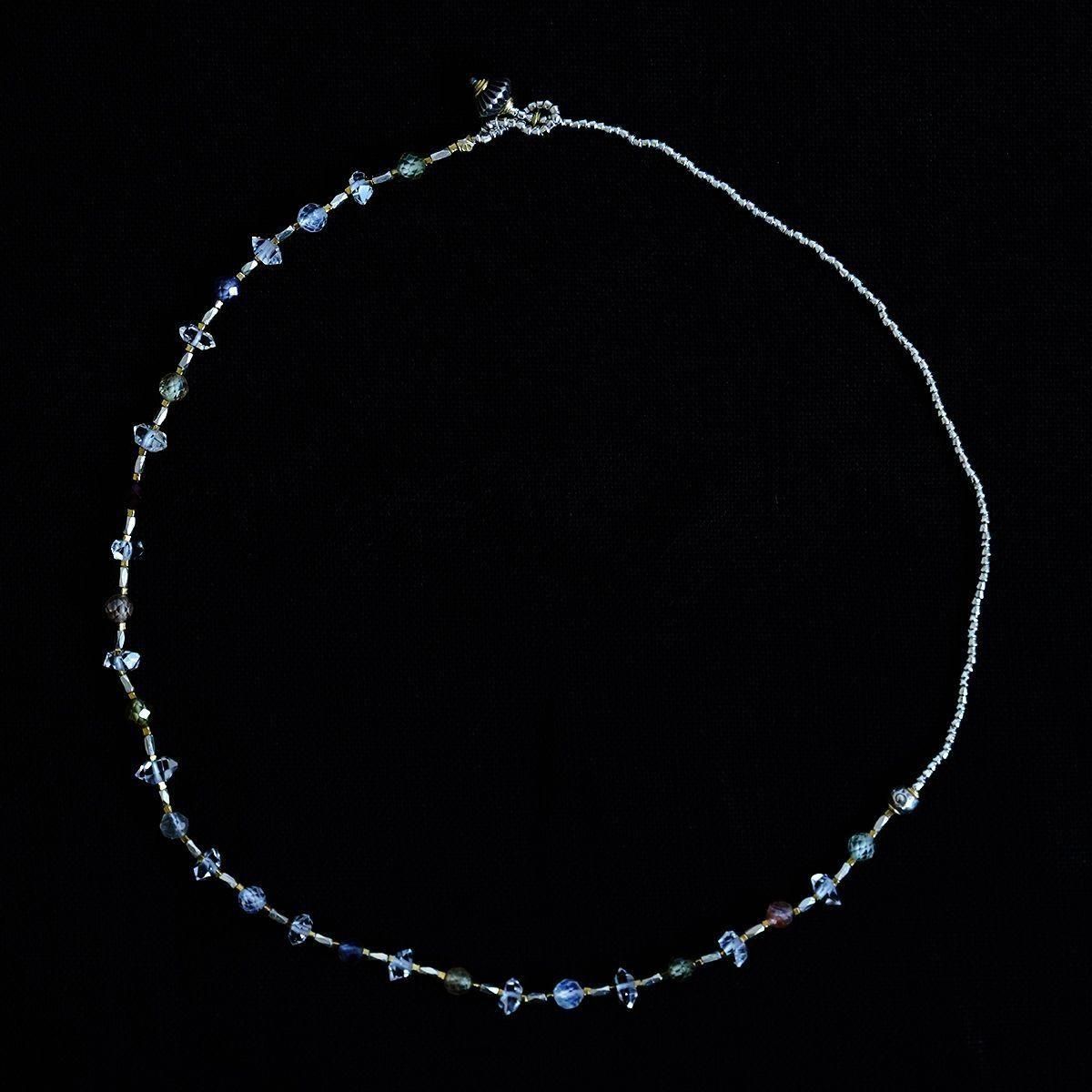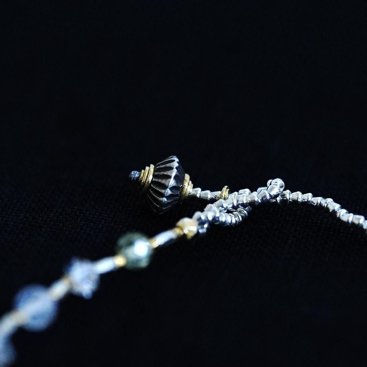 semeno24SSよりネックレスのご紹介です。 19〜20世紀にインドやヨーロッパで作られた「種子」と呼ばれる小さなシルバービーズなどを使って制作されるsemenoのアクセサリー。国籍や年代を越えて作られたアイテムは意外な程に様々なお洋服にはまってくれます。 25SS ◆gcn-02 ・マルチカラーの石 天然石のミックス 現代 「ジルコン、キュービックジルコニア、レインボームーンストーン、アイオライト、ルチルクォーツ、ガーネットのミックス。色合いには個体差がございます。」 ・無色透明 ダイヤモンドクォーツ(水晶) 現代 「結晶化した自然のままの形状。透明度の高い、両剣、両錘型の水晶です。」 ・ストッパー(ソロバン型) オールドシルバー サハラ砂漠 1950年頃まで 「サハラ砂漠、アトラス山脈周辺に住むベルベル人系の部族によって作られたもの。」 ・その他 シルバー(金色部分は金メッキ加工) アジア 現代 *size(ベース部分の長さ):40cm お取り扱い店舗…dieci芝川ビル店 *留め部分のビーズを入れる輪は装着時にアクセサリーが外れる事を防止する為、自然に捩れる構造になっています。装着の際はよじれをほどくようにして輪を広げてからビーズを入れて下さい。 *semenoのアクセサリーはアンティークの石やガラスなどを使用しています。そのため、キズ・古色摩耗・カケ等がございます。アンティークの特性をご理解頂き、これらの持つ美しさ・風合いを感じて頂けたらと思います。 【ご購入につきまして】 semenoのアクセサリーのご注文は点数制限がございます。 シーズンごとにおひとりさま最多5点まで、 同一商品のご注文は3点までとなります。 制限を超えるご注文は弊社にてご注文数を調整、またはキャンセルさせていただく場合がございます。予めご了承くださいませ。