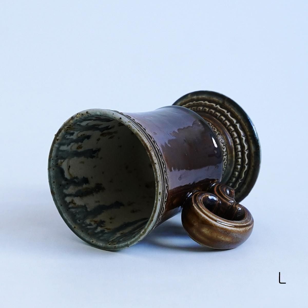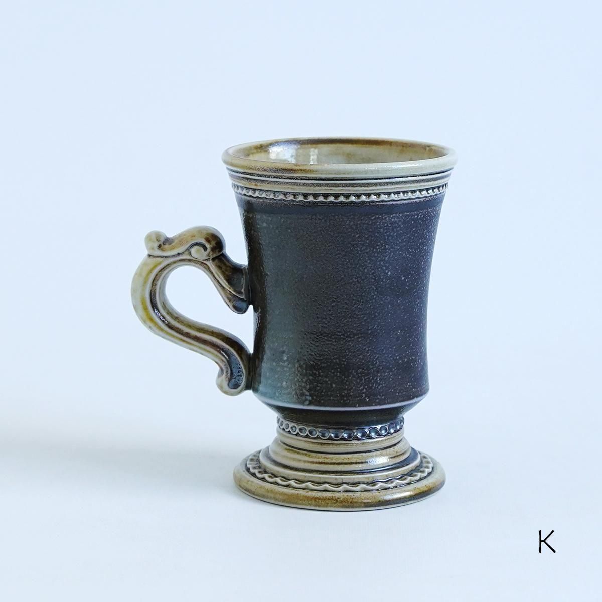 伊藤丈浩(いとうたけひろ)さんは千葉県、銚子生まれ。21歳ごろから焼き物を始め、益子の製陶所で勤めた後、渡米。各地の陶芸家を訪ねながら旅をされました。2006年に益子で独立。スリップウェアを中心に出来る限り地域の原料を使い、新たな益子焼を提案されています。 こちらはソーダ釉を施したマグ。熱湯で溶かした重曹(ソーダ)を窯に投入することで独特の斑模様と艶を楽しむ事が出来ます。ひとつひとつハンドルや色目が違う1点ものです。ギフトにもピッタリです。 作品ごとに個性が違うので1つ持っている方でも何点も集めたくなる商品です。 size: J:約飲み口Φ8.3cmH11.8cmW7.7cm(持ち手込み12.8cm) K:約飲み口Φ8.3cmH12.5cmW8cm(持ち手込み12cm) L:約飲み口Φ8.3cmH12cmW8cm(持ち手込み11.5cm) ※おおよそのサイズです 取り扱い店舗:dieci天神橋店 ※使い始めは一晩に水につけてからご使用ください。 ※ご使用後は食器用洗剤で洗い、良く乾燥させてください。 食器洗浄機はご利用頂けますが、器どうしがぶつかって破損する可能性がございます。ご使用の際はご注意ください。