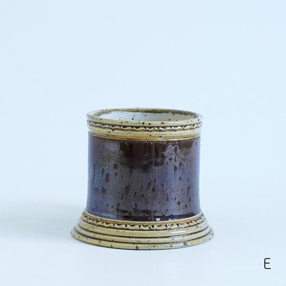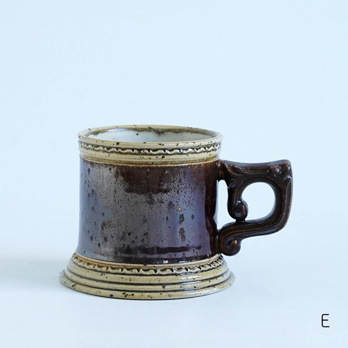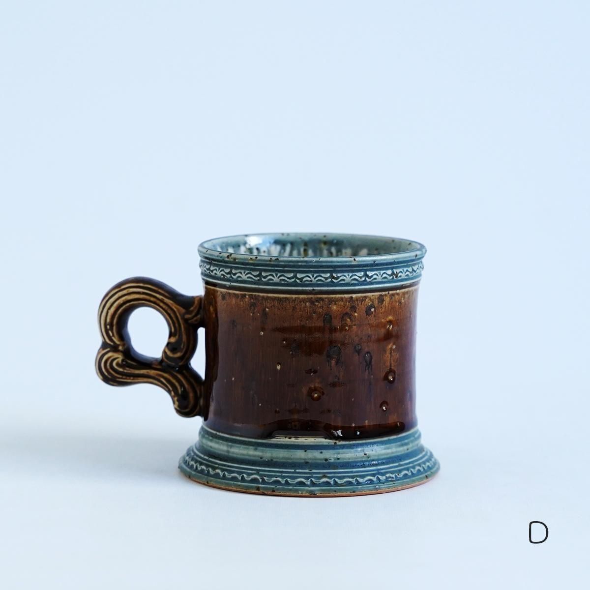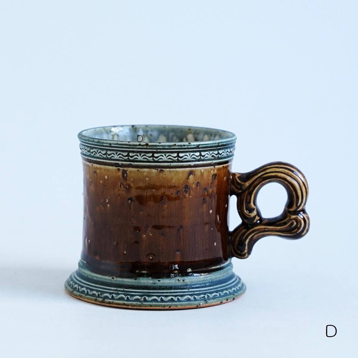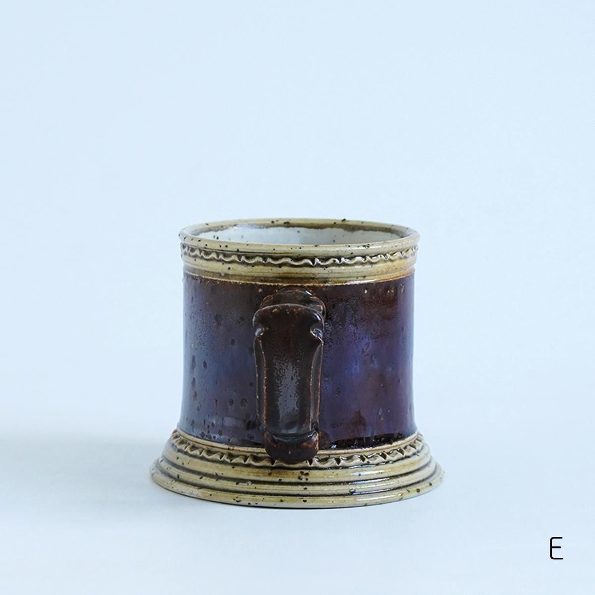 伊藤丈浩(いとうたけひろ)さんは千葉県、銚子生まれ。21歳ごろから焼き物を始め、益子の製陶所で勤めた後、渡米。各地の陶芸家を訪ねながら旅をされました。2006年に益子で独立。スリップウェアを中心に出来る限り地域の原料を使い、新たな益子焼を提案されています。 こちらはソーダ釉を施したマグ。熱湯で溶かした重曹(ソーダ)を窯に投入することで独特の斑模様と艶を楽しむ事が出来ます。ひとつひとつハンドルや色目が違う1点ものです。ギフトにもピッタリです。 作品ごとに個性が違うので1つ持っている方でも何点も集めたくなる商品です。 size: D:約飲み口Φ8.4cmH9.4cmW10.8cm(持ち手込み14.3cm) E:約飲み口Φ8.8cmH9.3cmW10.8cm(持ち手込み14.5cm) F:約飲み口Φ8.5cmH9.3cmW10.8cm(持ち手込み14cm) ※おおよそのサイズです 取り扱い店舗:dieci天神橋店 ※使い始めは一晩に水につけてからご使用ください。 ※ご使用後は食器用洗剤で洗い、良く乾燥させてください。 食器洗浄機はご利用頂けますが、器どうしがぶつかって破損する可能性がございます。ご使用の際はご注意ください。
