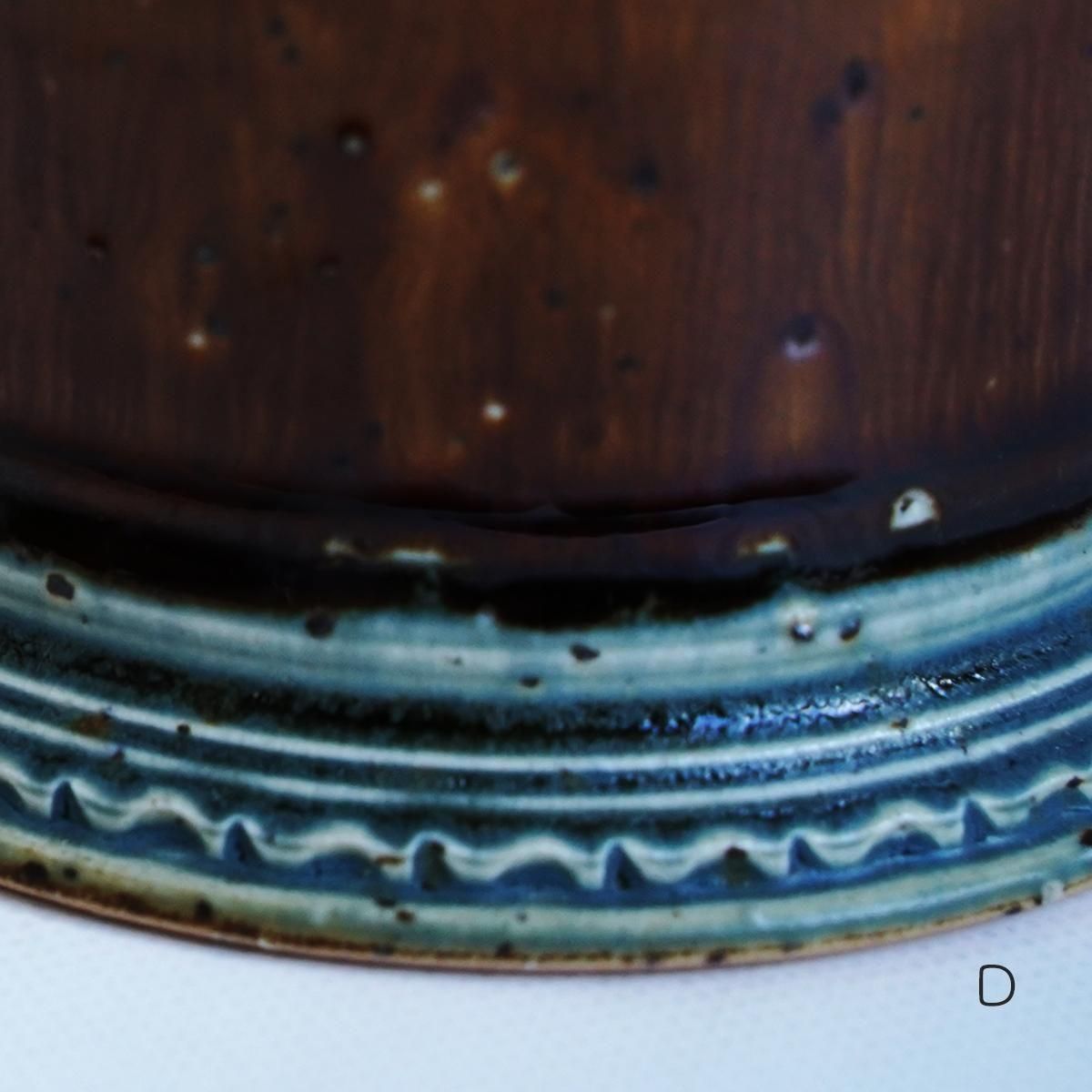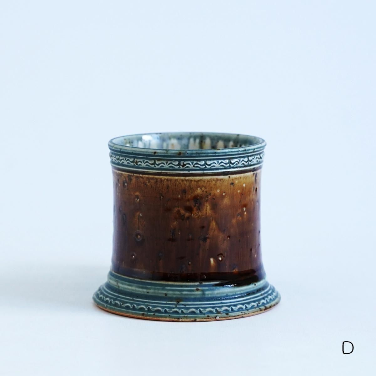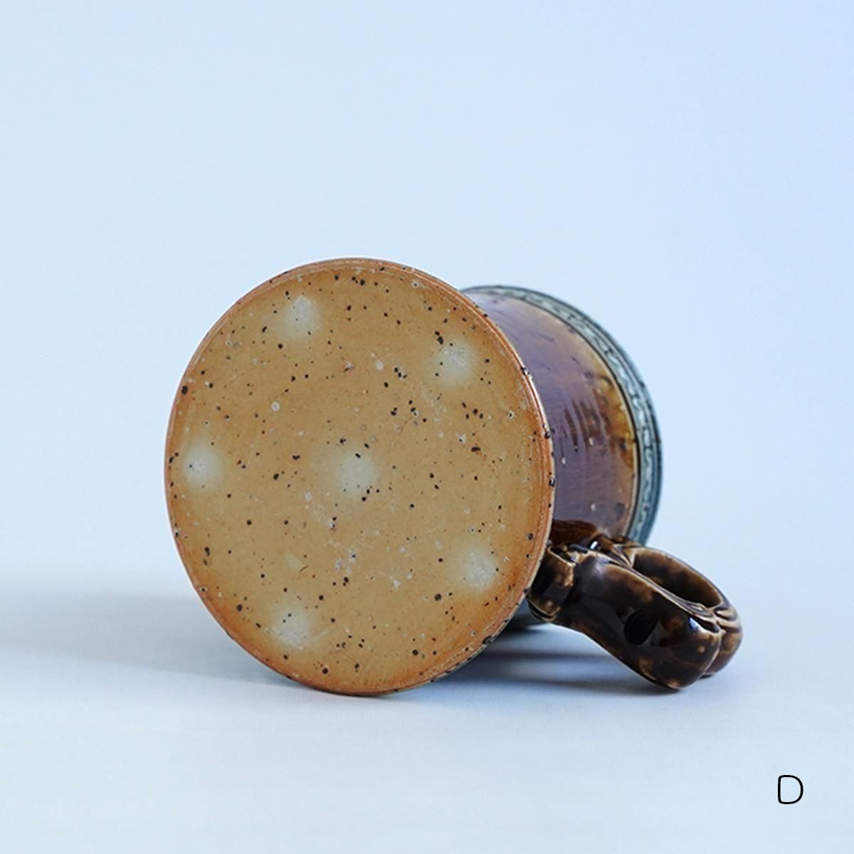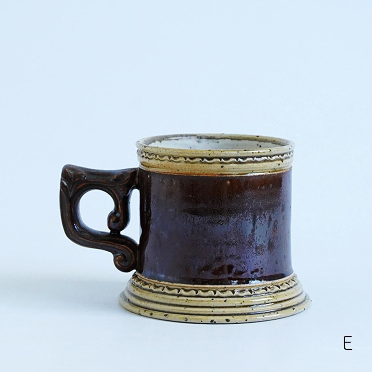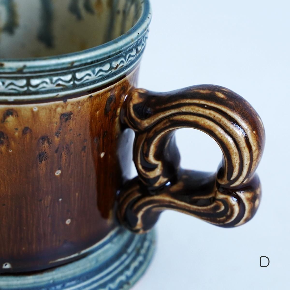 伊藤丈浩(いとうたけひろ)さんは千葉県、銚子生まれ。21歳ごろから焼き物を始め、益子の製陶所で勤めた後、渡米。各地の陶芸家を訪ねながら旅をされました。2006年に益子で独立。スリップウェアを中心に出来る限り地域の原料を使い、新たな益子焼を提案されています。 こちらはソーダ釉を施したマグ。熱湯で溶かした重曹(ソーダ)を窯に投入することで独特の斑模様と艶を楽しむ事が出来ます。ひとつひとつハンドルや色目が違う1点ものです。ギフトにもピッタリです。 作品ごとに個性が違うので1つ持っている方でも何点も集めたくなる商品です。 size: D:約飲み口Φ8.4cmH9.4cmW10.8cm(持ち手込み14.3cm) E:約飲み口Φ8.8cmH9.3cmW10.8cm(持ち手込み14.5cm) F:約飲み口Φ8.5cmH9.3cmW10.8cm(持ち手込み14cm) ※おおよそのサイズです 取り扱い店舗:dieci天神橋店 ※使い始めは一晩に水につけてからご使用ください。 ※ご使用後は食器用洗剤で洗い、良く乾燥させてください。 食器洗浄機はご利用頂けますが、器どうしがぶつかって破損する可能性がございます。ご使用の際はご注意ください。