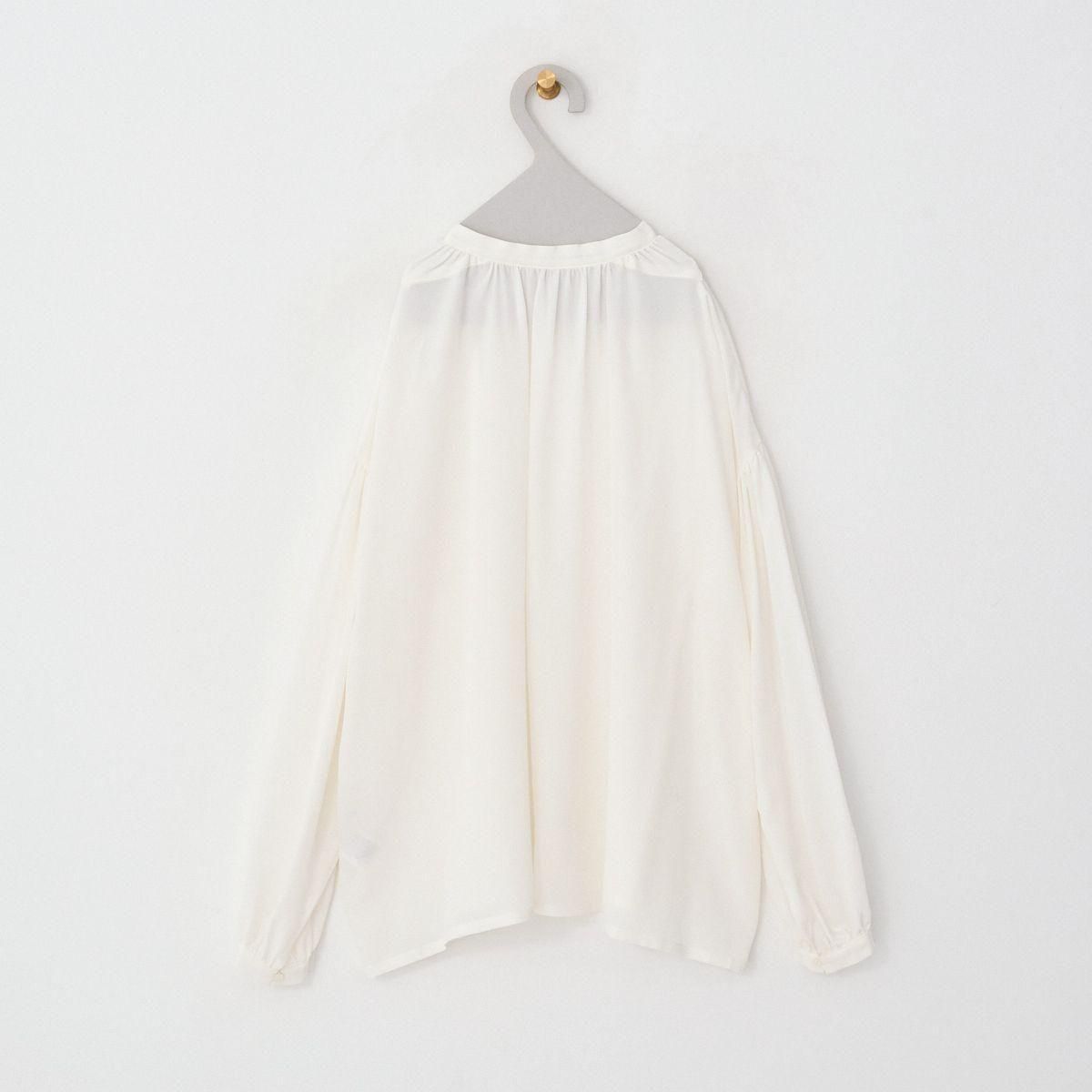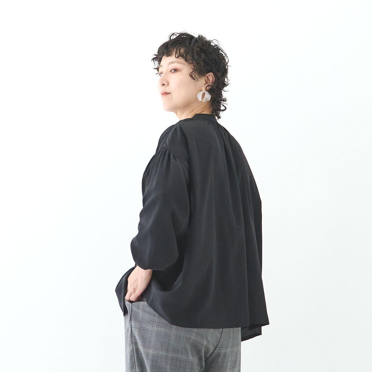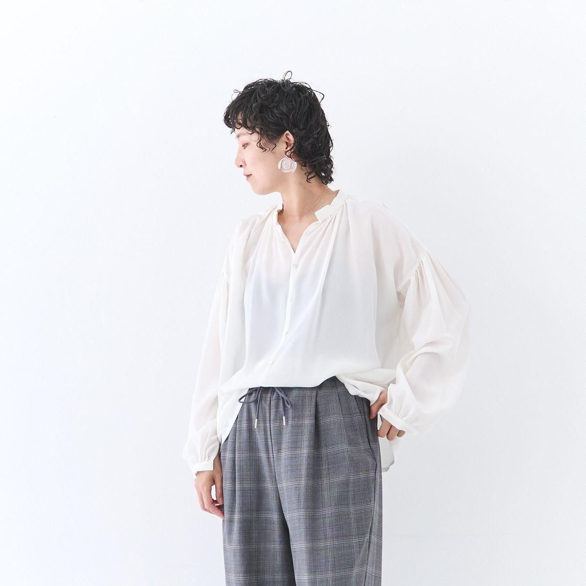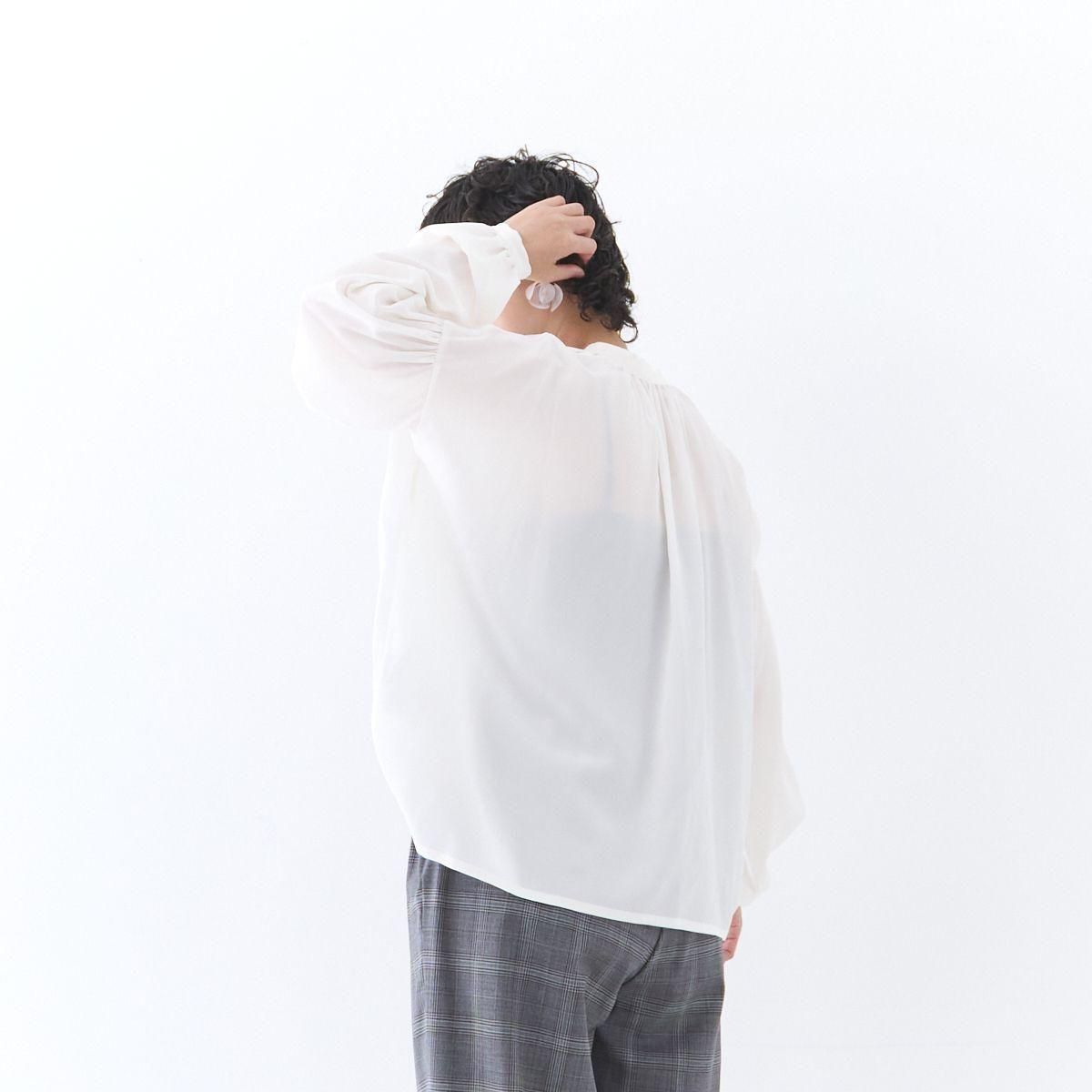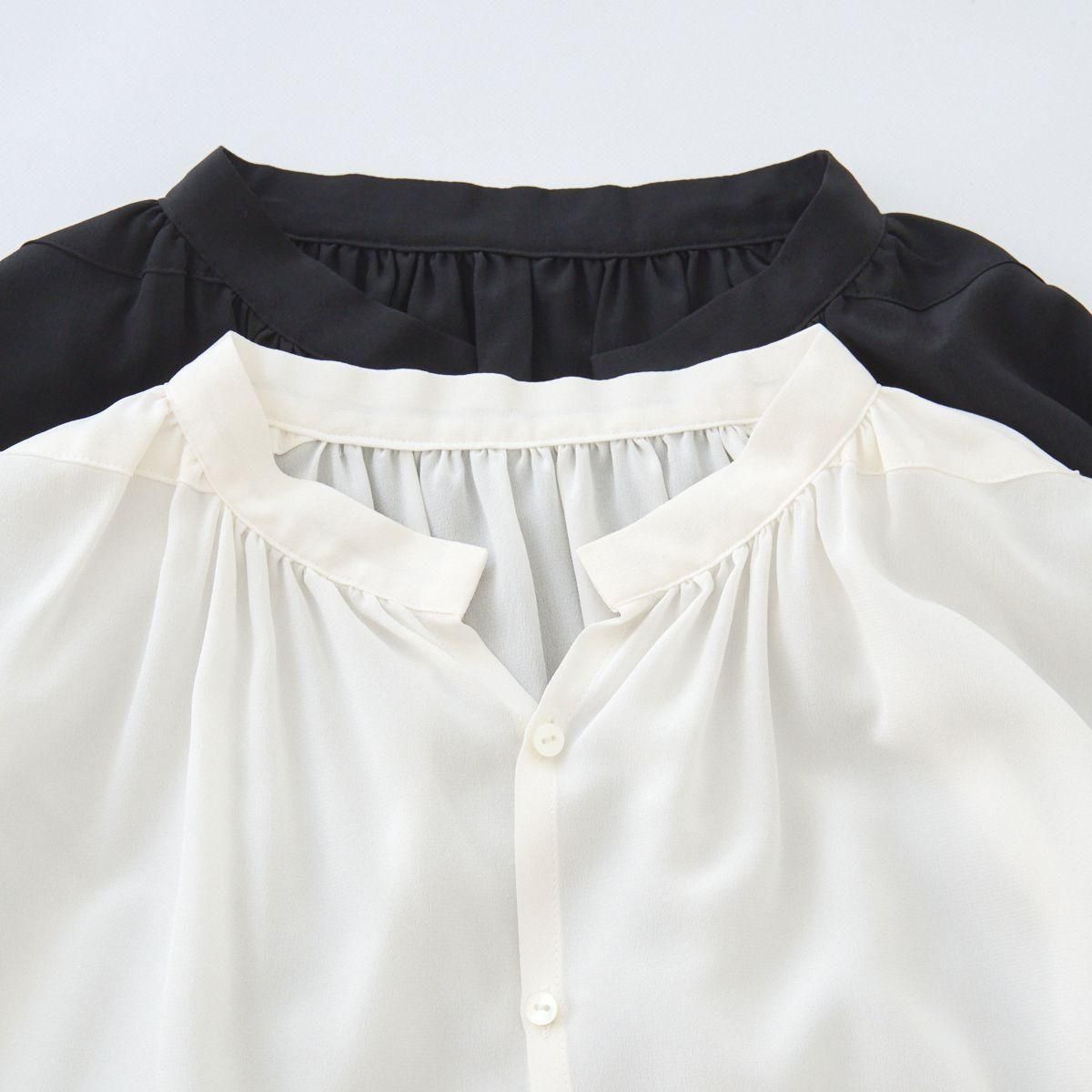 humoresque(ユーモレスク)は、デザイナー 渡辺由夏さんの「ちょうど良い糸を、ちょうど良い形で編んでみたい。」との想いから2012年の秋冬シーズンにニットを中心とした衣服ブランドをスタートし、シルクなど布帛アイテムの展開にも力を入れています。 繊細なシルクデシンを使った柔らかなギャザーブラウス。 襟元やアームにたっぷりとギャザーを寄せ、膨らみのあるフォルムに仕上げたhumoresqueの不動の人気のブラウスです。 暖かい季節には1枚で、 寒くなったらニットから小さな立ち襟を覗かせても。 肌触りが良く、保湿、保温に優れているシルク100%のブラウスは季節を問わず着用していただけます。(humoredque引用) size: F 身幅75cm 着丈63cm 裄丈80cm color: white,black material: silk100% 手洗可 ※天然素材を使用しておりますため、織ムラやかすれ、フシやヨレによる不均一さ、 小さなほつれなどがある場合や、画像の色味や風合いと異なる場合もございます。 デリケートな素材もございますので、引っ掛けやひきつれにはご注意ください。 素材によって仕上がりに個体差が出ること、サイズ感、色、風合いについての特徴を、 天然素材ならではの良さとしてご理解の上、ご購入くださいますようお願いします。 シルクは直射日光により黄変しやすいため、陰干ししてください。 シルク糸が痩せてくるため、優しく手洗い、またはドライクリーニングをおすすめします。 model: 163cm お取り扱い店舗・・・dieci芝川ビル店 size_chart