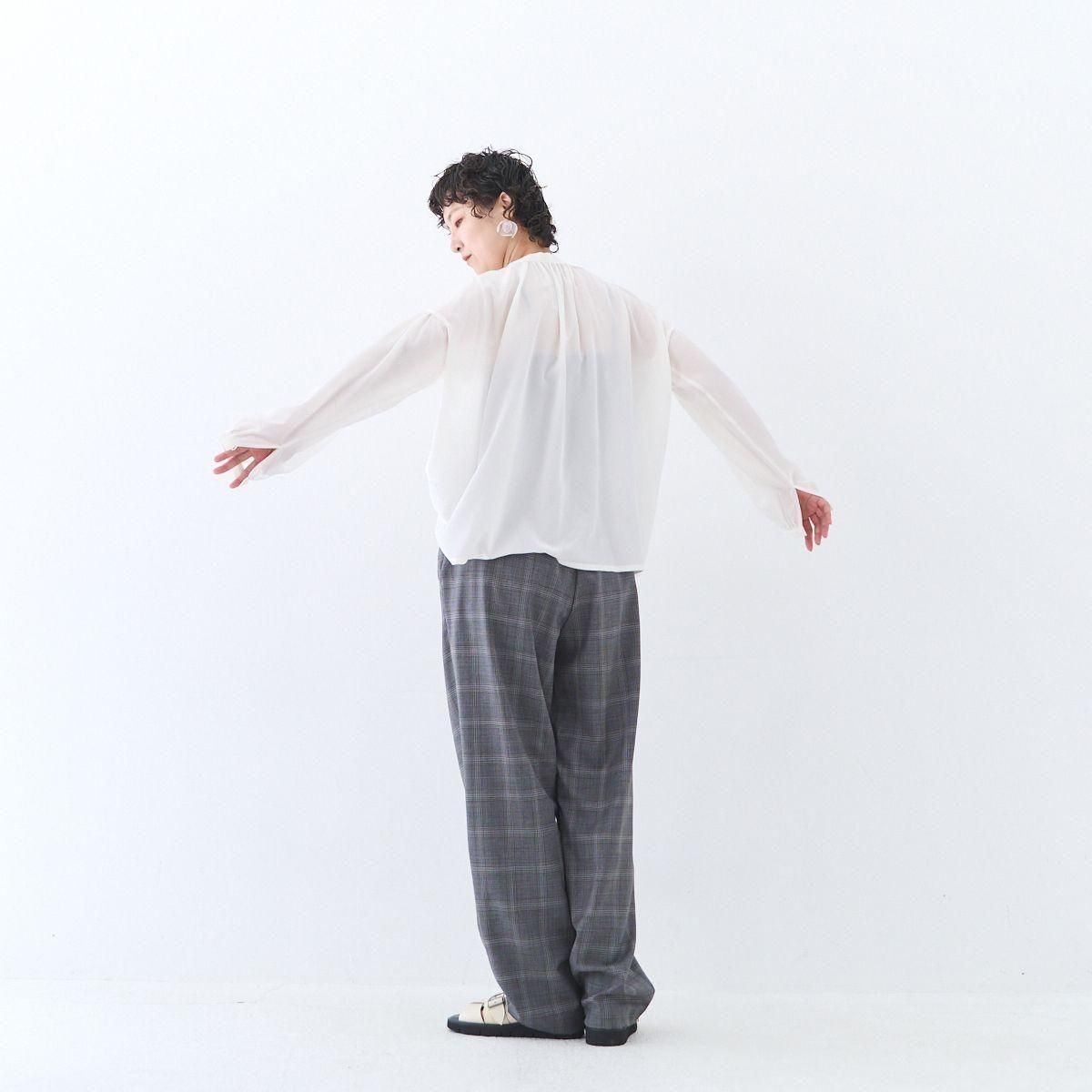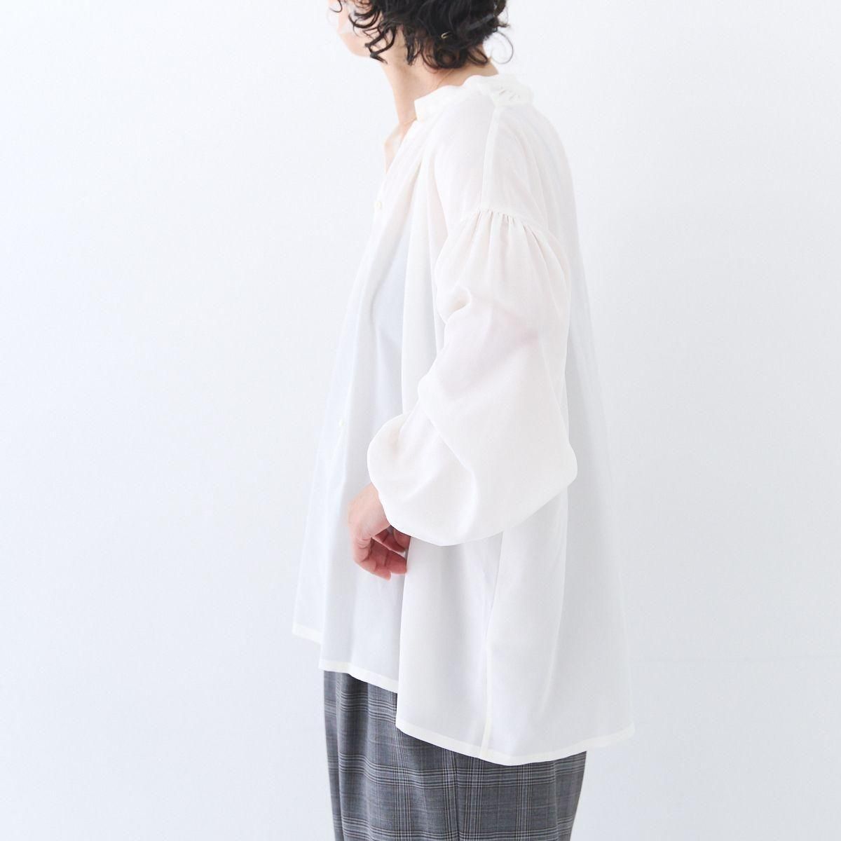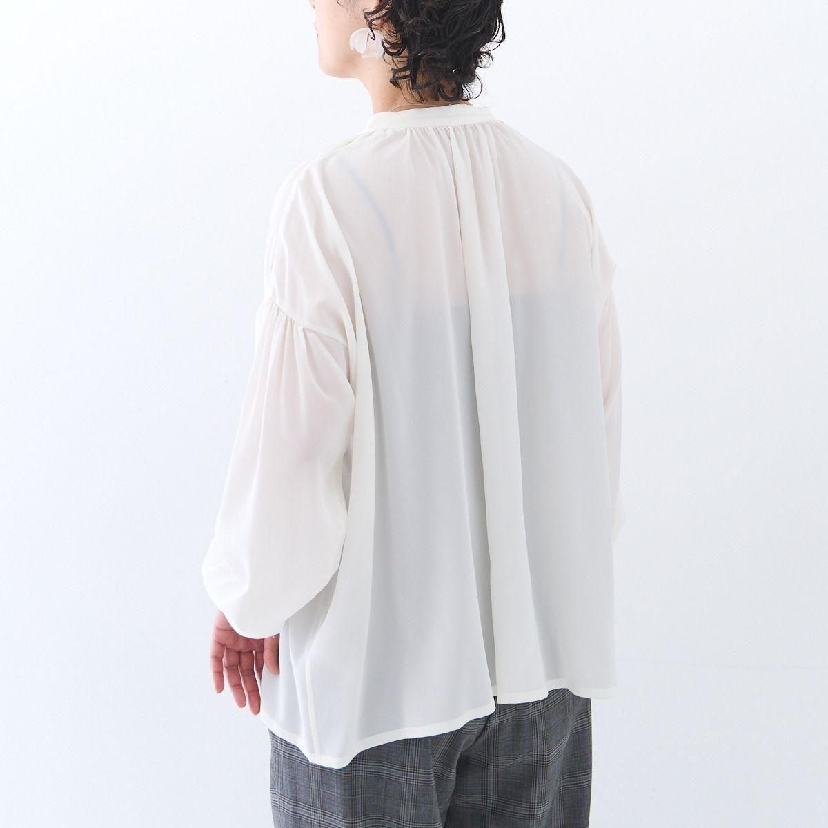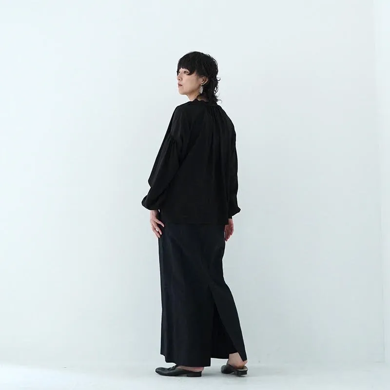 humoresque(ユーモレスク)は、デザイナー 渡辺由夏さんの「ちょうど良い糸を、ちょうど良い形で編んでみたい。」との想いから2012年の秋冬シーズンにニットを中心とした衣服ブランドをスタートし、シルクなど布帛アイテムの展開にも力を入れています。 繊細なシルクデシンを使った柔らかなギャザーブラウス。 襟元やアームにたっぷりとギャザーを寄せ、膨らみのあるフォルムに仕上げたhumoresqueの不動の人気のブラウスです。 暖かい季節には1枚で、 寒くなったらニットから小さな立ち襟を覗かせても。 肌触りが良く、保湿、保温に優れているシルク100%のブラウスは季節を問わず着用していただけます。(humoredque引用) size: F 身幅75cm 着丈63cm 裄丈80cm color: white,black material: silk100% 手洗可 ※天然素材を使用しておりますため、織ムラやかすれ、フシやヨレによる不均一さ、 小さなほつれなどがある場合や、画像の色味や風合いと異なる場合もございます。 デリケートな素材もございますので、引っ掛けやひきつれにはご注意ください。 素材によって仕上がりに個体差が出ること、サイズ感、色、風合いについての特徴を、 天然素材ならではの良さとしてご理解の上、ご購入くださいますようお願いします。 シルクは直射日光により黄変しやすいため、陰干ししてください。 シルク糸が痩せてくるため、優しく手洗い、またはドライクリーニングをおすすめします。 model: 163cm お取り扱い店舗・・・dieci芝川ビル店 size_chart