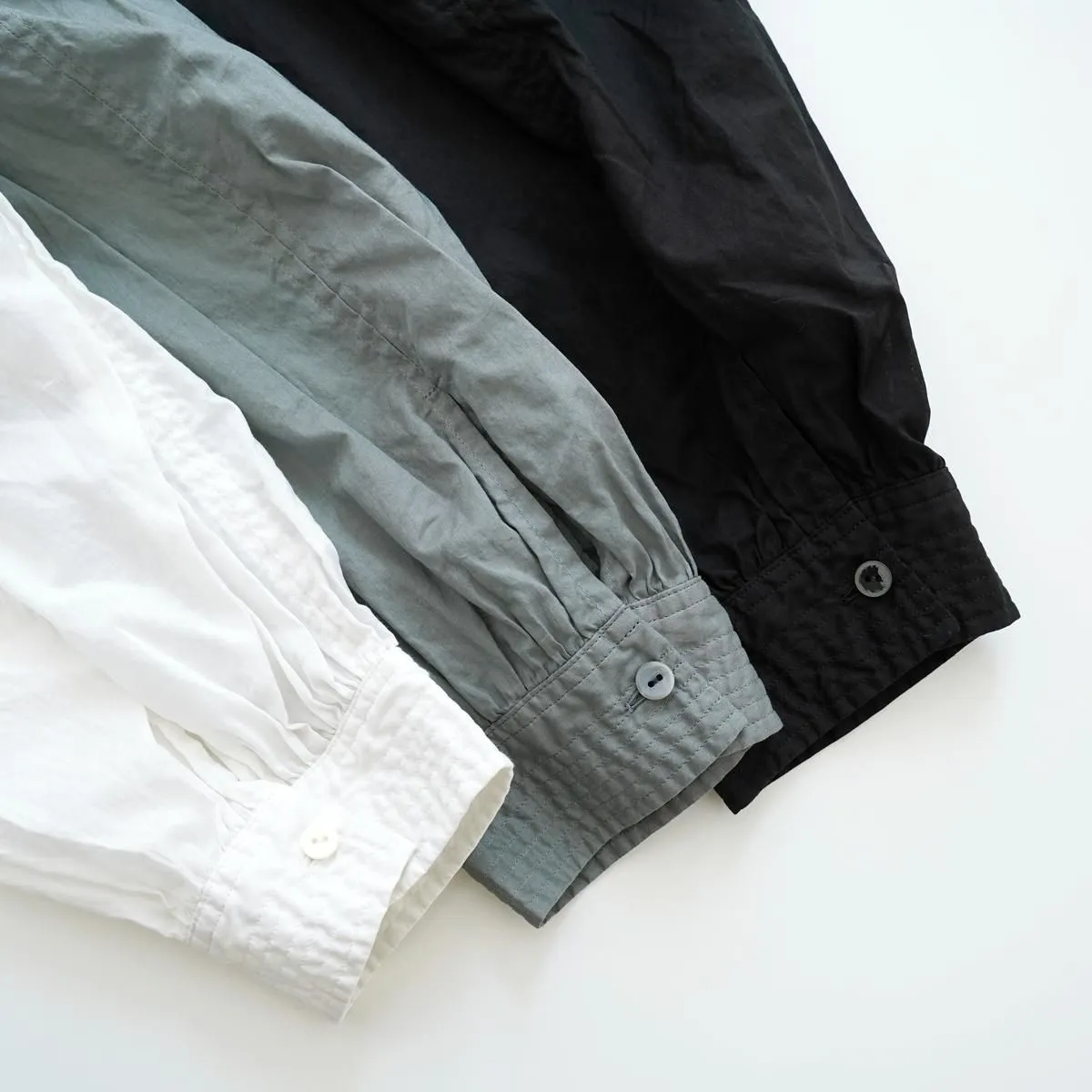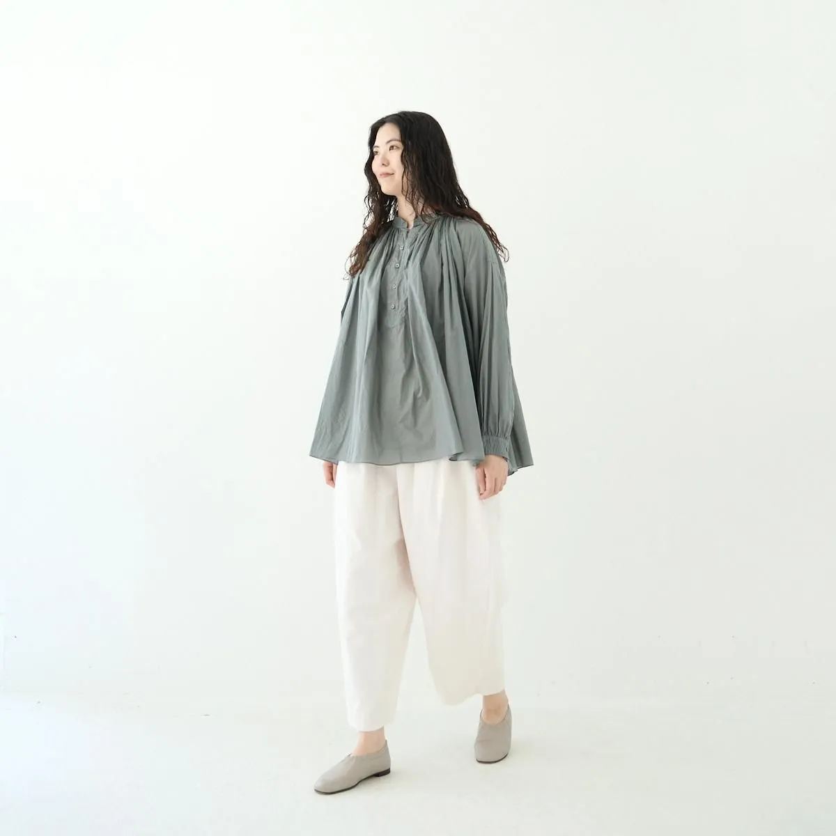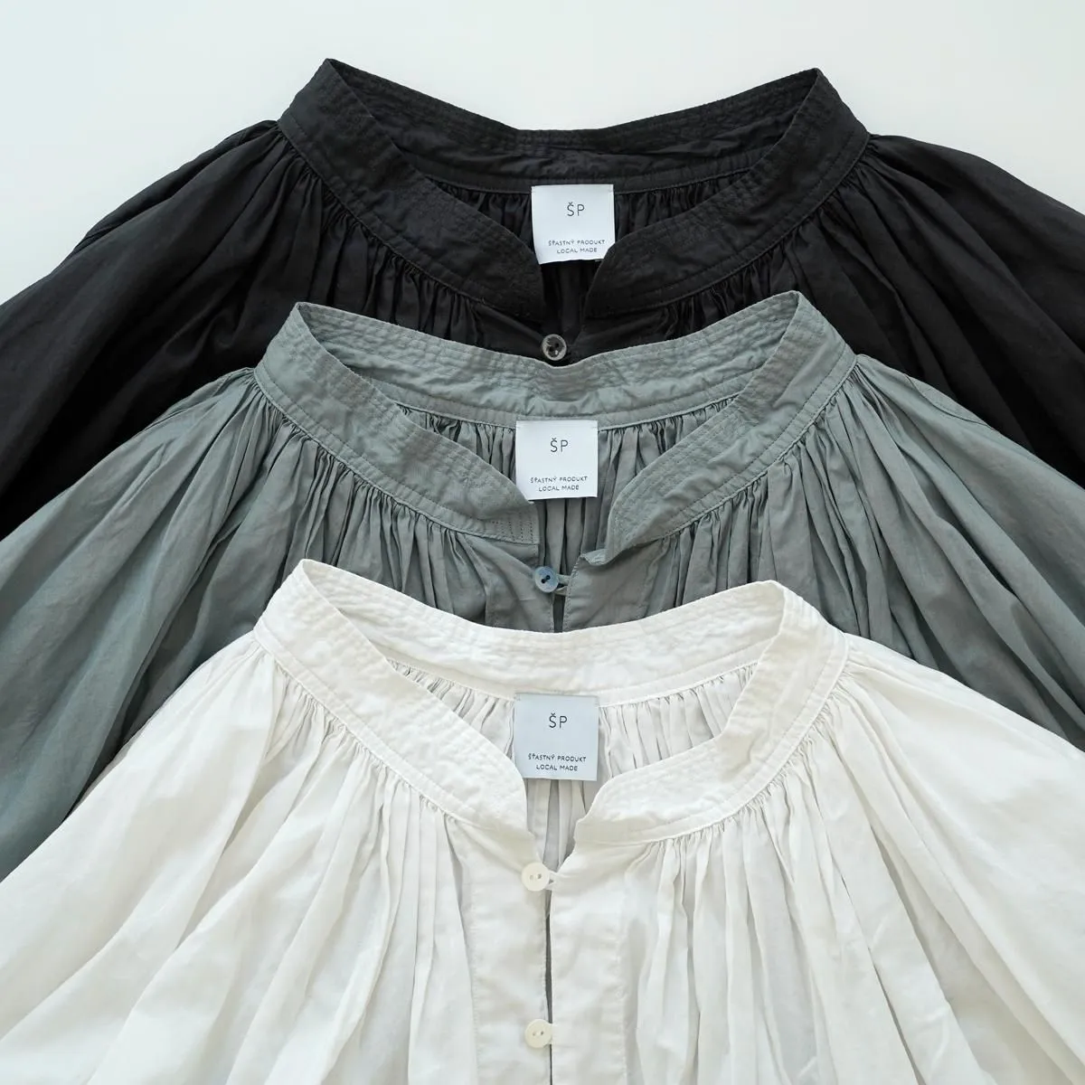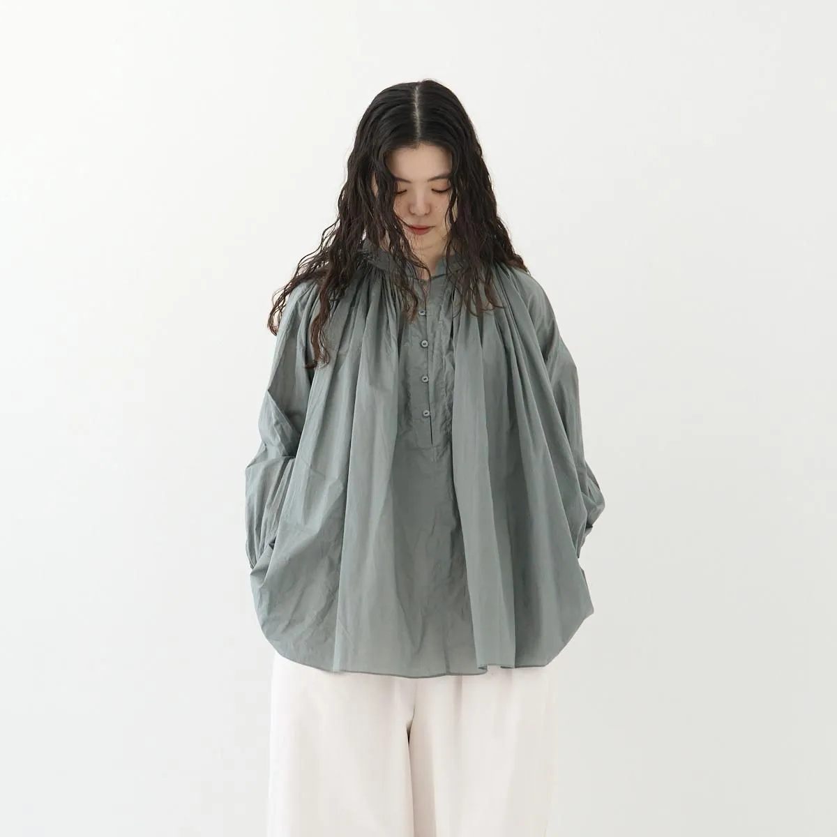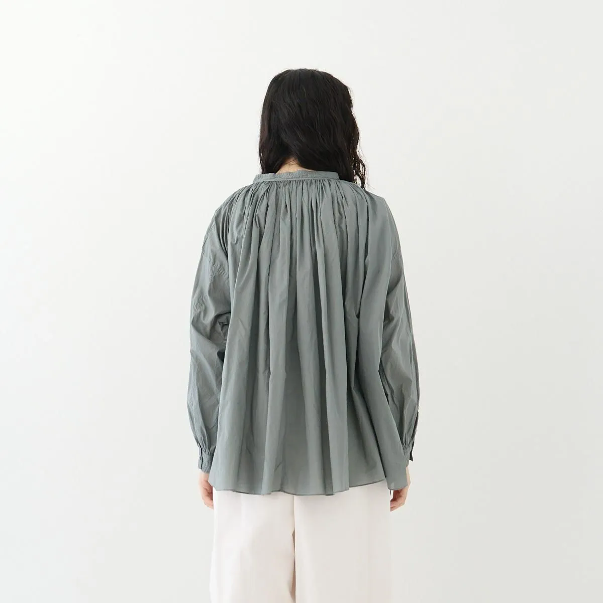 こちらはたっぷりとギャザーを寄せたŠP定番のチャーチスモックブラウス。 19世紀に着用されていたスモックをソースに、現代の生活に馴染むようにアレンジしデザインされています。クラシカルですが洗練された雰囲気を纏っています。 生地はコットンローンで織り上げた、少し透け感のある軽やかなテキスタイルを使用しています。襟周りに施された、たっぷりのギャザーでボリュームがありながらも、この柔らかい生地のおかげでまとまりがよく、美しいドレープが生まれています。 1枚で主役になる存在感。もちろんインナーを重ねて着用していただいても素敵に演出していただけます。 同ブランドのCHINO CLOTH/ WIDE TAPEREDとコーディネートもおすすめです。 size:F 着丈 69cm / 裄丈78cm ※サイズ計測の多少の誤差はご了承下さい。 color:Dim Turquoise/Black/Vintage White material:cotton100% □お洗濯は手洗いをおすすめします。 □素材の特性上 織りムラや織り段、ネップなどが見られますが天然素材による風合いとしてお楽しみください。 □製品染めの為、個体差や多少の色むらがありますが商品の特性となります。 model:168cm お取り扱い店舗・・・ dieci kyutaro店2F -------------------------------------------------------- ŠP/エシュペー 2022年にスタートしたブランド。ブランド名のŠP は「幸福の製品」を意味する 言葉の頭文字です。 19 世紀頃のヴィンテージの衣服や民族衣装などのディテールを取り入れつつ、 着心地やスタイルは今を生きる人のことを考え、 私たちの生活になじむ形となっています。 企画から製造までの多くを日本国内でおこなっており、繊細なディテールと丁寧な素材作りのため、作り手の方との親密で正確なやりとりを大切にしています。
