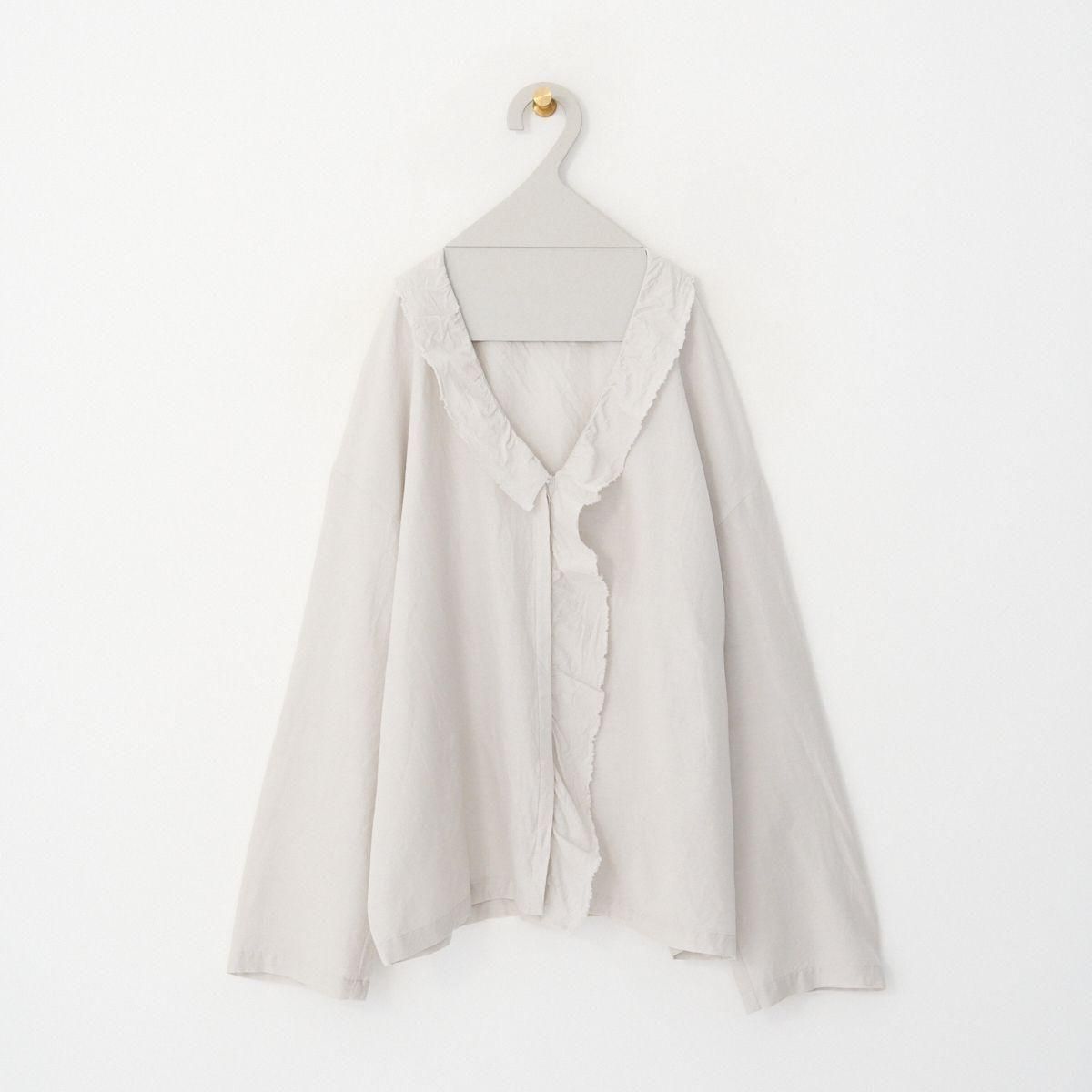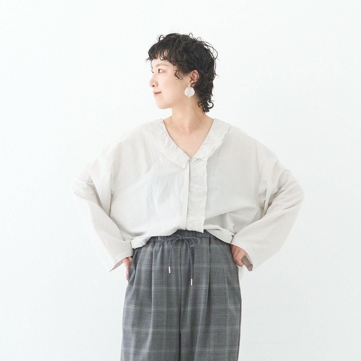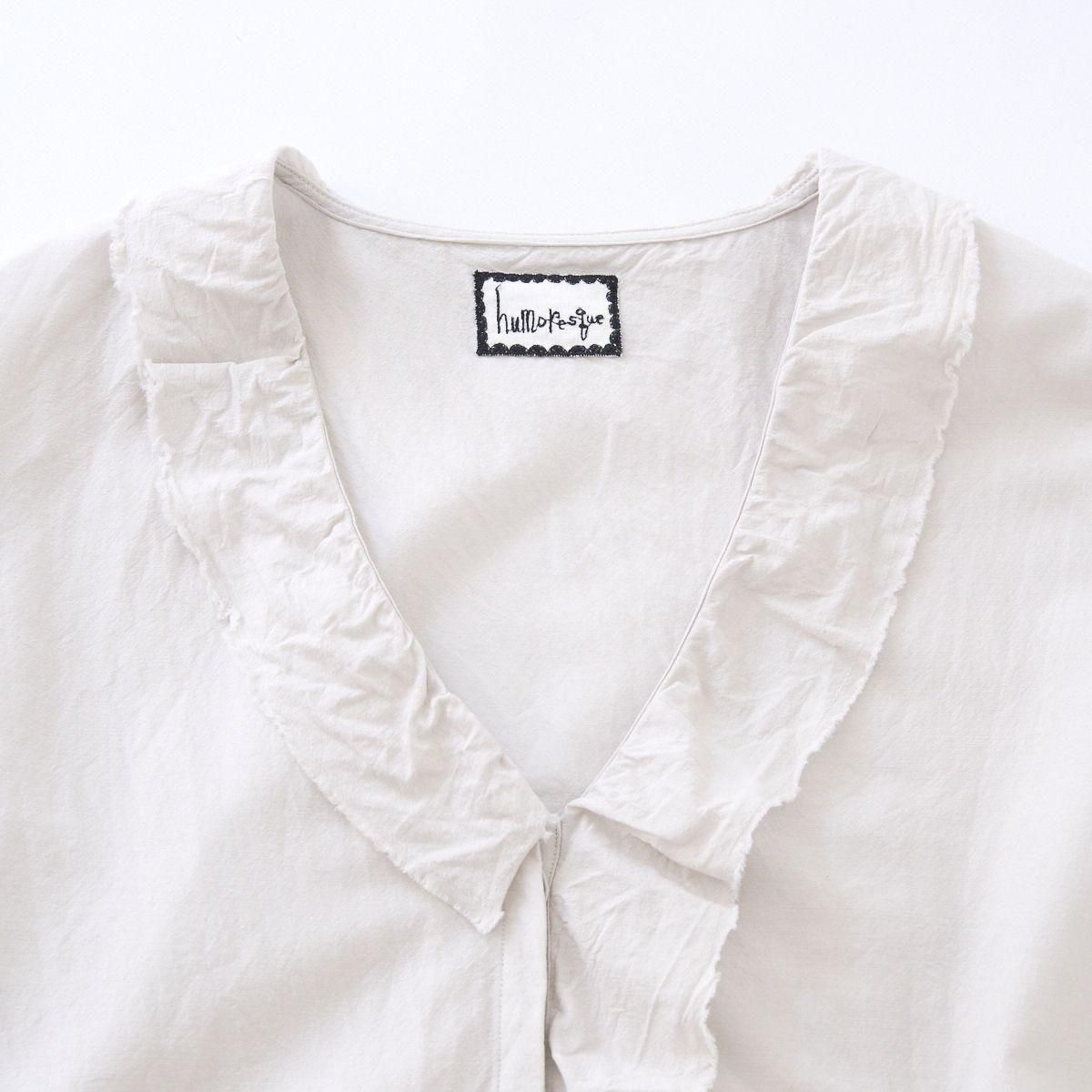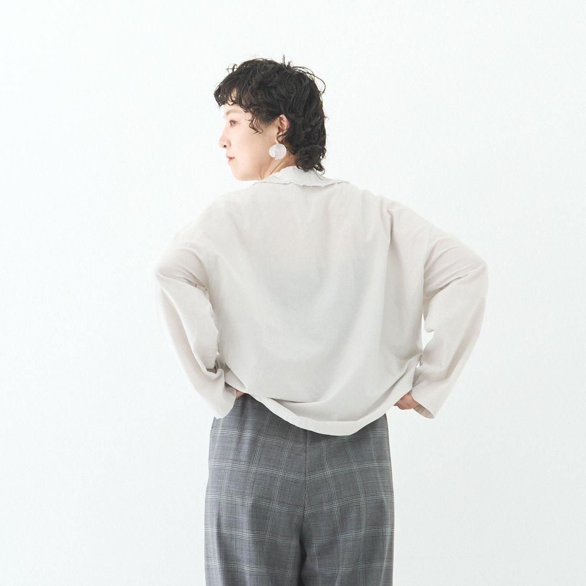 humoresque(ユーモレスク)は、デザイナー 渡辺由夏さんの「ちょうど良い糸を、ちょうど良い形で編んでみたい。」との想いから2012年の秋冬シーズンにニットを中心とした衣服ブランドをスタートし、シルクなど布帛アイテムの展開にも力を入れています。 胸元のフリルが特徴のfurifuri long sleeve blouse。 素材は縦にシルク、横にウールを交織した軽やかなウールシルク。 シルクの光沢感にウールのぬくもりがミックスした素材です。製品洗いをかけることで、フリルが花びらのように広がり、ブラウス全体に愛嬌のある表情に。 襟元からフロントにかけて施された裁ち切りのフリルが程よい甘さを添えつつも、素材の落ち着きによって大人っぽさを漂わせる1枚です。ボタンを留めてブラウスのように着たり、羽織としてラフに纏ったりと、さまざまな表情を楽しめます。 ナチュラルなシワ感が装いにニュアンスをプラスしてくれて、時を重ねるほどに自分だけの風合いに育つブラウスです。 (humoredque引用) size: F 身幅62cm 着丈59.5cm 裄丈78cm color: light gray material: wool80%,silk20% 手洗可 ※天然素材を使用しておりますため、織ムラやかすれ、フシやヨレによる不均一さ、 小さなほつれなどがある場合や、画像の色味や風合いと異なる場合もございます。 デリケートな素材もございますので、引っ掛けやひきつれにはご注意ください。 素材によって仕上がりに個体差が出ること、サイズ感、色、風合いについての特徴を、 天然素材ならではの良さとしてご理解の上、ご購入くださいますようお願いします。 シルクは直射日光により黄変しやすいため、陰干ししてください。 シルク糸が痩せてくるため、優しく手洗い、またはドライクリーニングをおすすめします。 model: 163cm お取り扱い店舗・・・dieci芝川ビル店 size_chart