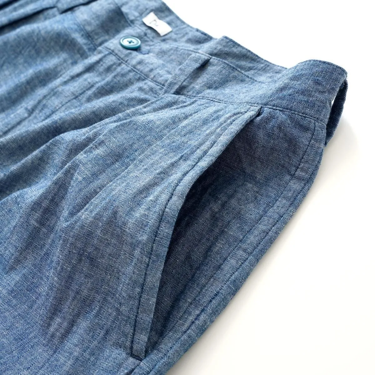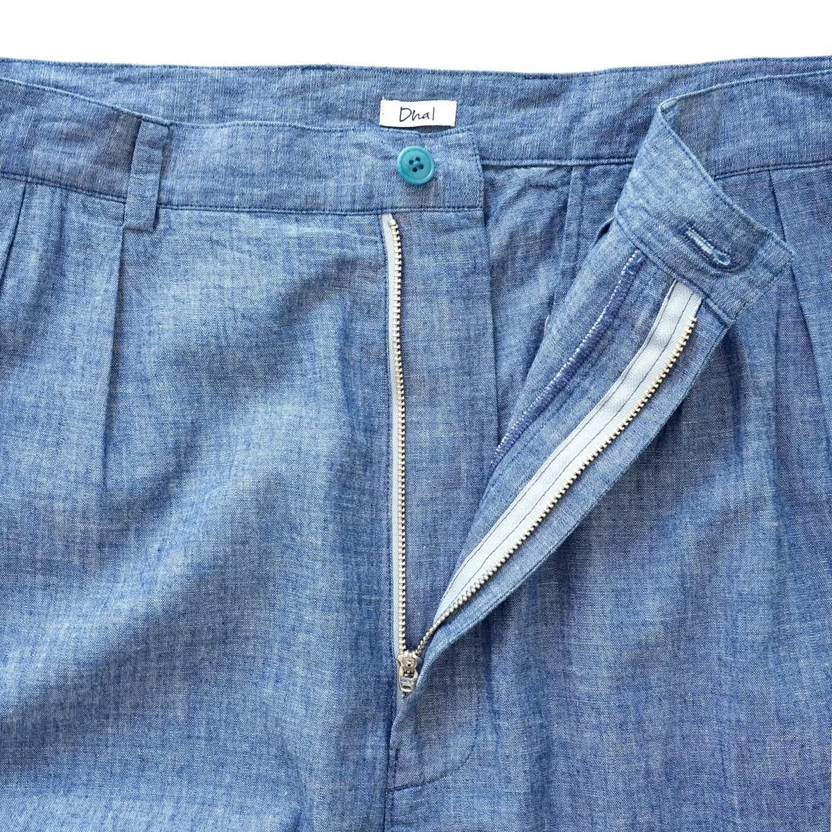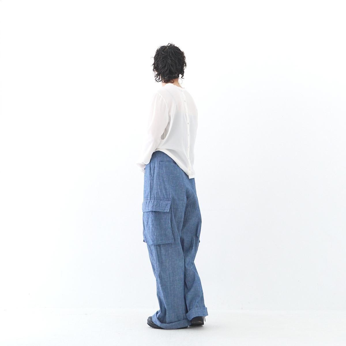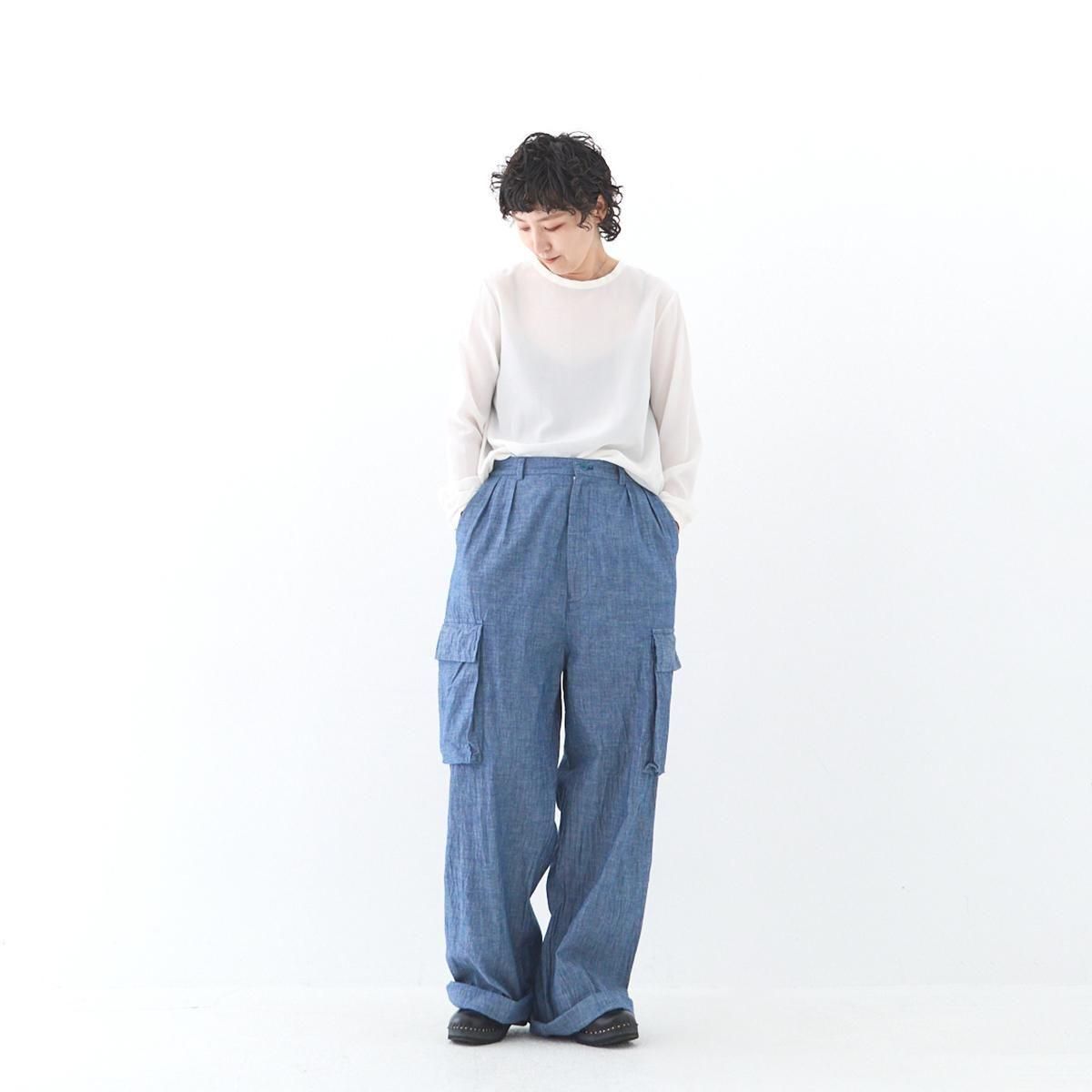 Dhalというブランド名には、ダル(豆)のように、洋服やお店が人の活力や栄養となってほしい、という願いが込められています。 シャンブレー生地のカーゴパンツ。4.5オンスの薄手のデニム生地は、独特な霜降り状の色合いで、洗いざらしのラフなシボ感が特徴です。軽量な生地のためストレスが少なく、暑い季節から涼しく爽やかにご着用いただけます。 フロントに2タック、股上が深めのタボっとしたゆったりシルエットです。長めのレングスなので、ロールアップでソックスや靴とのバランスを楽しんでみては。 25AW color:denim size:M ウエスト40cm/股上40cm/股下70cm/わたり35cm/裾幅28cm ※サイズ計測の多少の誤差はご了承下さい。 material:Cotton100% model:162cm(3枚目-12枚目) 168cm(13枚目-17枚目) 着用アイテム ・トップス:4.5oz Chambray Denim Sailor Shirt ・トップス:crewneck blouse silk ・トップス:Fine Mohair Silk Polo 取り扱い店舗・・・dieci kyutaro店 2F
