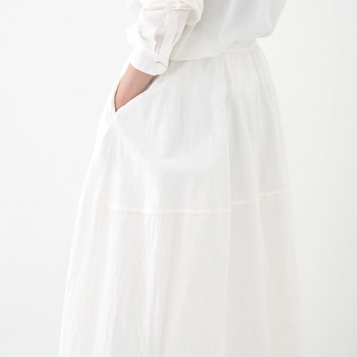 コットンリネンガーゼ素材のギャザースカート。程よい厚みがありますがふんわりと柔らかく、肌離れの良い素材です。裏地には少し地厚のコットン素材を用いて、通気性を確保しながらも、透け感を気にすることなくご着用いただけます。 フレアの途中に切り替えを入れることで、ウエスト周りの広がりを抑え、すっきりとしたシルエットに。またサイドにボリュームが出ず、前後にギャザーが表現されるよう、細部にまで工夫がされています。ウエストはゴムと紐仕様のリラックスした穿き心地。甘さを控えた大人のギャザースカートです。 2025AW size : 2 (one size) ウエスト30~48cm(ゴム仕様)/着丈87cm ※サイズ計測の多少の誤差はご了承下さい。 color : ホワイト material : コットン85%リネン15%(製品洗い加工) model:163cm 取り扱い店舗・・・dieci久太郎店 -------------------------------------------------------- ゴーシュ 普遍的な新しさをテーマに、カッティングやテキスタイルにこだわり、シンプルながらこだわりを感じることが出来る、飽きの来ない衣服を生み出すブランド。日常に寄り添う着心地の良さ、凛とした静かな美しさを追求しています。 サイズガイド size_chart