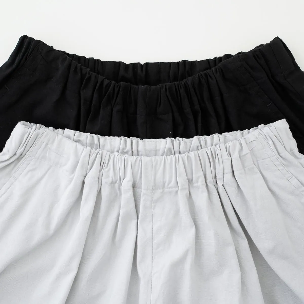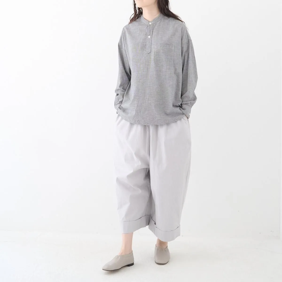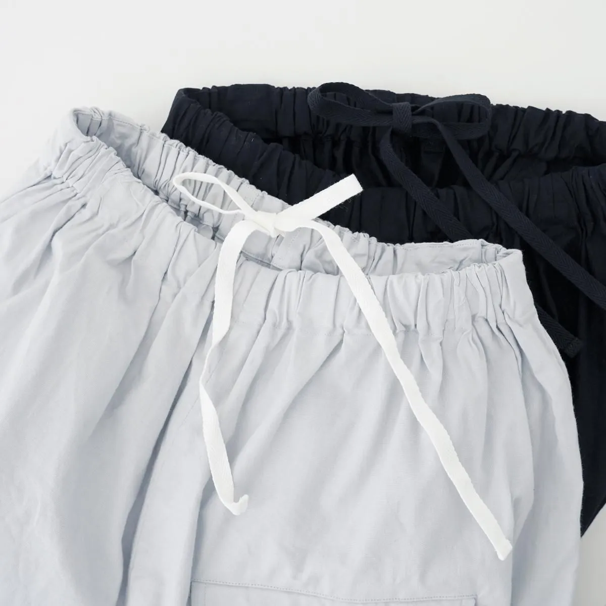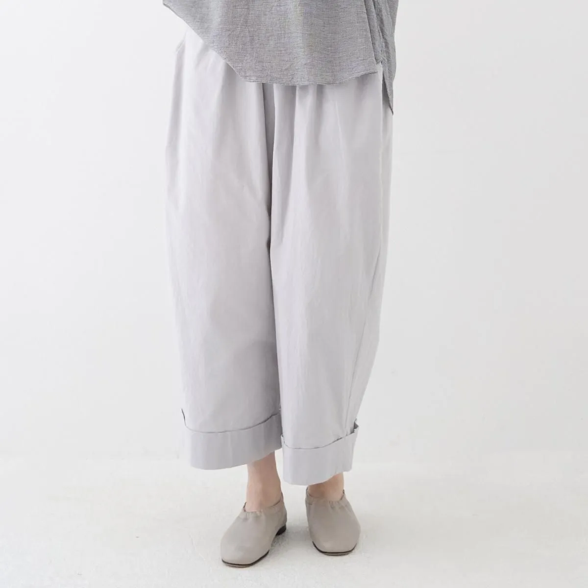 ボクシーなシルエット×8分丈の絶妙なバランスが人気のパンツ。昨年に引き続き登場です。 使用しているポプリンは薄手ながら耐久性が高く、破れにくいタフな生地です。シーズンレスでご着用いただけます。 ウエストはゴム仕様でたっぷりとギャザーが寄せられていますが、生地に落ち感があるので、スッキリとしたシルエット。裾部分は折り返しのデザインになっています。深めの股上で後ろ姿まで愛らしいのもポイントです。8分ほどの短めな丈を活かして、タイツやレギンスのカラーを楽しんでみても。一見個性的ですが実はとてもバランスが取りやすい、おすすめの一枚です。 2025AW size:2(one size) ウエスト〜40cm 股上48.5cm 股下39cm わたり41cm ※サイズ計測の多少の誤差はご了承下さい。 color:ライトグレー/ブラック material:コットン100% model:168cm 取り扱い店舗・・・dieci kyutaro店 2F -------------------------------------------------------- ゴーシュ 普遍的な新しさをテーマに、カッティングやテキスタイルにこだわり、シンプルながらこだわりを感じることが出来る、飽きの来ない衣服を生み出すブランド。日常に寄り添う着心地の良さ、凛とした静かな美しさを追求しています。 size_chart