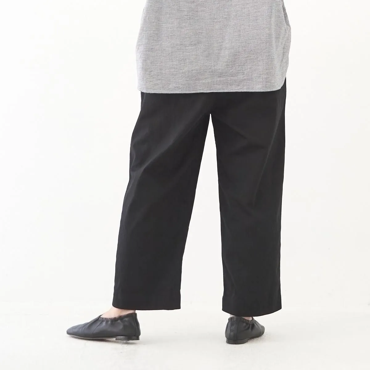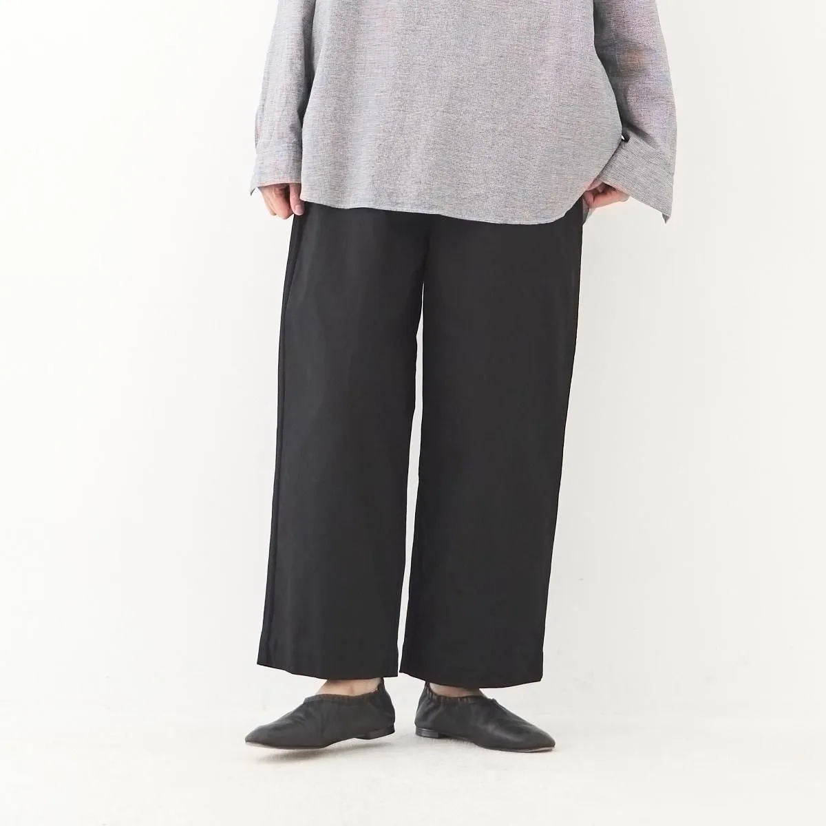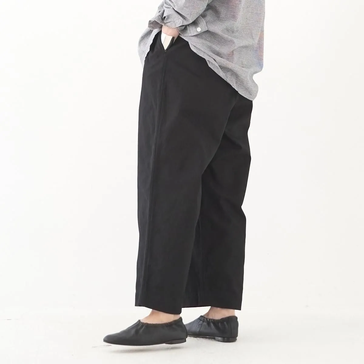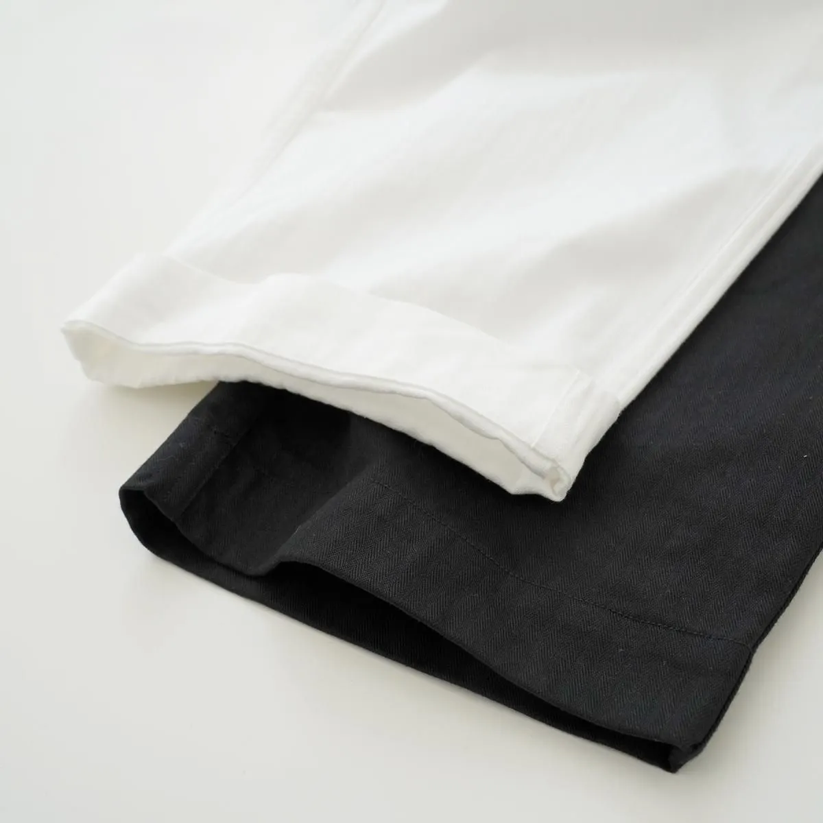 定番のワイドパンツ。前と後ろにそれぞれアクセントとなる小さなポケットがついています。ヘリンボーンの織り模様が入ったコットン素材はハリがありつつも、履き馴染んだような柔らかな風合いがあり、オールシーズンご着用いただけます。 他にない絶妙なシルエットの万能ボトムスは、ゴーシュならではのこだわりが詰まった定番の名作。大人のカジュアルなコーディネートにぜひ取り入れてみては。 「スレン」とは、主に軍服などに用いられる色落ちしにくい染料のこと。この染料で染めたヘリンボーン織りの生地は洗濯を繰り返しても色が長持ちし、美しい発色が保たれるのが特徴です。ゴーシュでは長く人気を博している定番の素材です。(※スレン染色はブラックのみです) 同素材でタイトスカートもございます。合わせてぜひご覧ください。 size:2(one size) ウエスト〜45cm 股上38cm 股下56cm わたり32cm ※サイズ計測の多少の誤差はご了承下さい。 color:ブラック/ホワイト material:コットン100% model:163cm 取り扱い店舗・・・dieci kyutaro店 2F -------------------------------------------------------- ゴーシュ 普遍的な新しさをテーマに、カッティングやテキスタイルにこだわり、シンプルながらこだわりを感じることが出来る、飽きの来ない衣服を生み出すブランド。日常に寄り添う着心地の良さ、凛とした静かな美しさを追求しています。 size_chart
