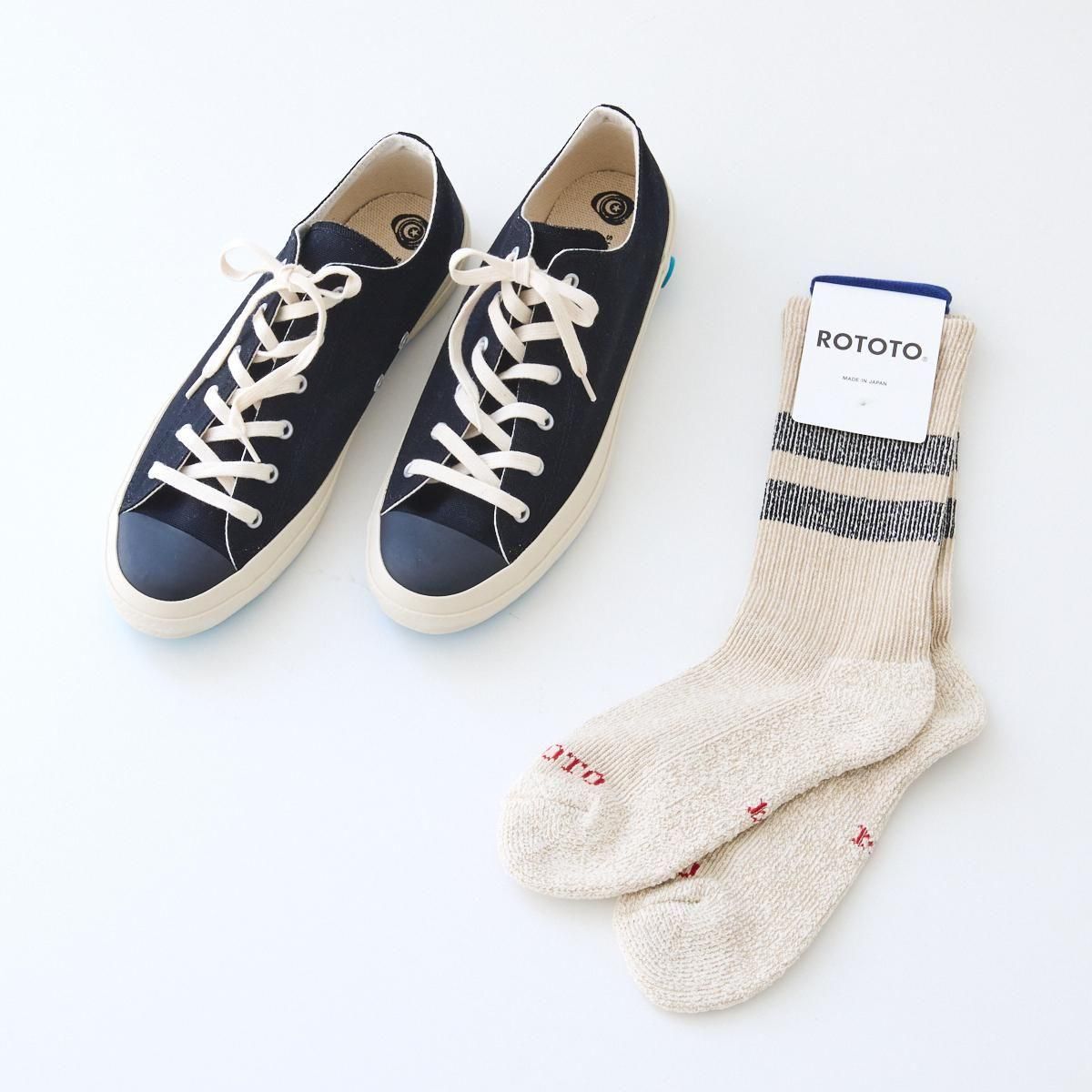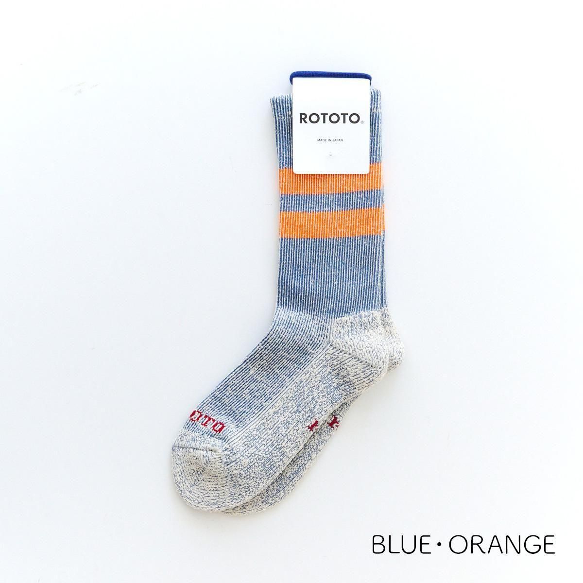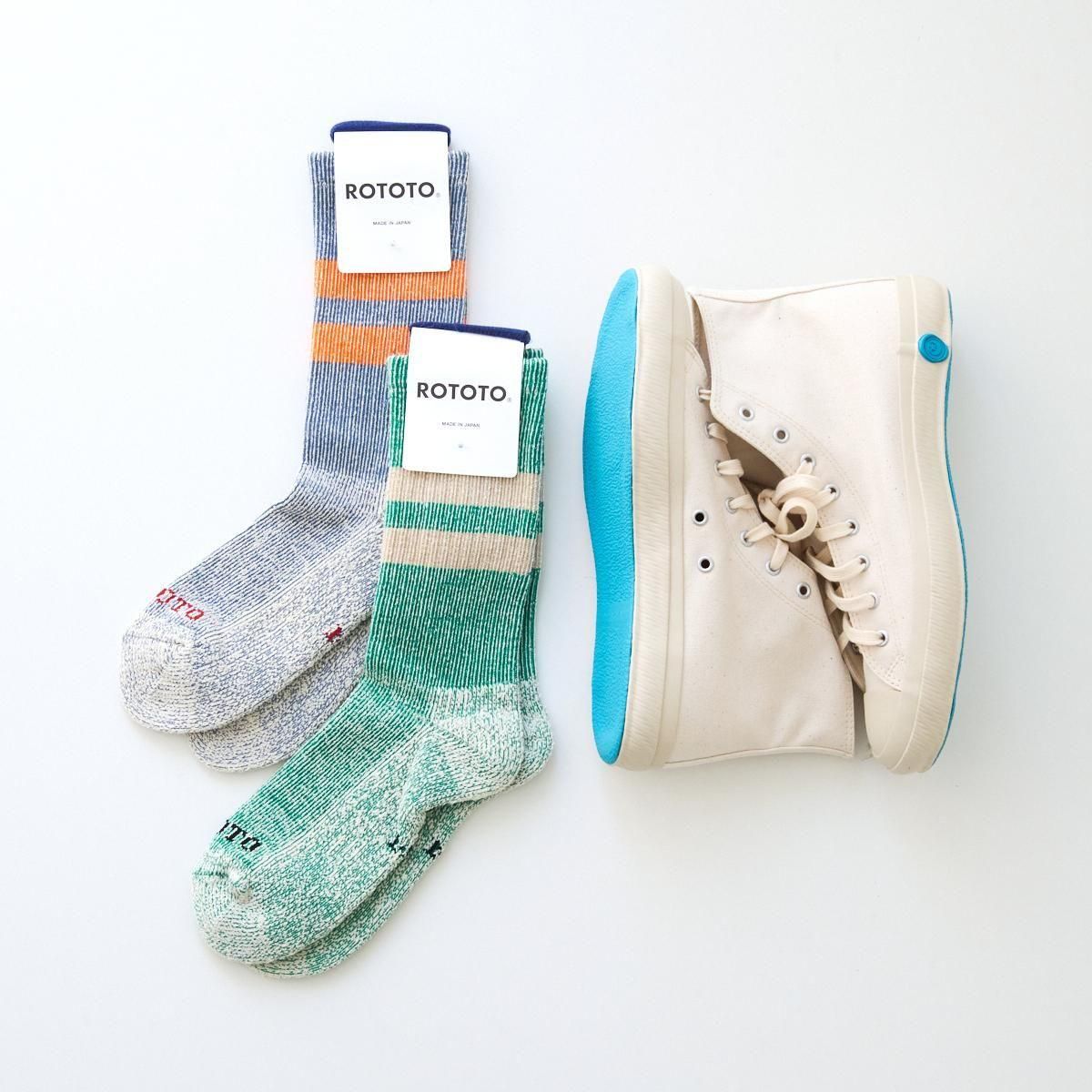 日常とともにある上質と高揚感を大切に丁寧なものづくりを行うブランド「ROTOTO」。 奈良県広陵町を中心に国内随一の生産量を誇る靴下の産地から「一生愛せる消耗品」が生み出されています。 こちらはオーガニックコットンをベースにシンプルなラインが入ったデザインのソックスです。 足底部分にはパイル編みが施され、ふかふかとしたクッション性で疲れにくい使用感。汗などの吸水性にも優れているのでアウトドアシーンにもおすすめです。 size:M(25-27cm) color:BLUE・ORANGE/BEIGE・BLACK/GREEN・BEIGE material:Cotton 62%/Nylon 27%/Polyester 9%/Polyurethane 2% ※乾燥機の使用は縮みの原因となりますのでお避けください。 お取扱い店舗・・・dieci kyutaro店 1F