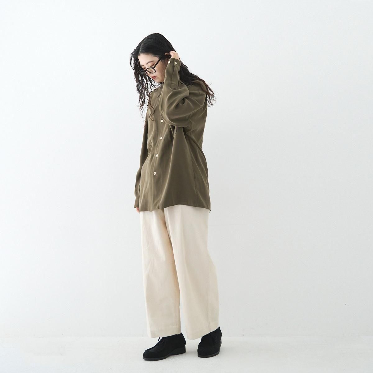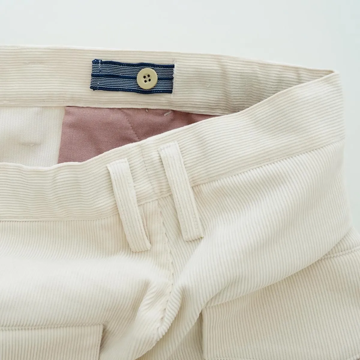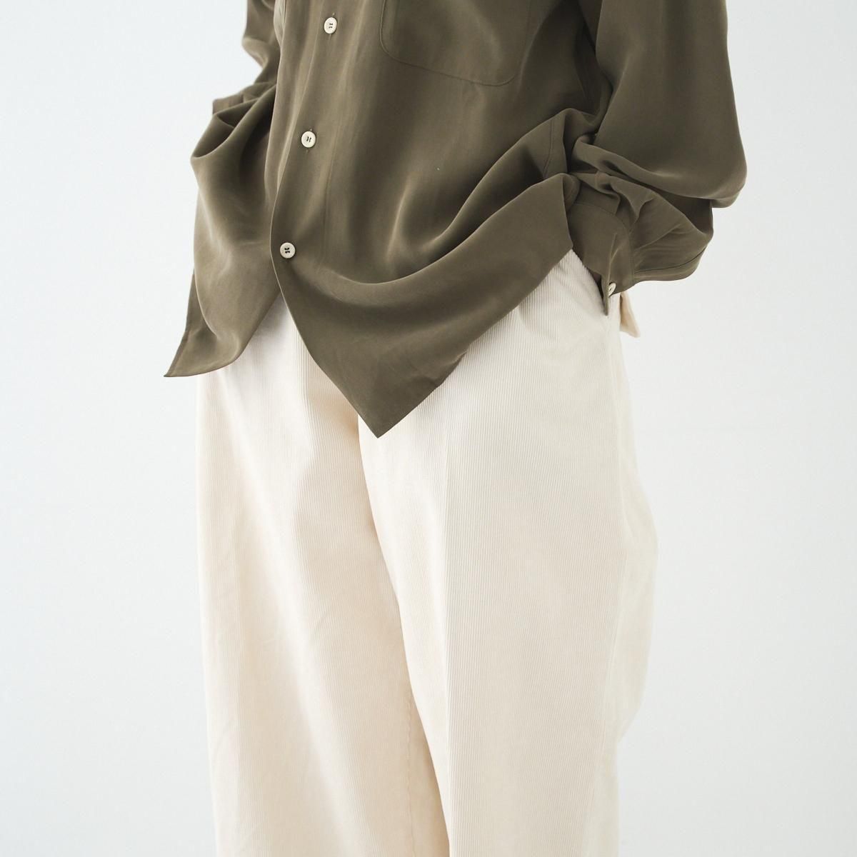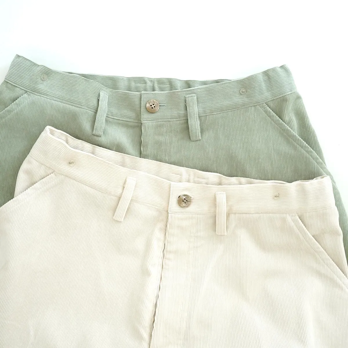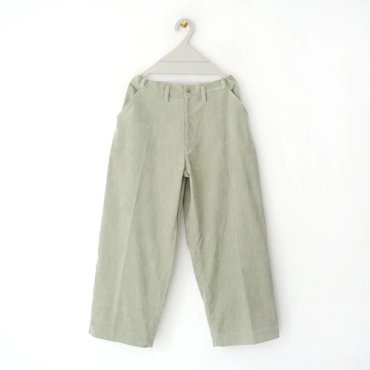 こちらは程よいハリのある細ウネのコットンコーデュロイパンツです。 わたりに幅を持たせ、裾に向かってほんのりと細くなったテーパード型。たっぷりとゆとりはありますが、ゴワつきのない素材なので、ストンと落ちて自然なシルエットでご着用いただけます。ウエストはアジャスター付きで簡単にサイズ調整が可能。綺麗なミントグリーンとクリームカラーがカジュアルすぎず上品な印象です。 25AW size:1 ウエスト42cm(調整可能)/股上33cm/股下68cm/わたり38cm/裾幅27.5cm ※サイズ計測の多少の誤差はご了承下さい。 material : cotton 100% color : mint green/cream 取り扱い店舗・・・dieci kyutaro店 2F -------------------------------------------------------- ippei takei/イッペイ タケイ レディースウェアを中心としたブランド。パターン、縫製など全てを自ら行うパンツの受注生産を経て2000年にスタートしました。コンセプトは男性のワードローブを女性に向けて開放すること。ユニセックスなアイテムを敢えて女性らしくアレンジしたり、コレクションごとにテーマを変えて展開されています。 size_chart