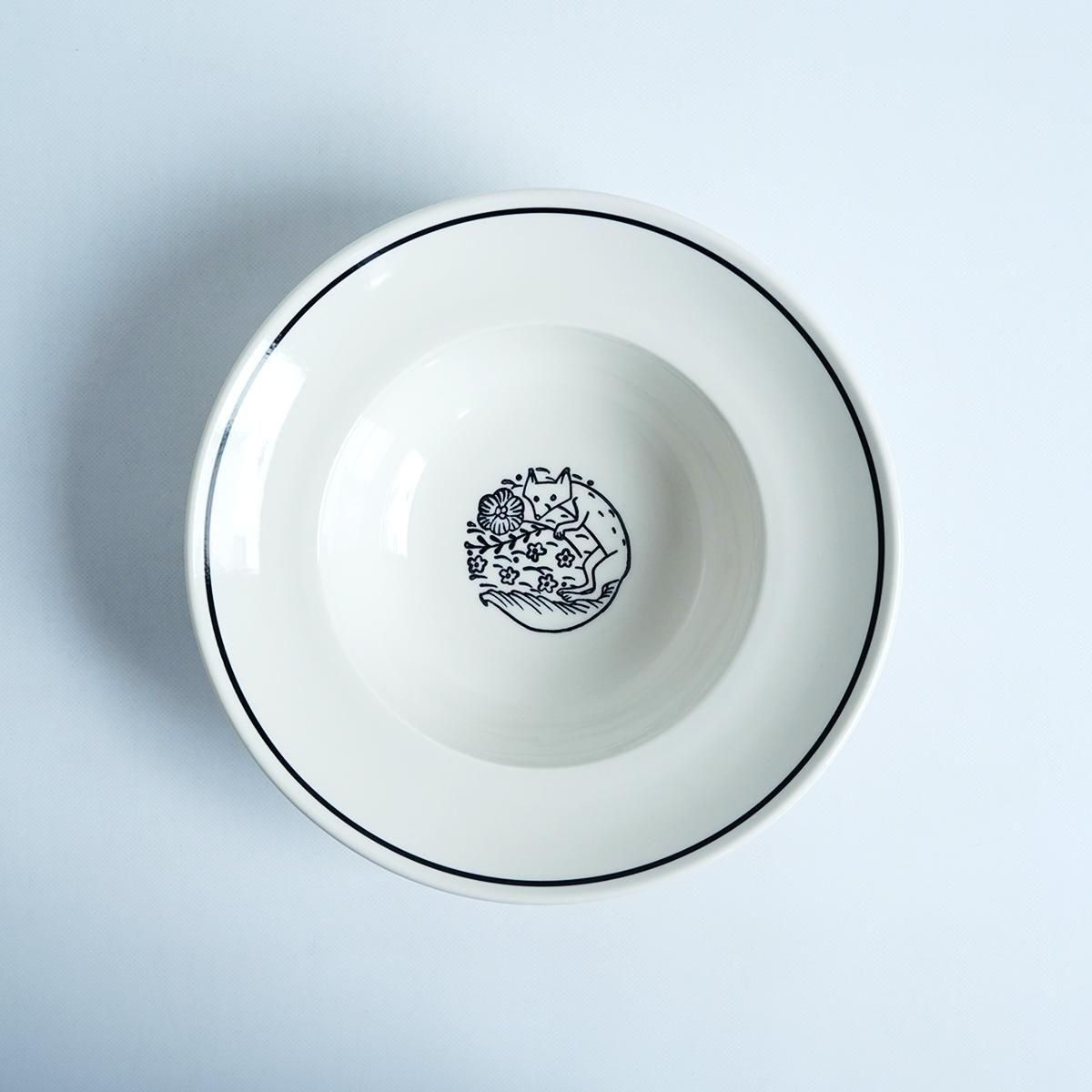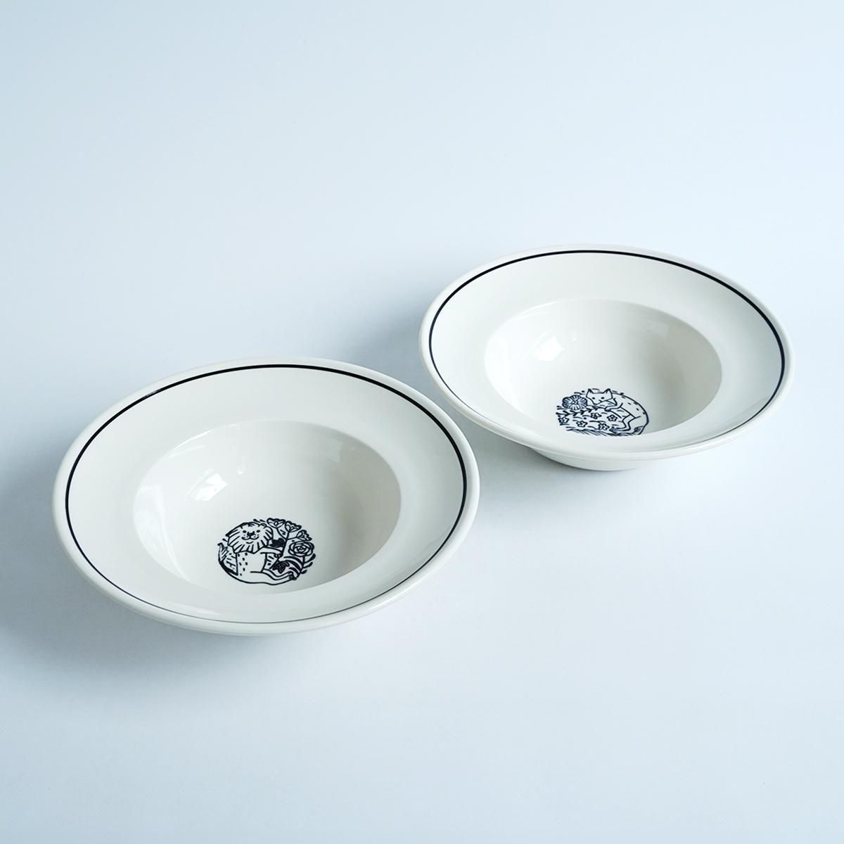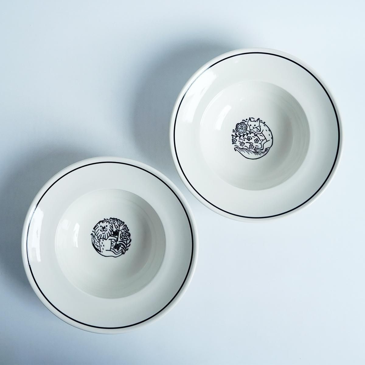 鹿児島睦さんとイギリス南部に工房を構える磁気メーカJOHN JULIAN (ジョン・ジュリアン)のコラボレートによる食器のシリーズのボウルです。 スタンプの絵柄は「Lion(ライオン)」、「Fox(キツネ)」の2種類。 柔らかな乳白色の磁器に鹿児島さんが描き下ろした図案をスタンプにし一点一点、職人による手作業でスタンプが押されています。 そのため、スタンプによる絵柄のにじみやかすれ具合の個体差があり、手作業ならではの趣きを感じる仕上がりとなっております。 とても使い勝手もよく毎日の食卓にぜひ。 こちらのボウルは様々な料理に使いやすく、食べ進むと可愛らしい絵柄が登場してくる楽しい器です。  【JOHN JULIAN (ジョン・ジュリアン)】 イギリス南部・ウィルトシャーに創立した磁器メーカー。 ろくろや回転旋盤を用いながら、職人の手作業によってシンプルで美しいキッチンウェアを生み出しています。 高温で焼成される重厚な磁器は高い強度と耐久性があり、日常の道具としての安心感を感じられる佇まい。 イギリスのクラシカルな器の存在感と、機能性から導かれる実用的なデザインで、多くの料理人にも選ばれています。  【鹿児島 睦(かごしま まこと)】 福岡生まれ。美術大学卒業後、インテリア会社に勤務しディスプレイやマネージメントを担当。2002年より、福岡市内にある自身のアトリエにて陶器やファブリック、版画などを中心に制作。日本国内のみならず、L.A.、台北、ロンドンなどで個展を開催。 size: 約φ22.8cm×H6.2cm 取り扱い店舗…dieci天神橋店 ※ジョン ジュリアンの器は、ろくろや回転旋盤を使った成型から、フチにつけられたライン、絵柄のスタンプなど、すべての工程を職人がひとつひとつ手作業で行っているため、絵柄のかすれやにじみ、焼きムラ、器の形状など仕上がりに個体差がございます。 このような個性の違いは、機械による大量生産ではなく、人の手でつくられているからこそのものです。その器の味としてお楽しみください。