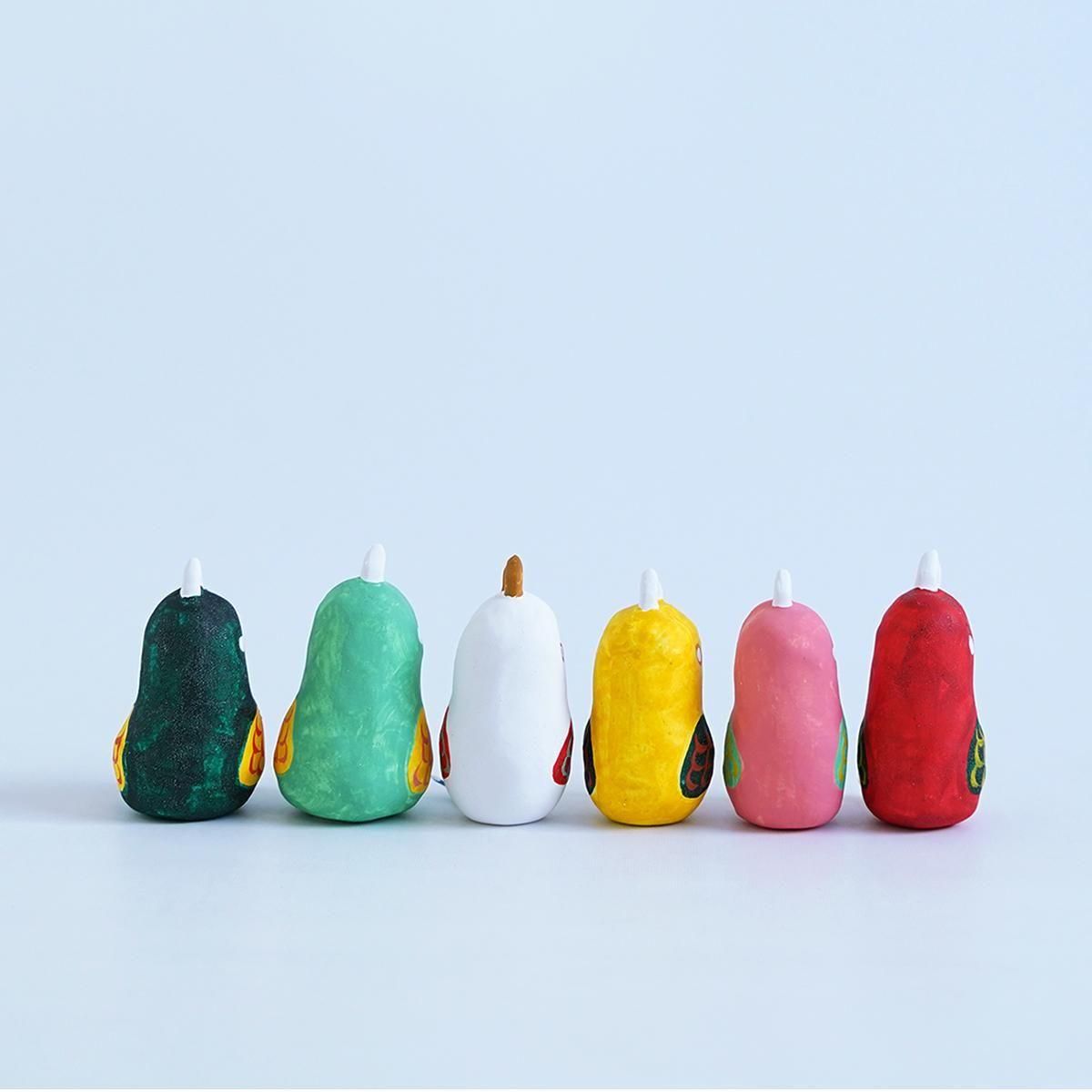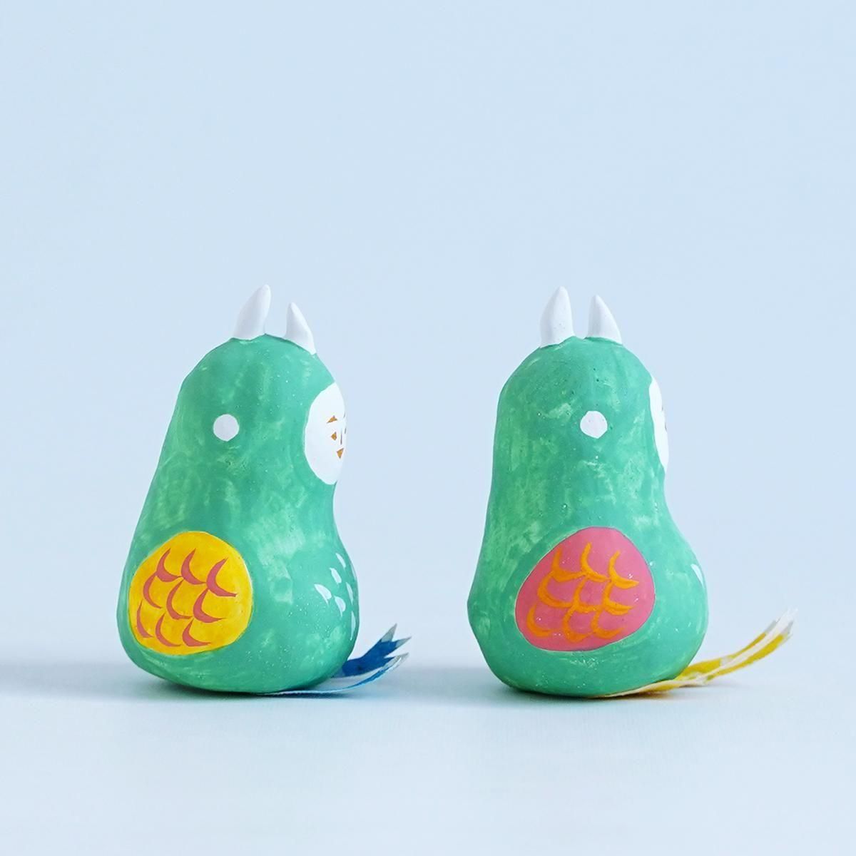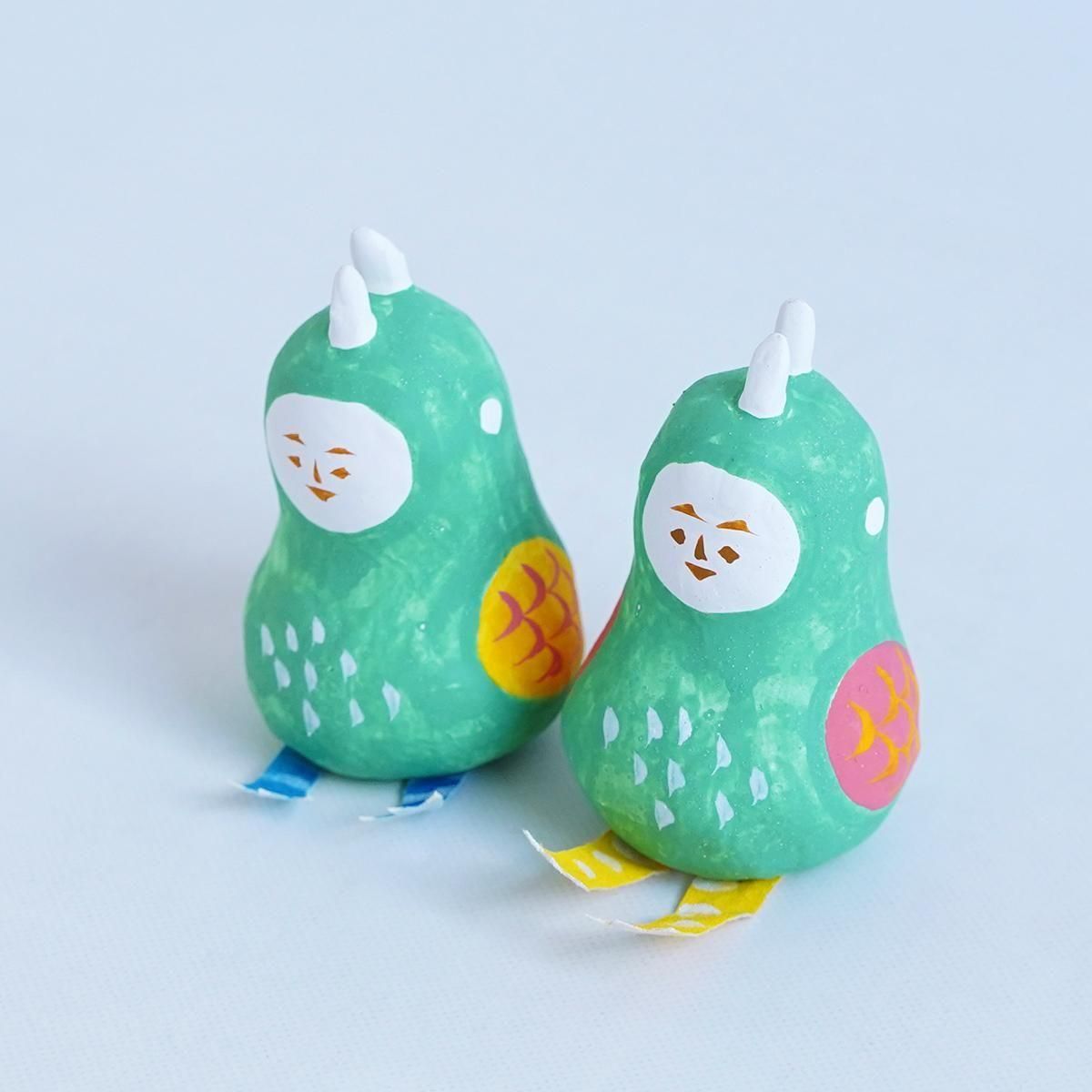 沖縄の豊永盛人さんが作る琉球張り子。 フォルムや表情がなんとも言えない愛おしさが溢れる鳥彦です。 ロードワークスさんらしい人気の張り子となります。 サイズや色の異なる鳥彦を並べて兄弟のように愛でたくなります。 作家:豊永盛人(Roadworks) size:約W4.5cmxD4.5cmxH7.5cm color:(お写真1枚目右から順に)赤、ピンク、黄、白、水色、深緑 *1点1点手作りのため、サイズや色、形や柄など微妙に異なります。 ※張り子玩具は水や湿気に大変弱く、衝撃にも弱いです。 濡れた手で触ると色が落ちることもございます。お取り扱いにはご注意ください。 取扱店舗…dieci天神橋店