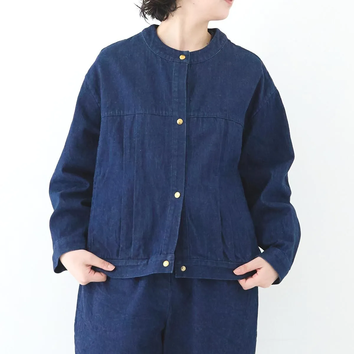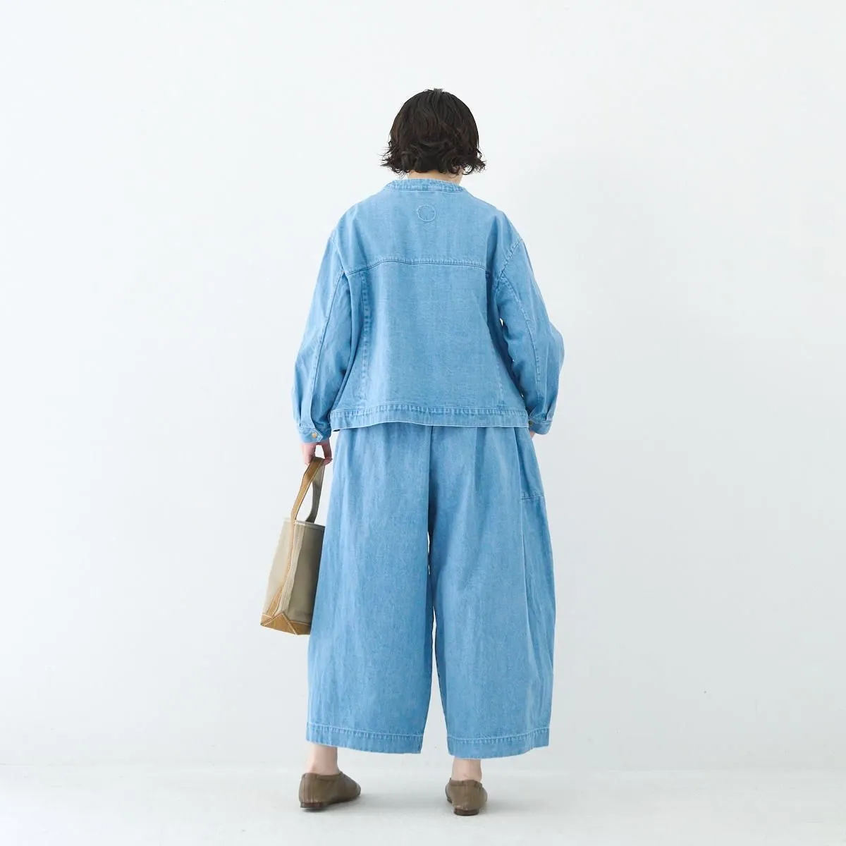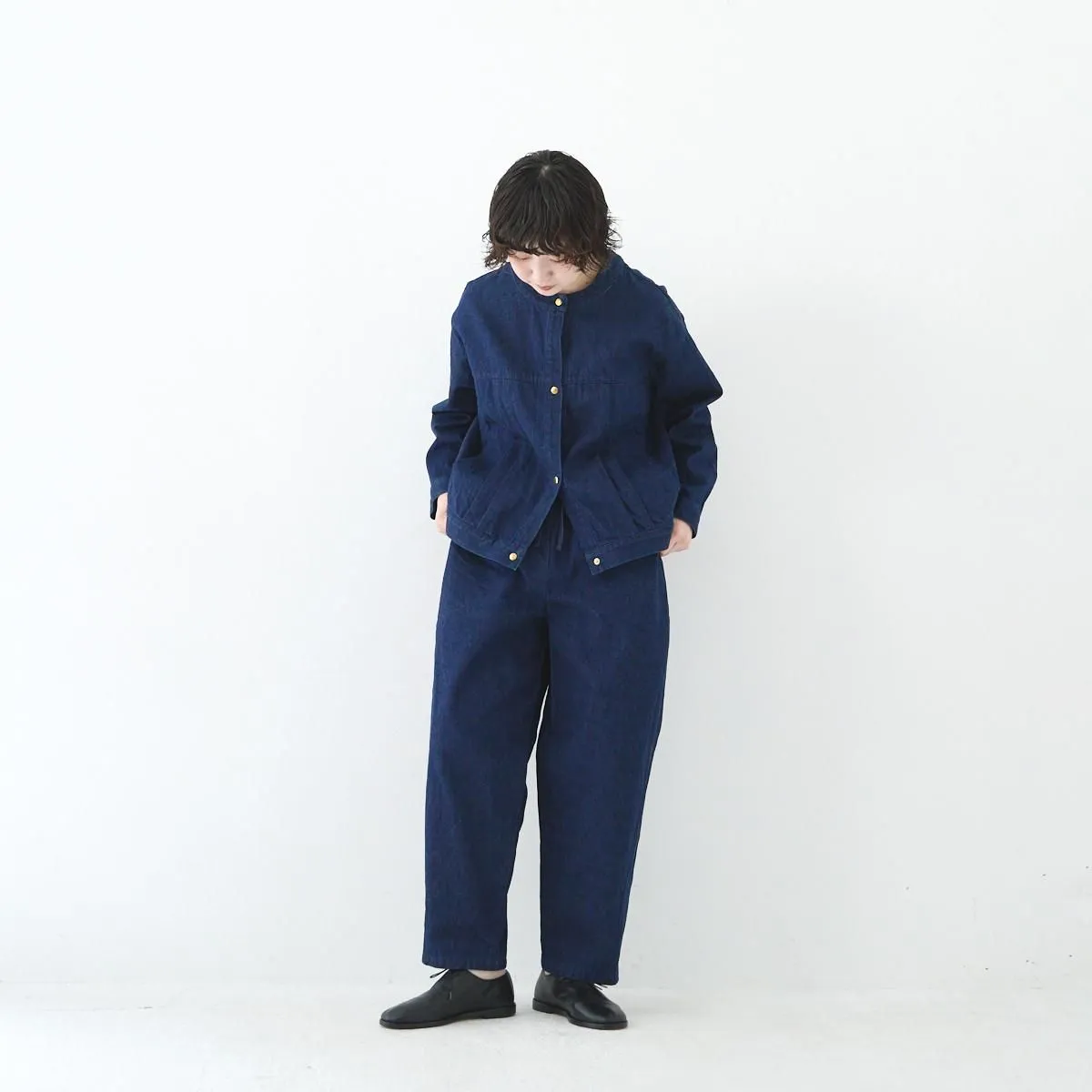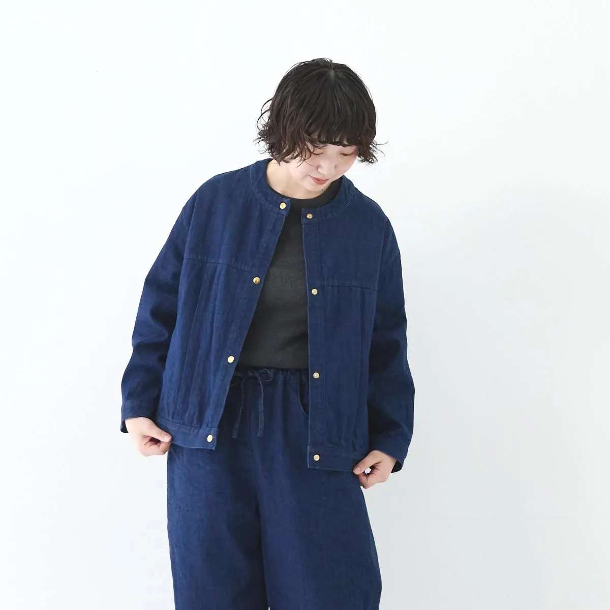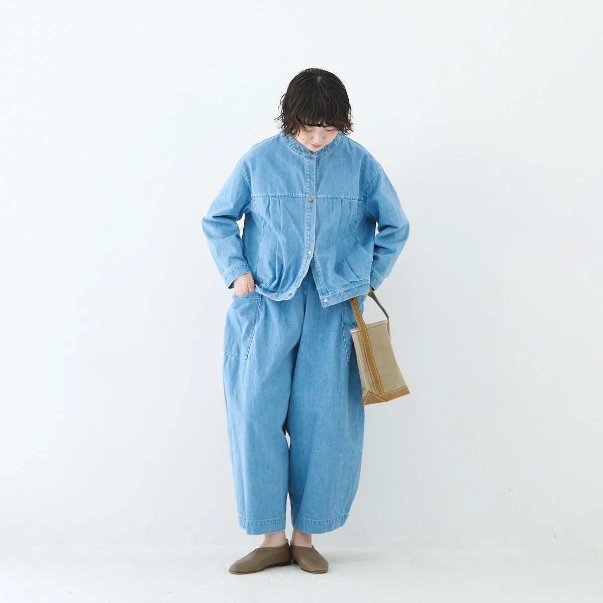アトリエ・ダンタンのコットンデニムシリーズより、ノーカラーのジャケット「Andre /アンドレ」が登場しました。 ふっくら手触りがよく、程よい厚みを持ちながらも、きしみのない柔らかな素材感が特徴です。フロントはヴィンテージデニムのようなプリーツが施され、ゴールドのスナップボタンで上品な印象に。フェミニンなアイテムとも相性がよく幅広いスタイリングにお使いいただけます。 ドロップショルダーと広めの身幅のゆとりのある着用感で、袖を通すと丸みのあるボックスシルエットが現れます。ミドル丈なのでボトムスとのバランスもとりやすく、同素材のデニムパンツとセットアップで着用するのもおすすめです。 ブリーチ加工を施した爽やかな印象のライトインディゴと、ワンウォッシュ加工の経年変化を楽しめるダークインディゴの2色からお選びいただけます。 size:F 着丈57cm/肩幅51cm/身幅60cm/袖丈50cm color:ライトインディゴ・ダークインディゴ ※商品には若干の個体差があるため、採寸には誤差がございます。 ※水に濡れた状態などで擦れると色移りする恐れがありますので、取り扱いにご注意ください。※単独洗いをおすすめします。 material:cotton100% model:160cm お取り扱い店舗・・・dieci kyutaro店2F -------------------------------------------------------- Atelier d'antan|アトリエ ダンタン フランス語で『古き良き、往年の麻』を意味するブランドAtelier d'antan(アトリエ・ダンタン)時を経ても変わることの無い上質な素材というテーマを中心に、年齢や体型にとらわれない、どんな人も自分らしいお洒落を楽しんで欲しいという思いが込められたお洋服をつくられています。