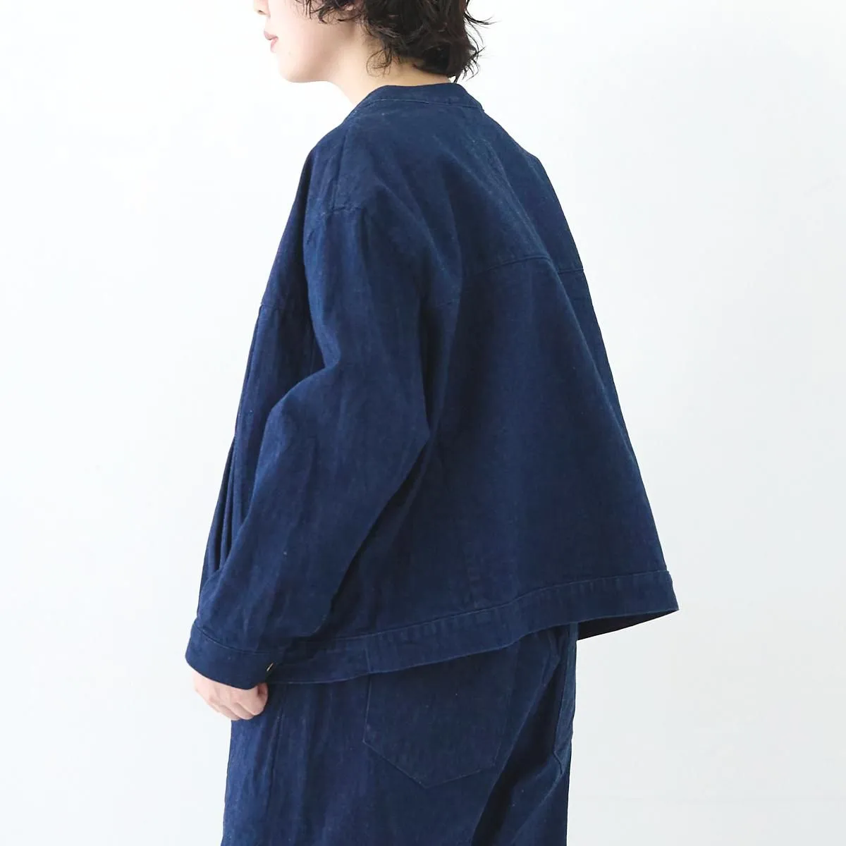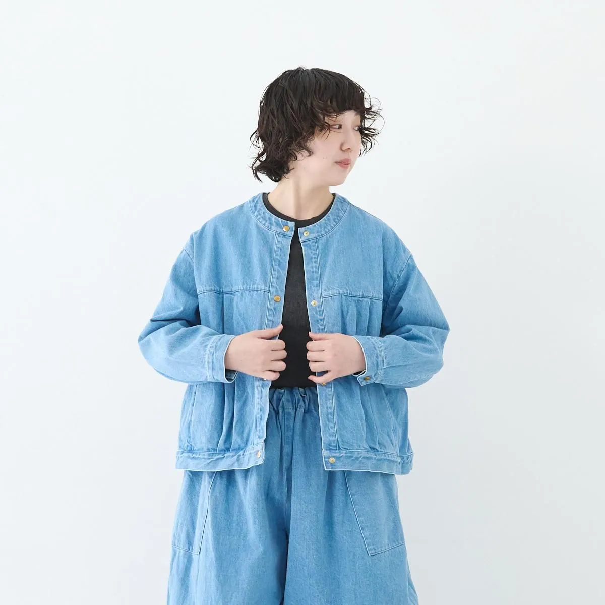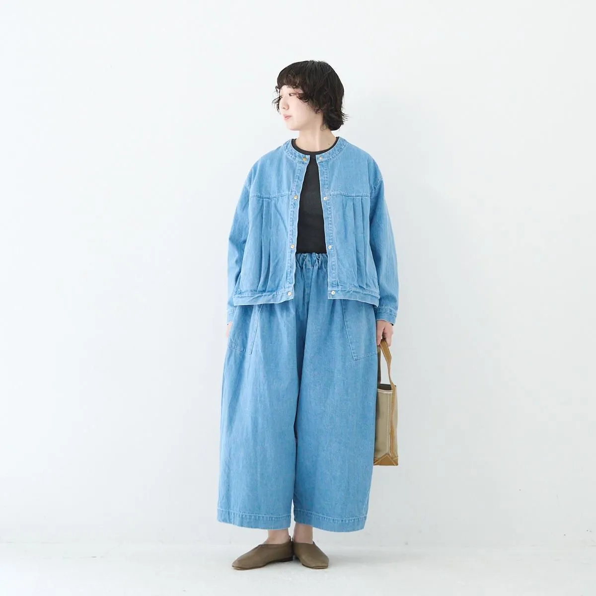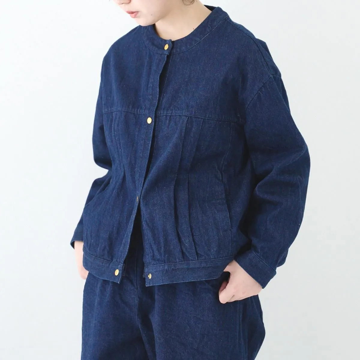 アトリエ・ダンタンのコットンデニムシリーズより、ノーカラーのジャケット「Andre /アンドレ」が登場しました。 ふっくら手触りがよく、程よい厚みを持ちながらも、きしみのない柔らかな素材感が特徴です。フロントはヴィンテージデニムのようなプリーツが施され、ゴールドのスナップボタンで上品な印象に。フェミニンなアイテムとも相性がよく幅広いスタイリングにお使いいただけます。 ドロップショルダーと広めの身幅のゆとりのある着用感で、袖を通すと丸みのあるボックスシルエットが現れます。ミドル丈なのでボトムスとのバランスもとりやすく、同素材のデニムパンツとセットアップで着用するのもおすすめです。 ブリーチ加工を施した爽やかな印象のライトインディゴと、ワンウォッシュ加工の経年変化を楽しめるダークインディゴの2色からお選びいただけます。 size:F 着丈57cm/肩幅51cm/身幅60cm/袖丈50cm color:ライトインディゴ・ダークインディゴ ※商品には若干の個体差があるため、採寸には誤差がございます。 ※水に濡れた状態などで擦れると色移りする恐れがありますので、取り扱いにご注意ください。※単独洗いをおすすめします。 material:cotton100% model:160cm お取り扱い店舗・・・dieci kyutaro店2F -------------------------------------------------------- Atelier d'antan|アトリエ ダンタン フランス語で『古き良き、往年の麻』を意味するブランドAtelier d'antan(アトリエ・ダンタン)時を経ても変わることの無い上質な素材というテーマを中心に、年齢や体型にとらわれない、どんな人も自分らしいお洒落を楽しんで欲しいという思いが込められたお洋服をつくられています。