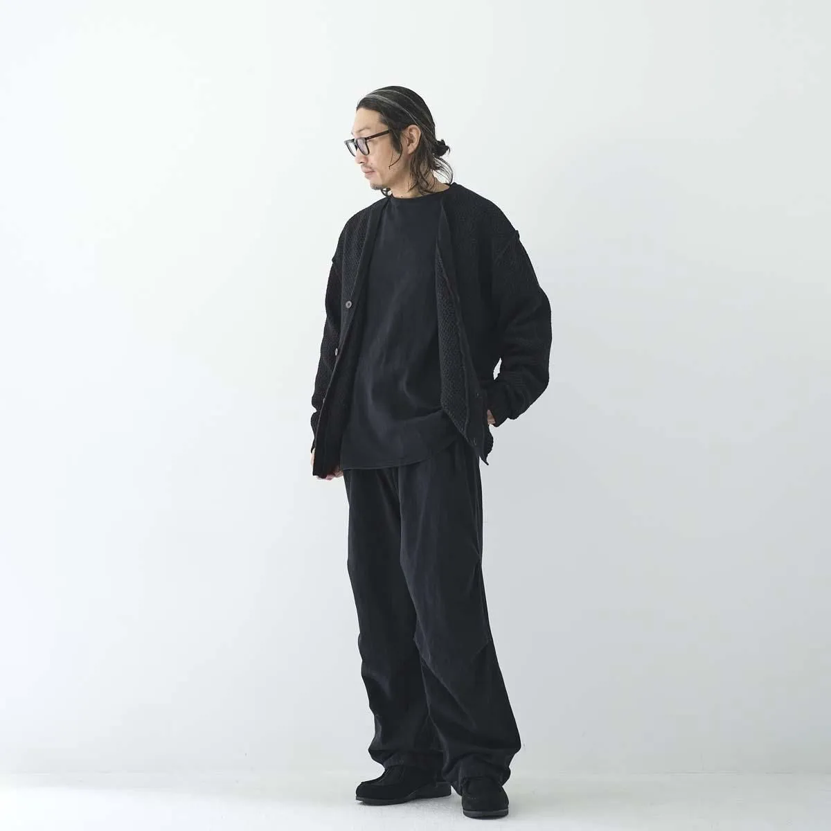 2011年にデザイナー小森啓二郎が立ち上げたブランド。 全ての洋服の原型は、ある目的の為に作られた物である。 この考えを基に、その時の気分や感覚を取り入れた洋服を提案しています。 2019年9月、南青山に旗艦店をオープン。 24SSから継続となる気持ちの良いコットンジャージのニータックパンツです。 色落ちさせて表情を出し、ドライな質感に仕上げられています。 着用や洗剤により色落ちして、風合いの変化も楽しめるので、気軽にシーズン長くお召しいただけます。同素材でセットアップも。 この製品は染色の特性上、汗や雨で湿ったり、摩擦で他のものに色移りすることがあります。 洗濯は他のものと分け、着用の際はご注意ください。 直射日光や蛍光灯に長時間当たると、変色したり、色あせすることがあります。保管の際ご注意ください。 アイロン掛けの際は、あて布をご使用ください。 color:BLACK size:1,2 2: ウエスト36~48cm 股上38cm 股下78cm わたり37cm 裾幅~25cm material:COTTON 100% model: 173cm/163cm (#2着用) 取扱い店舗…dieci芝川ビル店