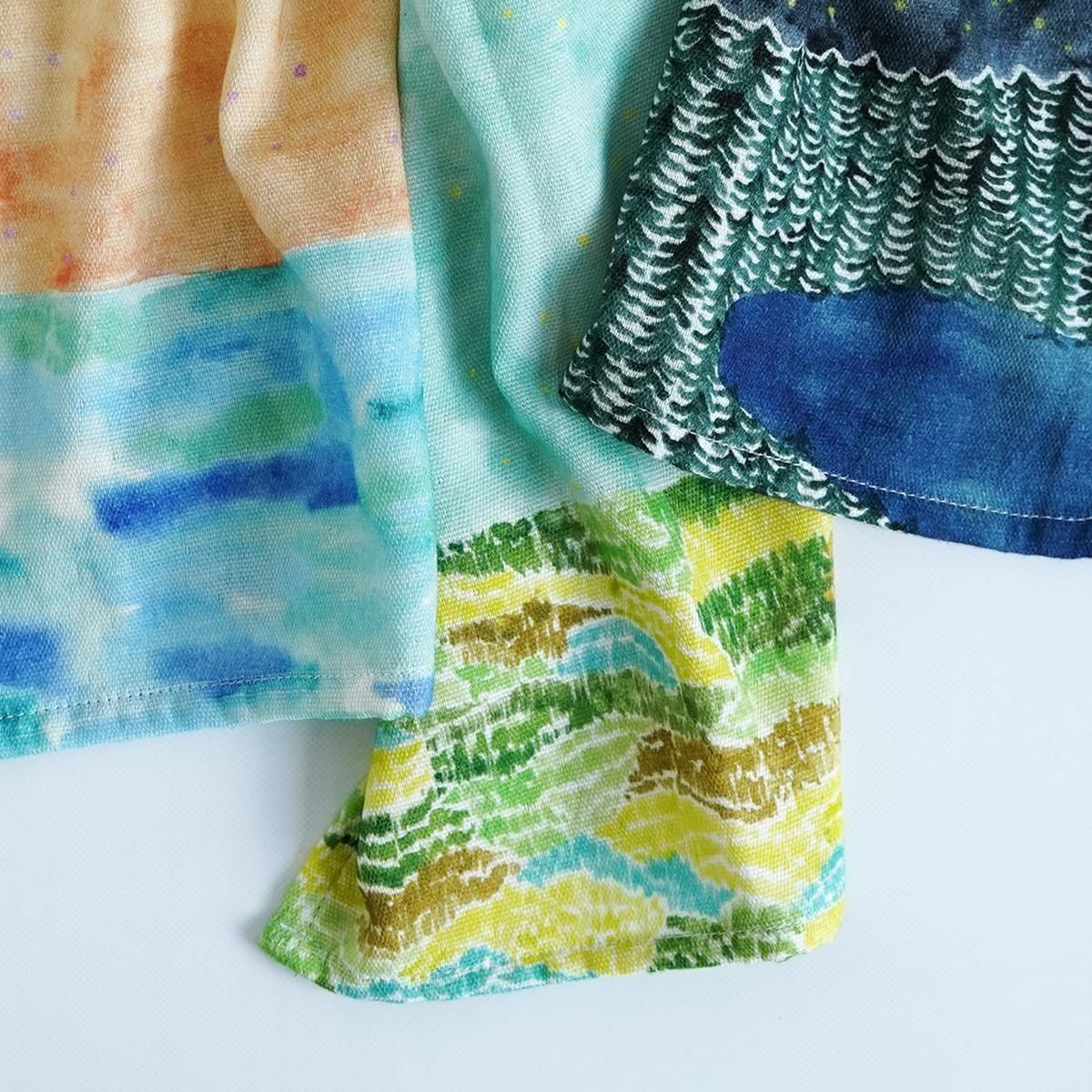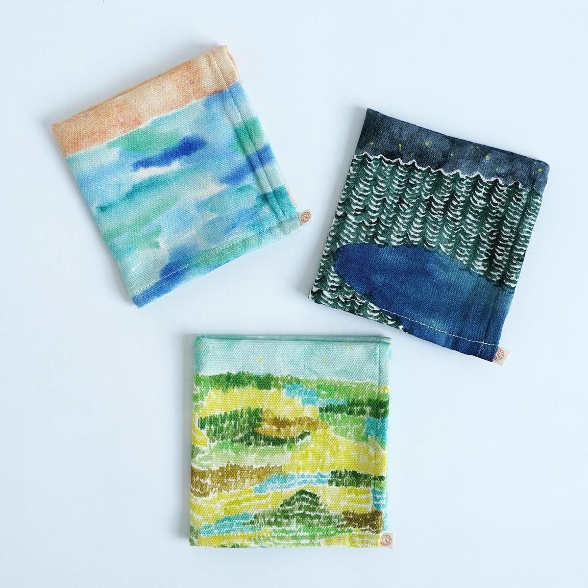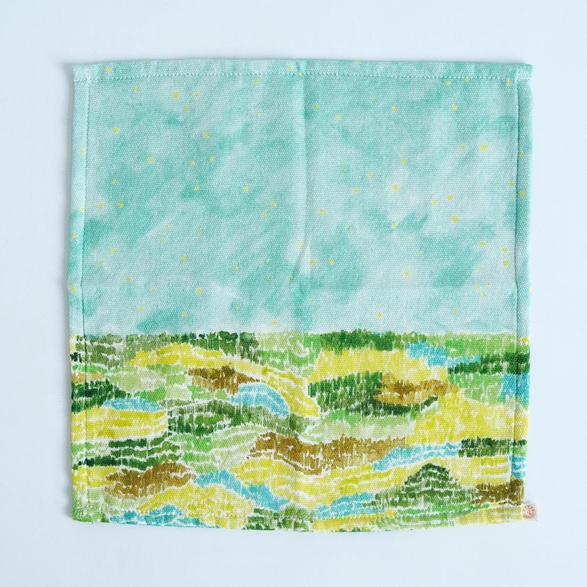 イイダ傘店は、テキスタイルデザインから発展させた小物を作っています。こちらは人気のイイダ傘店のミニタオルです。オーガニックコットンのダブルガーゼでお肌に優しい素材です。デニムのポケットに丁度良いサイズなのでとても使いやすいです。お子様用にも良いですね。 爽やかな緑が一面に広がる草原、遊牧民のテントや羊が描かれた絵画のような一枚です。 size : 250mm×250mm material : organic cotton100% 取扱い店舗・・・天神橋店