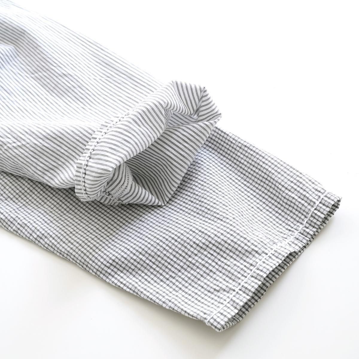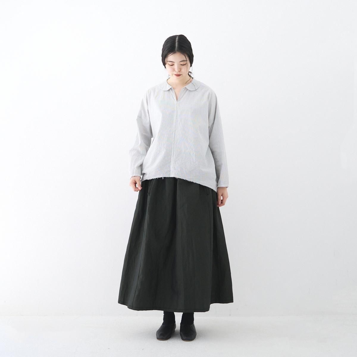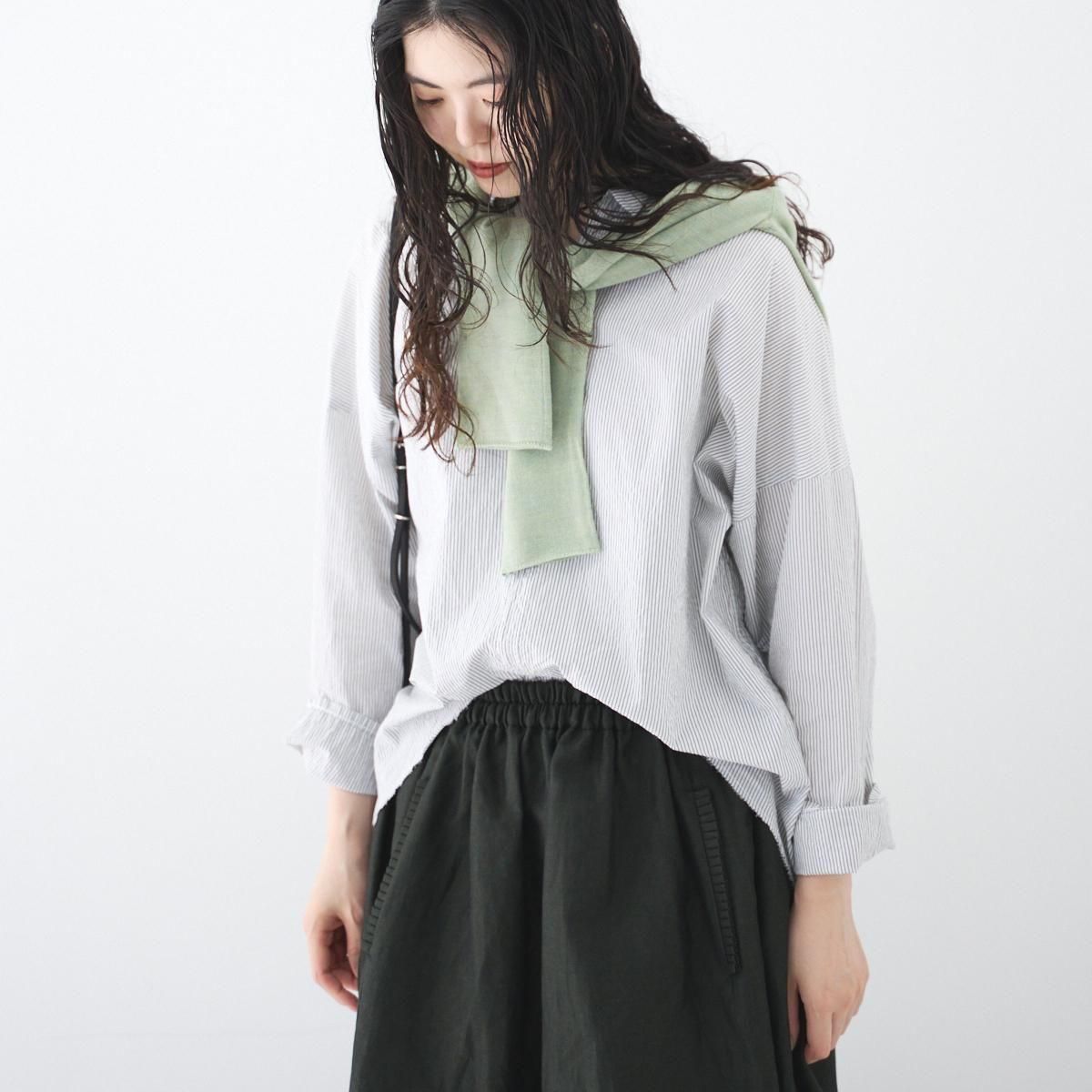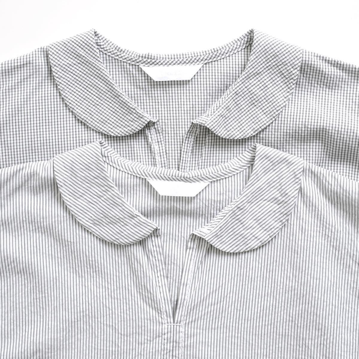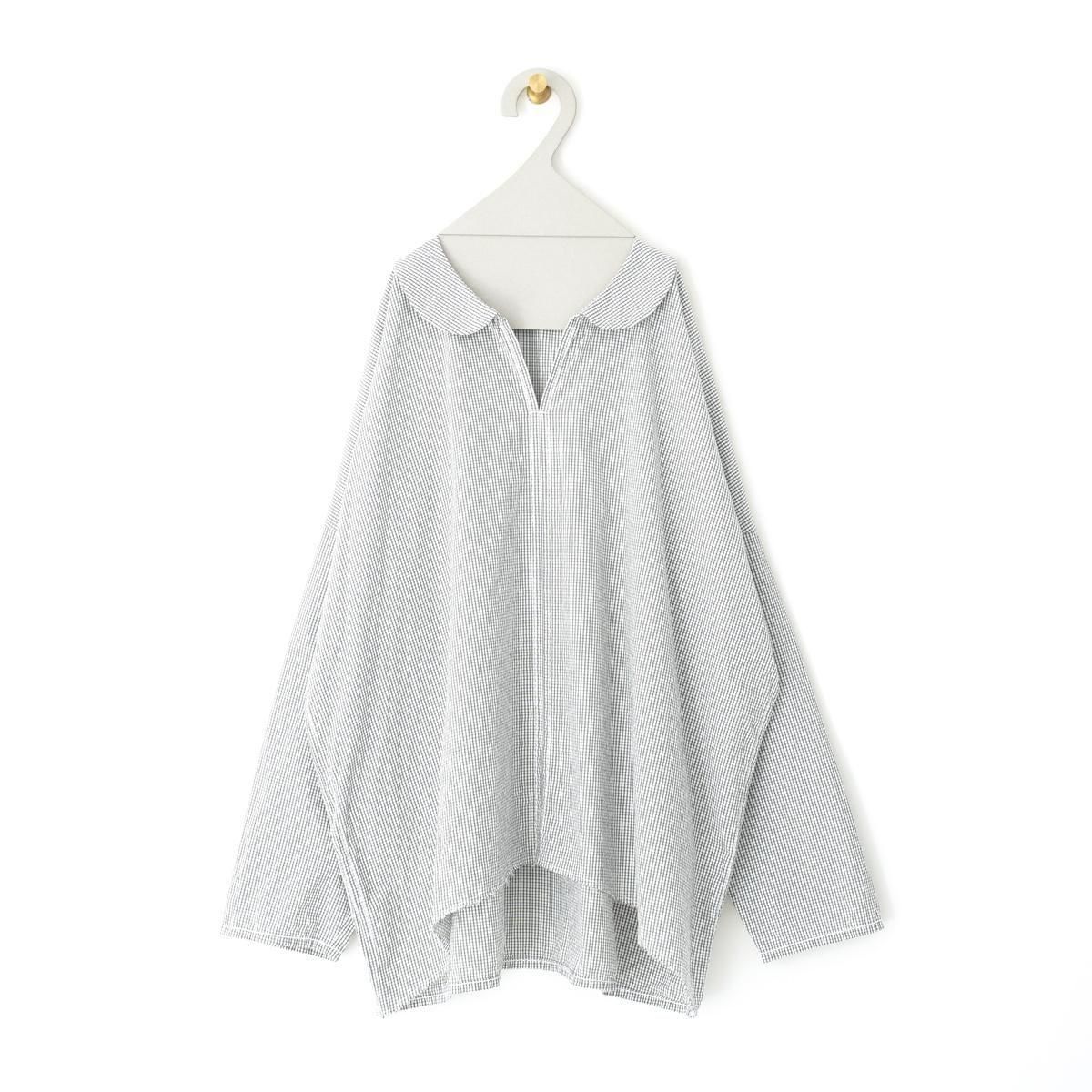 2000年に3人の女性でスタートされたhomspun(ホームスパン)「シンプルで自分たちが毎日着たいと思える服を」そんな彼女たちの思いから生まれたブランドです。 クラシカルな丸襟がポイントのプルオーバーシャツ。薄手で滑らかなハイカウントクロス素材は、独特なシワ感のある綿100%の生地です。 丸いフラットカラーの襟元からスリットが入ったプルオーバー型で、センターに太番手糸でステッチが施されています。前上がりにラウンドしている裾は、フロントのみ断ち切りのラフな仕上げに。またカフスのない袖口なのでロールアップがしやすい仕様です。ドロップショルダーから広めの身幅のゆったりとしたサイズ感なので、身体のラインを拾わずリラックスした着心地です。 涼しい季節からインナーを重ねて寒いシーズンまで、長くお楽しみください。細目のストライプ柄とチェック柄よりお選びくださいませ。 25AW size:F 着丈(前)57cm(後)76cm/身幅64cm/裄丈78cm ※サイズ計測の多少の誤差はご了承下さい。 color:ストライプ/チェック material:コットン 100% model:168cm(ストライプ着用) 取り扱い店舗・・・dieci kyuataro店2F size_chart