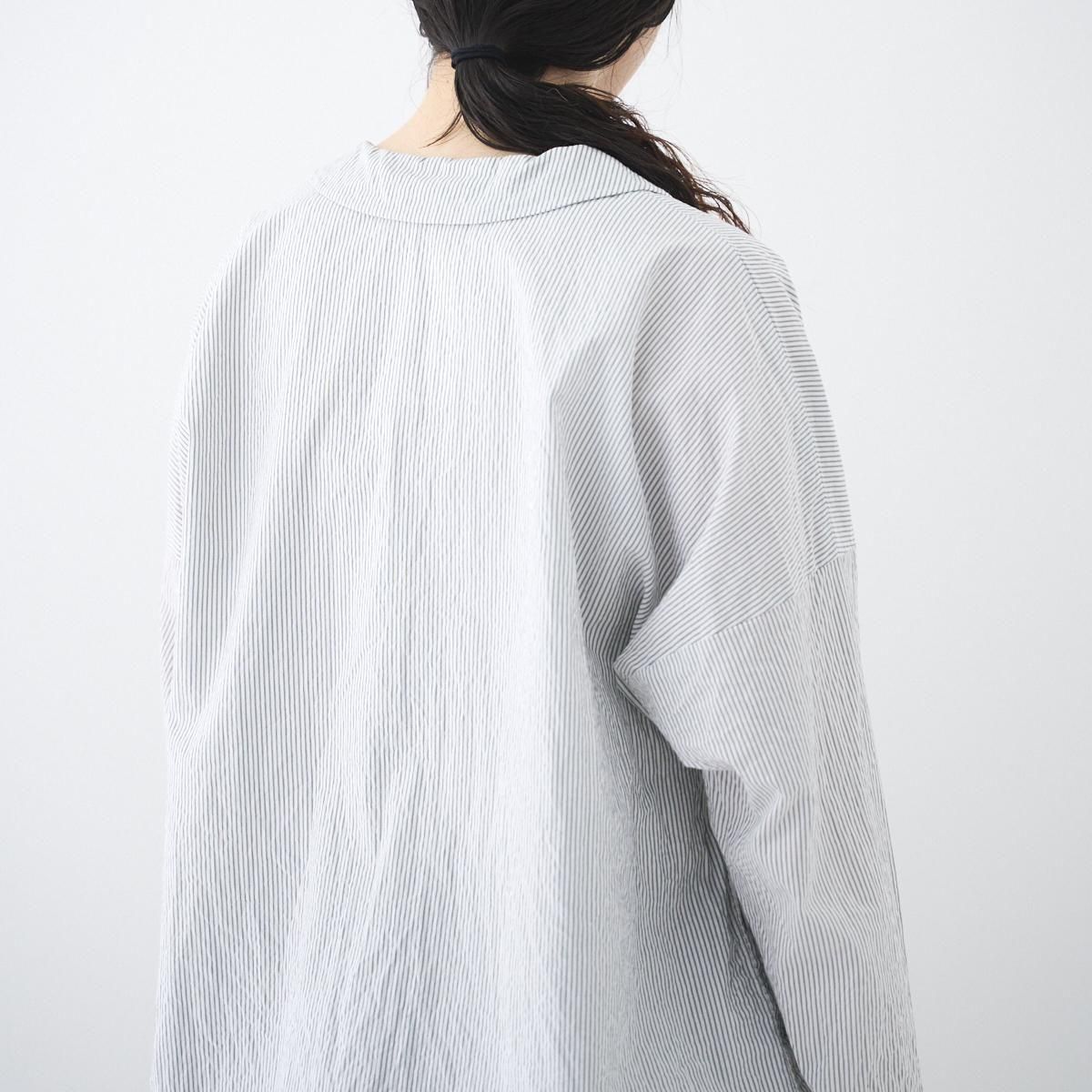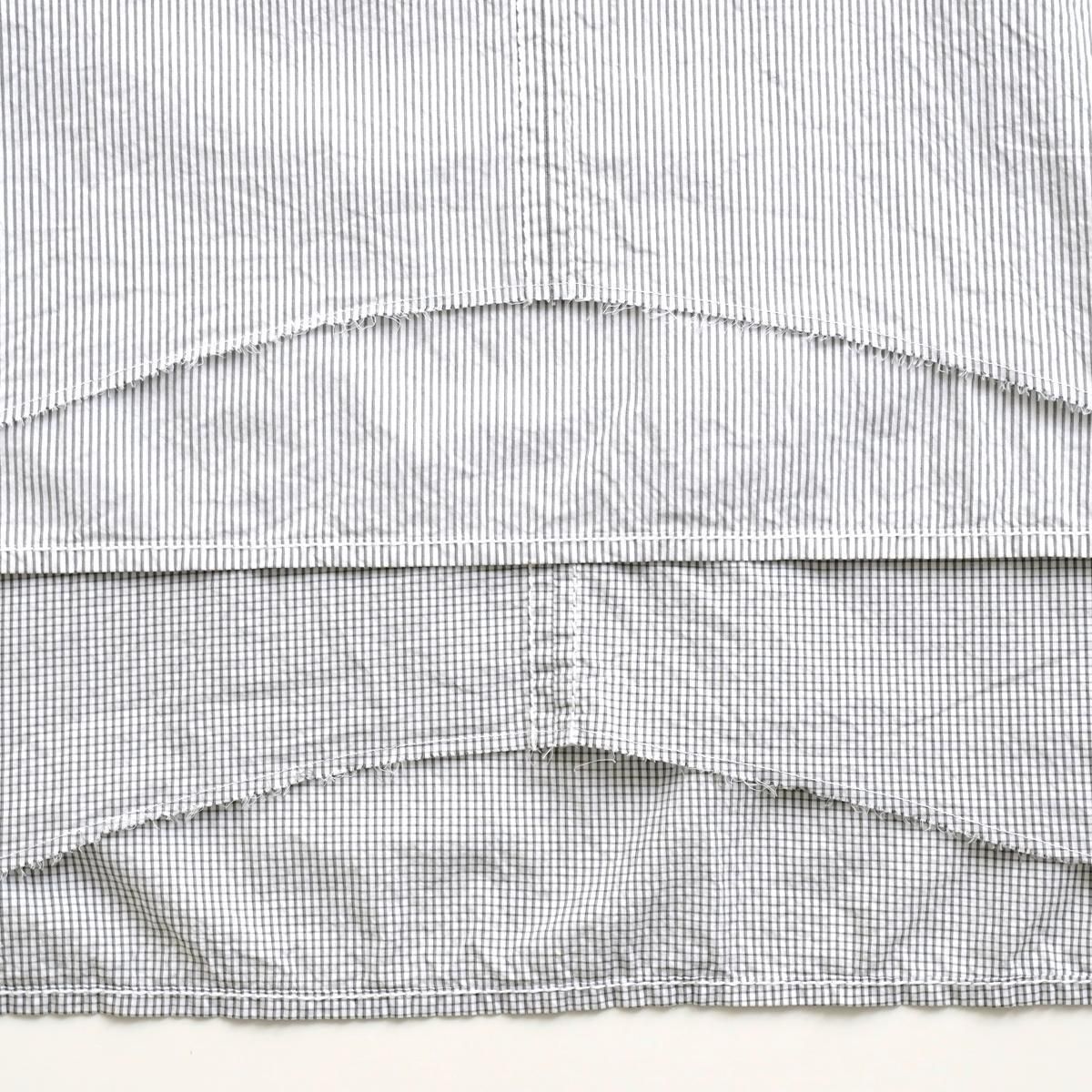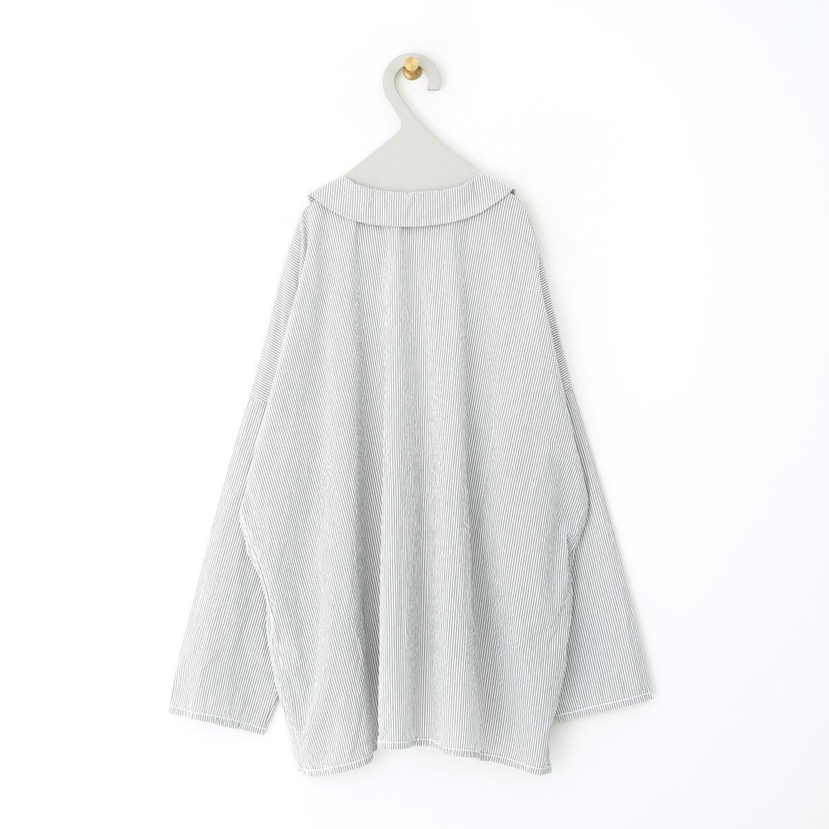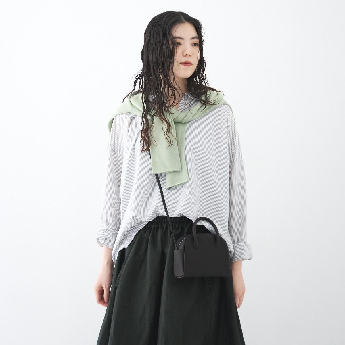 2000年に3人の女性でスタートされたhomspun(ホームスパン)「シンプルで自分たちが毎日着たいと思える服を」そんな彼女たちの思いから生まれたブランドです。 クラシカルな丸襟がポイントのプルオーバーシャツ。薄手で滑らかなハイカウントクロス素材は、独特なシワ感のある綿100%の生地です。 丸いフラットカラーの襟元からスリットが入ったプルオーバー型で、センターに太番手糸でステッチが施されています。前上がりにラウンドしている裾は、フロントのみ断ち切りのラフな仕上げに。またカフスのない袖口なのでロールアップがしやすい仕様です。ドロップショルダーから広めの身幅のゆったりとしたサイズ感なので、身体のラインを拾わずリラックスした着心地です。 涼しい季節からインナーを重ねて寒いシーズンまで、長くお楽しみください。細目のストライプ柄とチェック柄よりお選びくださいませ。 25AW size:F 着丈(前)57cm(後)76cm/身幅64cm/裄丈78cm ※サイズ計測の多少の誤差はご了承下さい。 color:ストライプ/チェック material:コットン 100% model:168cm(ストライプ着用) 取り扱い店舗・・・dieci kyuataro店2F size_chart