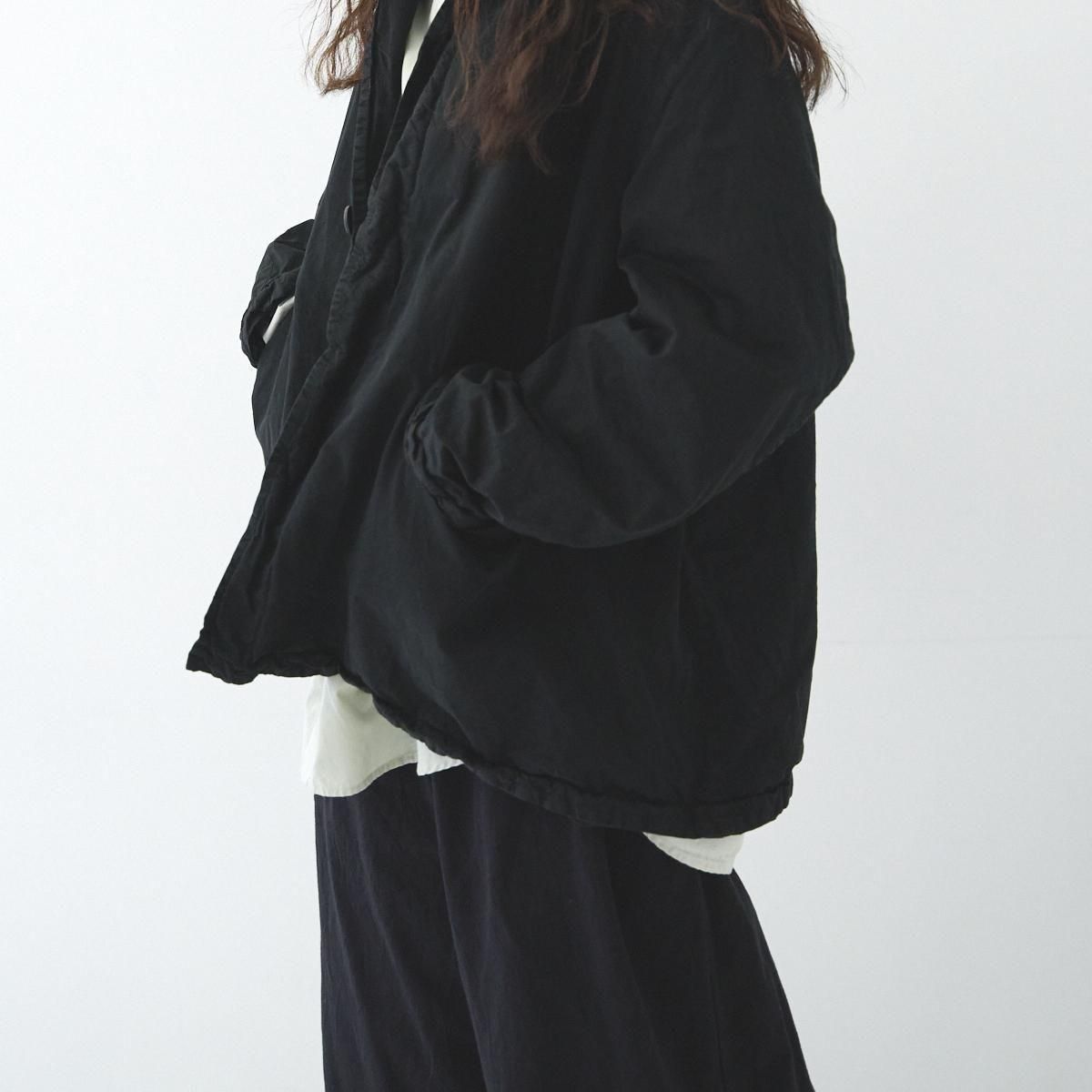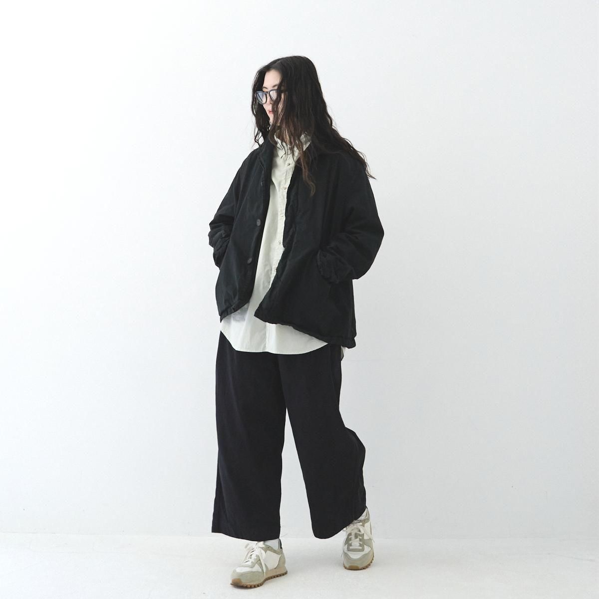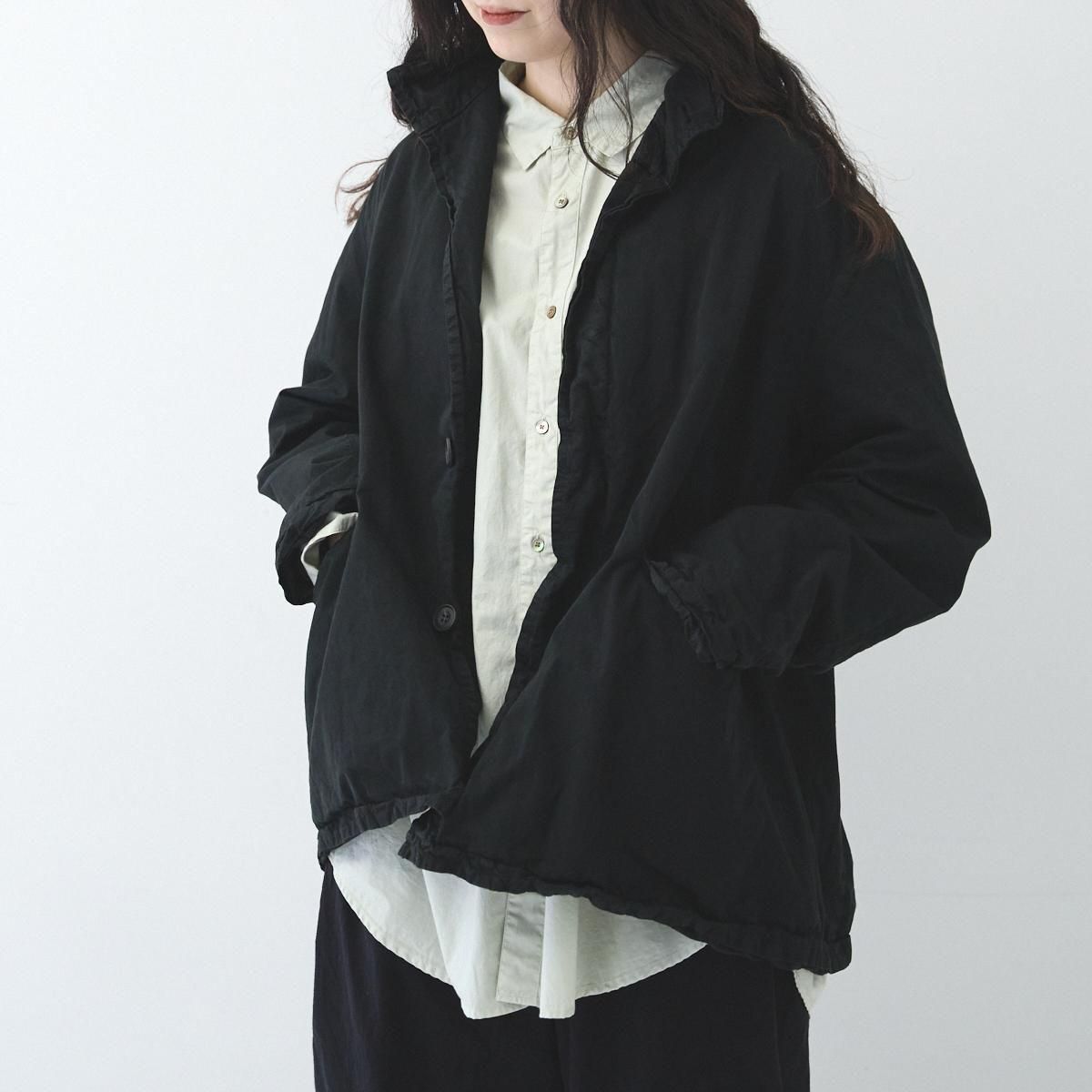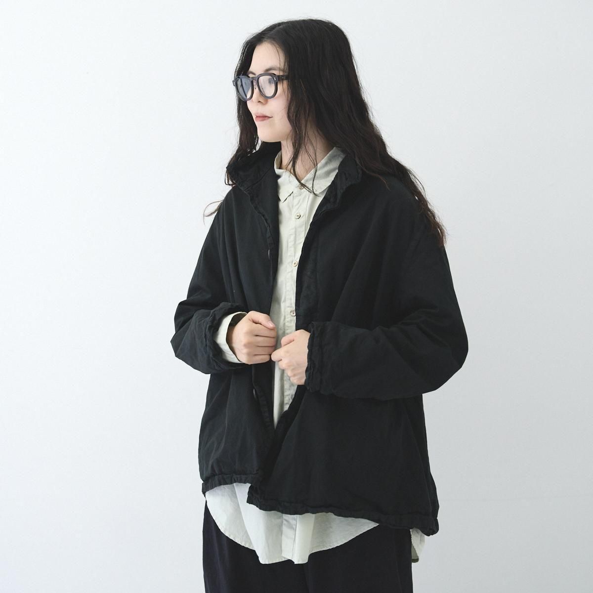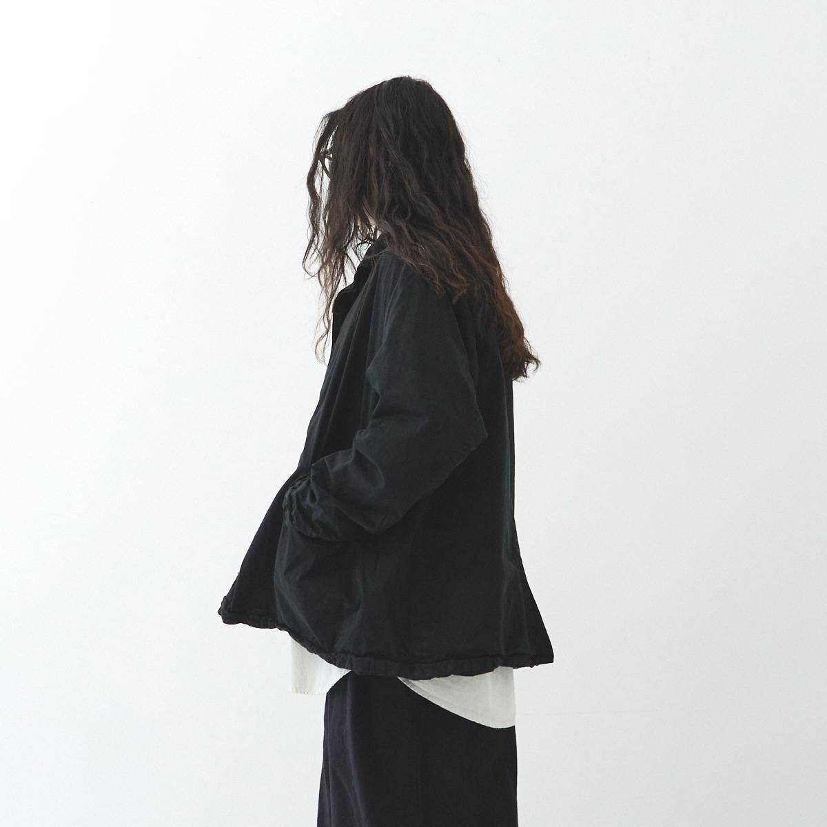ハリのある厚手のハイカウントツイル生地を使用したショートコートです。製品染めを行うことで、随所にパッカリング(縫い目部分にできるシワや凹凸のこと)が起こり、洗いざらしのシワを残したカジュアルな表情に仕上がっています。 前開きの比翼仕立てで衿元はスタンドカラー。裏地にもハリのあるコットン素材を用いた 2 枚仕立てです。アームホールの後ろ側にマチがついたミニタリージャケットの要素も取り込んだデザイン。広めの身幅が立体感のあるシルエットを描き適度なボリュームが生まれます。軽やかに羽織れるコットンジャケットは、季節の変わり目に大活躍するアイテム。秋から冬にかけて長くお召しいただけます。 25AW 天然染め color:Khaki / Black Khaki : ログウッド、キハダ Black : ログウッド、ヤマモモ size:F 着丈72cm/身幅66cm/肩幅48cm/アームホール60cm/袖丈60cm/袖口幅17cm/裾幅70cm ※サイズ計測の多少の誤差はご了承下さい。 material:cotton100% model:168cm お取り扱い店舗・・・dieci kyutaro店2F -------------------------------------------------------- Veritecoeur(ヴェリテクール) 真心という意味を込めて名付けたVeritecoeur。 素材の持つ魅力を活かし、着心地を大切にした、どこか人の手の温もりを感じるモノ作り。フォーマルからデイリーまで、ブランドらしさを失わない豊富なコレクション。 着て、洗ってを繰り返し、自分らしい愛着のある1枚へと育てて欲しい作り手の想い。 それぞれの暮らしを想い描きながら届ける、心豊かになれる日常着です。 size_chart
