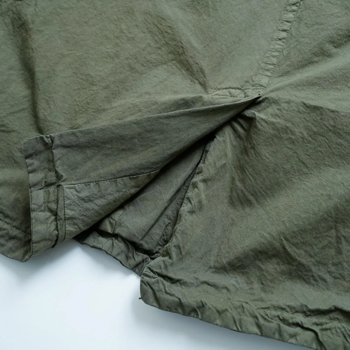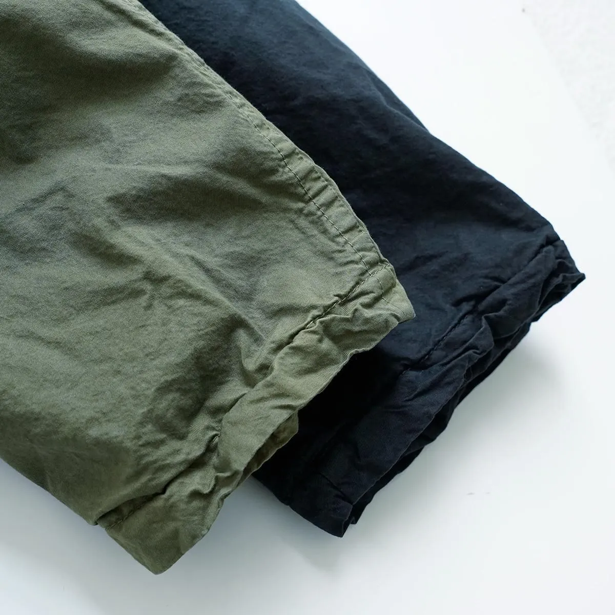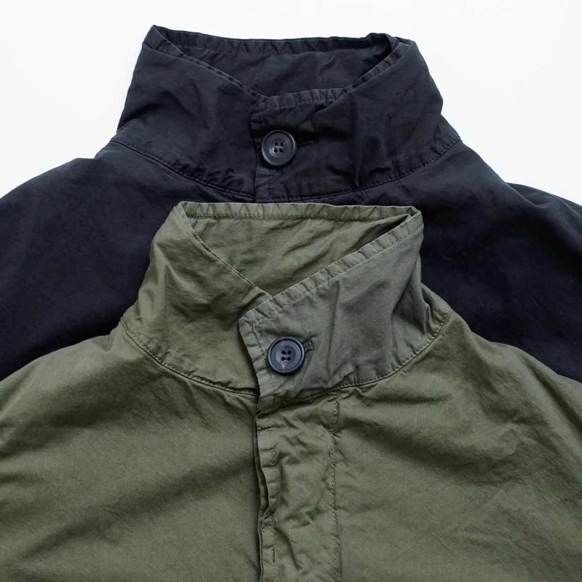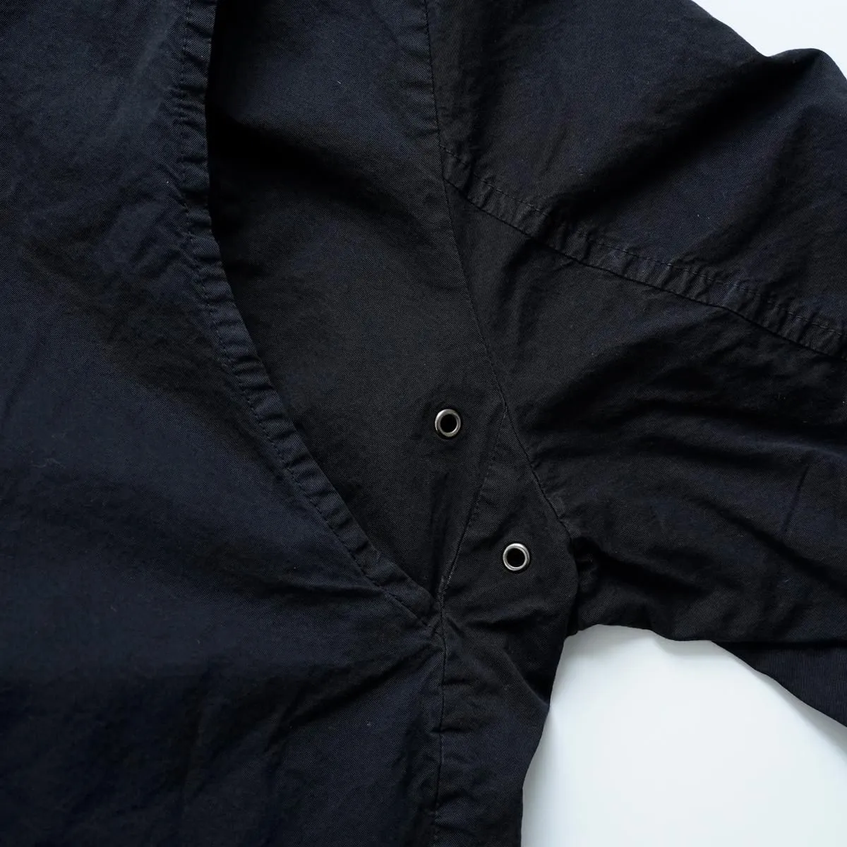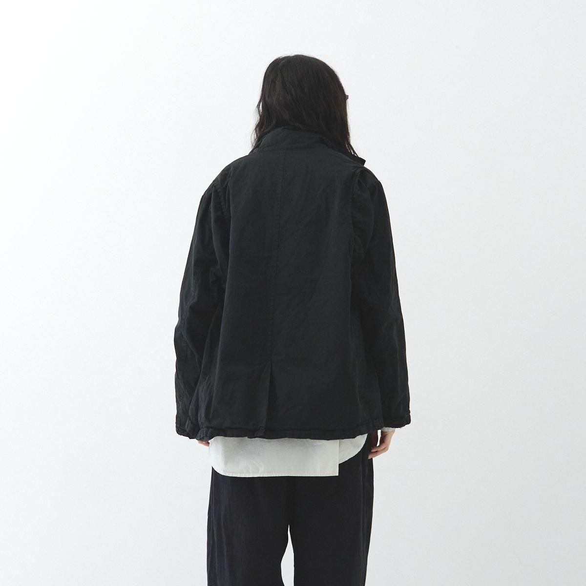 ハリのある厚手のハイカウントツイル生地を使用したショートコートです。製品染めを行うことで、随所にパッカリング(縫い目部分にできるシワや凹凸のこと)が起こり、洗いざらしのシワを残したカジュアルな表情に仕上がっています。 前開きの比翼仕立てで衿元はスタンドカラー。裏地にもハリのあるコットン素材を用いた 2 枚仕立てです。アームホールの後ろ側にマチがついたミニタリージャケットの要素も取り込んだデザイン。広めの身幅が立体感のあるシルエットを描き適度なボリュームが生まれます。軽やかに羽織れるコットンジャケットは、季節の変わり目に大活躍するアイテム。秋から冬にかけて長くお召しいただけます。 25AW 天然染め color:Khaki / Black Khaki : ログウッド、キハダ Black : ログウッド、ヤマモモ size:F 着丈72cm/身幅66cm/肩幅48cm/アームホール60cm/袖丈60cm/袖口幅17cm/裾幅70cm ※サイズ計測の多少の誤差はご了承下さい。 material:cotton100% model:168cm お取り扱い店舗・・・dieci kyutaro店2F -------------------------------------------------------- Veritecoeur(ヴェリテクール) 真心という意味を込めて名付けたVeritecoeur。 素材の持つ魅力を活かし、着心地を大切にした、どこか人の手の温もりを感じるモノ作り。フォーマルからデイリーまで、ブランドらしさを失わない豊富なコレクション。 着て、洗ってを繰り返し、自分らしい愛着のある1枚へと育てて欲しい作り手の想い。 それぞれの暮らしを想い描きながら届ける、心豊かになれる日常着です。 size_chart