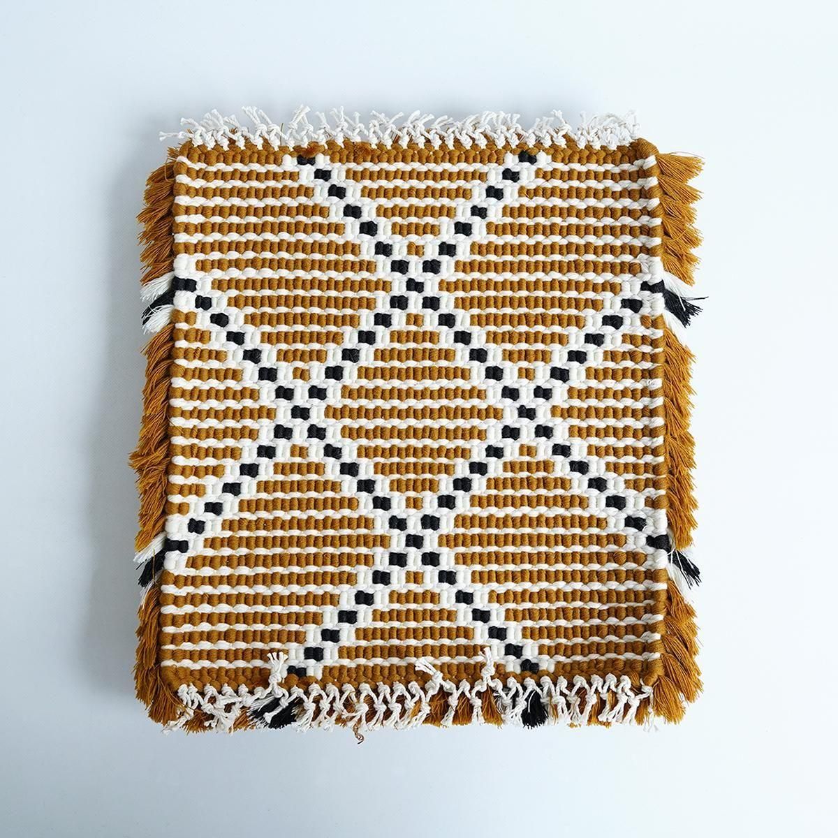 倉敷本染手織研究所さんで制作されたノッティング織の椅子敷きです。一つ一つ織られた美しい織り目と色合いがとても可愛らしく、インテリアのポイントになります。 こちらは通常サイズより一回り小さいサイズで、座面の小さな椅子やベンチにもぴったりです。 ノッティングとは外村吉之介氏が考案した縦機で織られた椅子敷です。 径に木綿糸を張り、ウールもしくは木綿の糸束を結び(ノッティング)つけて制作されたものです。 お写真最後の6枚は倉敷本染手織研究所さんの様子です。 民藝について深く学ばれ、糸を紡ぐことから完成まで丁寧に仕立てられる椅子敷きを是非永くご愛用ください。 size: 大 約40cm×40cm 33,000円(税込) 小 約30cm×30cm 22,000円(税込) material: 表地 wool 100% 裏糸 cotton 100% 経糸 cotton 100% 取扱い店舗…dieci天神橋店