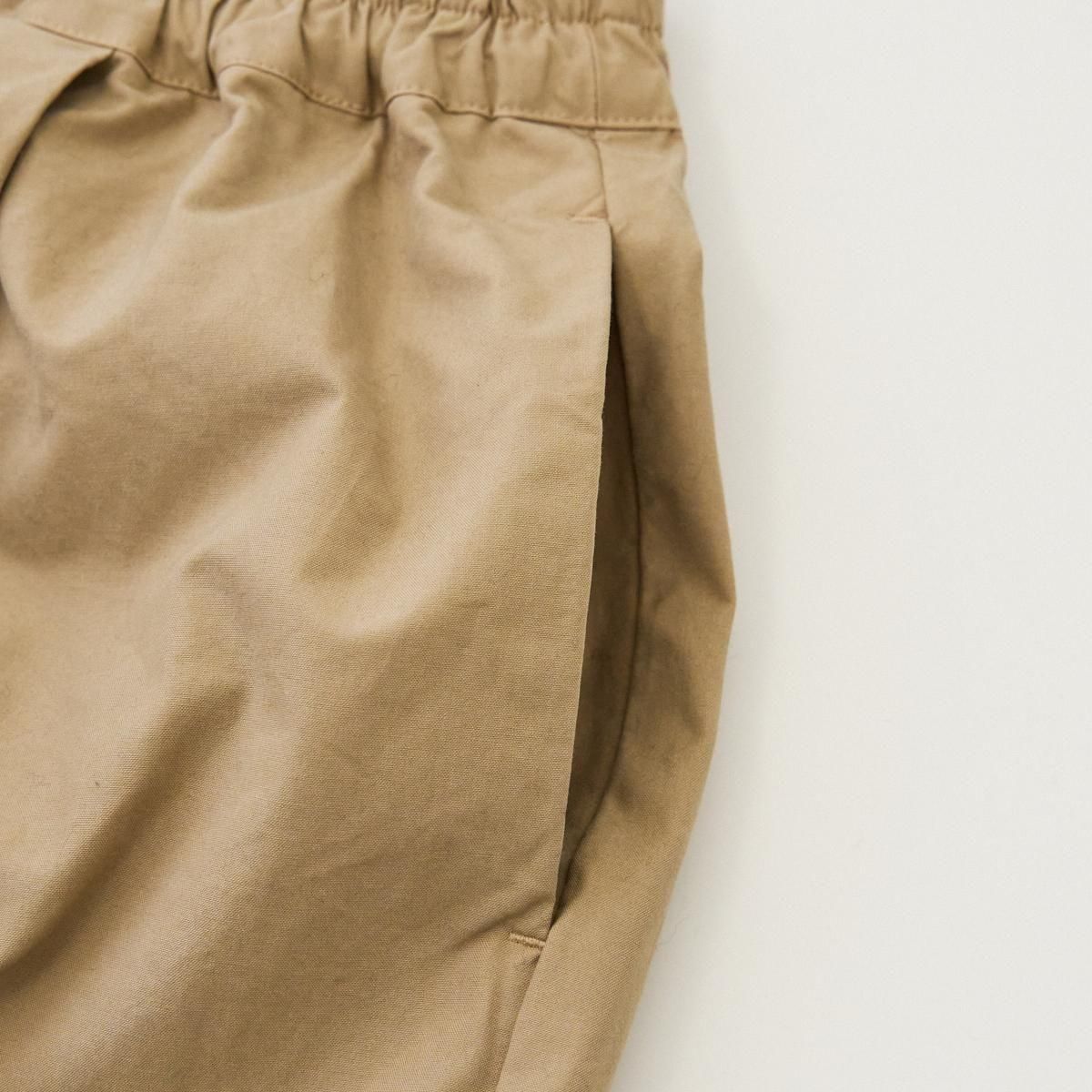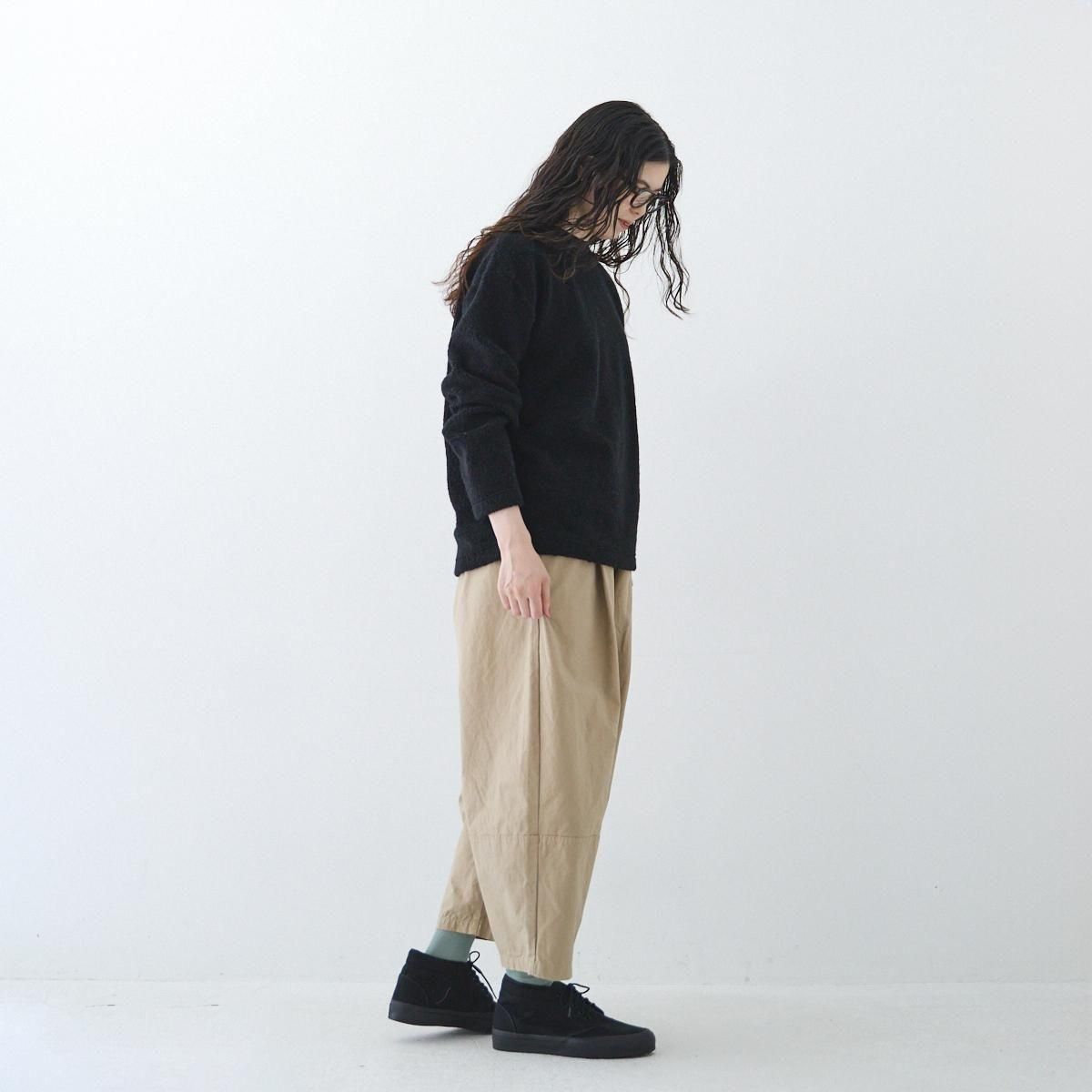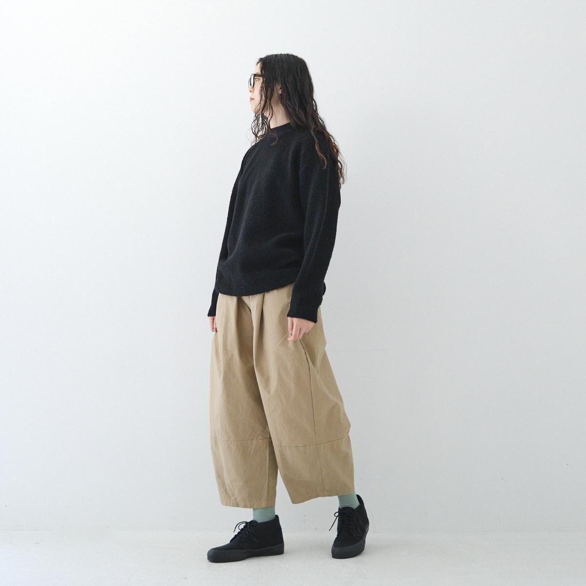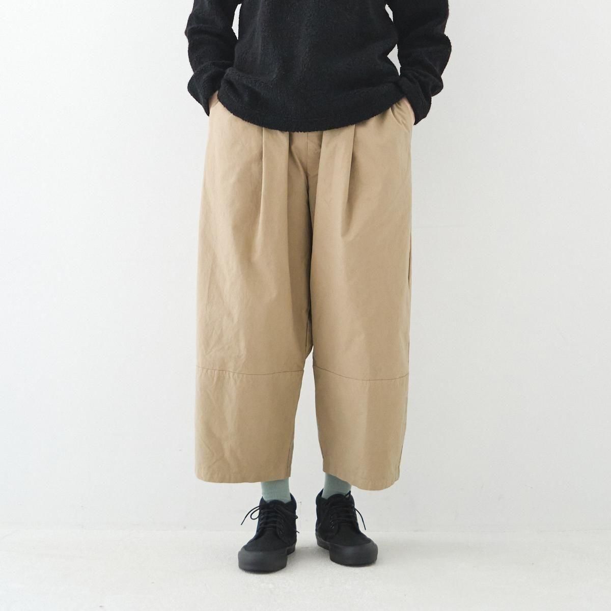 丸みのあるコクーンシルエットのパンツ。ウエストにタックを施し、腰回りにゆとりを持たせたリラックスした着心地です。裾部分に切り替えを入れることで特徴的なフォルムが生まれ、バランスよくお召しいただけます。 中肉厚のコットンウェザー素材は程よいハリがあり、よりコクーンシルエットの丸みが際立つ素材感。製品染めを施した洗いざらしの風合いが、心地よい日常を作りだすベーシックなアイテムです。 25AW size:F ウエスト35~46cm/股上40cm/股下53cm/ヒップ55cm/わたり40cm/裾幅25.5cm ※サイズ計測の多少の誤差はご了承下さい。 material:cotton100% color:Beige/Navy black model:168cm お取り扱い店舗・・・dieci kyutaro店2F -------------------------------------------------------- Veritecoeur(ヴェリテクール) 真心という意味を込めて名付けたVeritecoeur。 素材の持つ魅力を活かし、着心地を大切にした、どこか人の手の温もりを感じるモノ作り。フォーマルからデイリーまで、ブランドらしさを失わない豊富なコレクション。 着て、洗ってを繰り返し、自分らしい愛着のある1枚へと育てて欲しい作り手の想い。 それぞれの暮らしを想い描きながら届ける、心豊かになれる日常着です。 size_chart