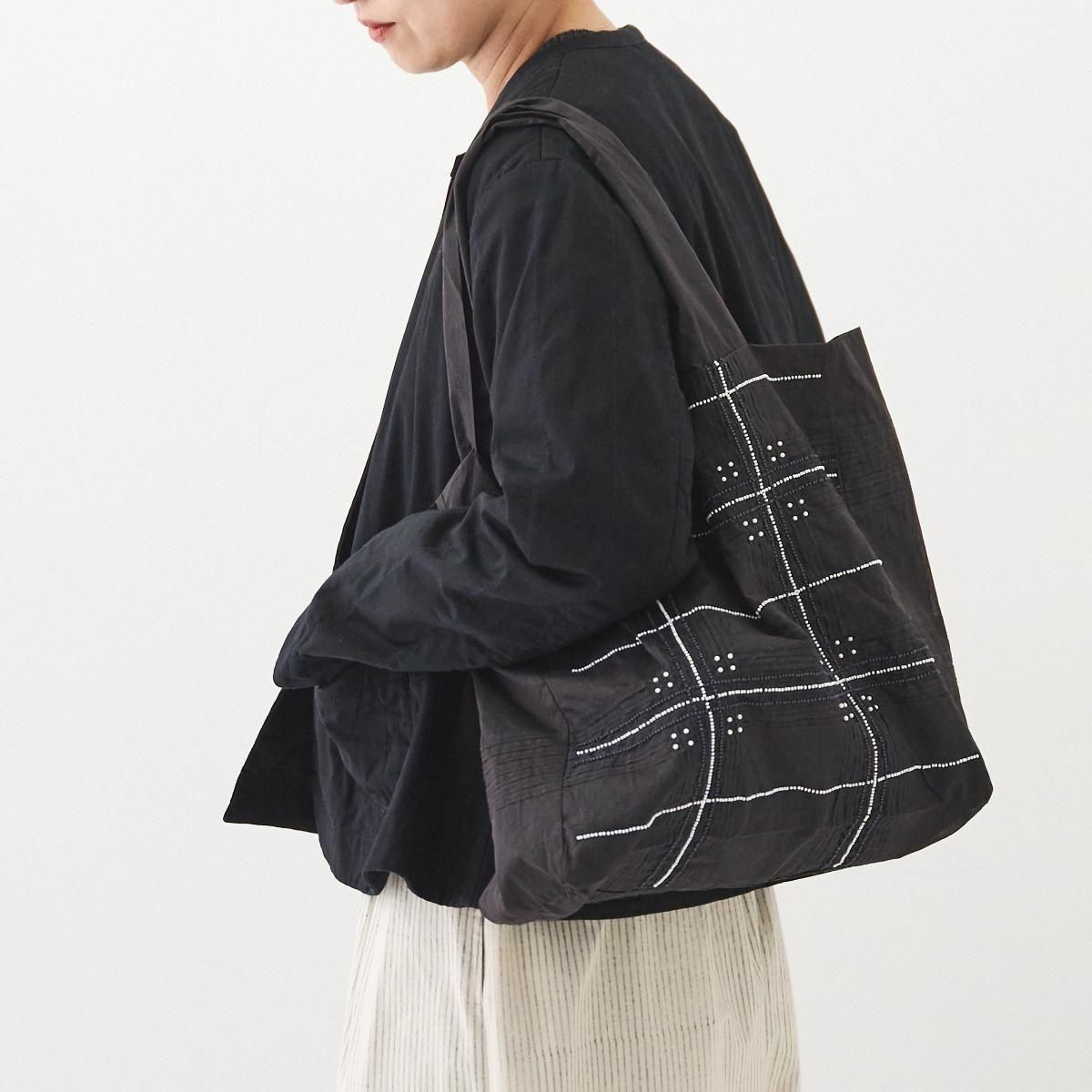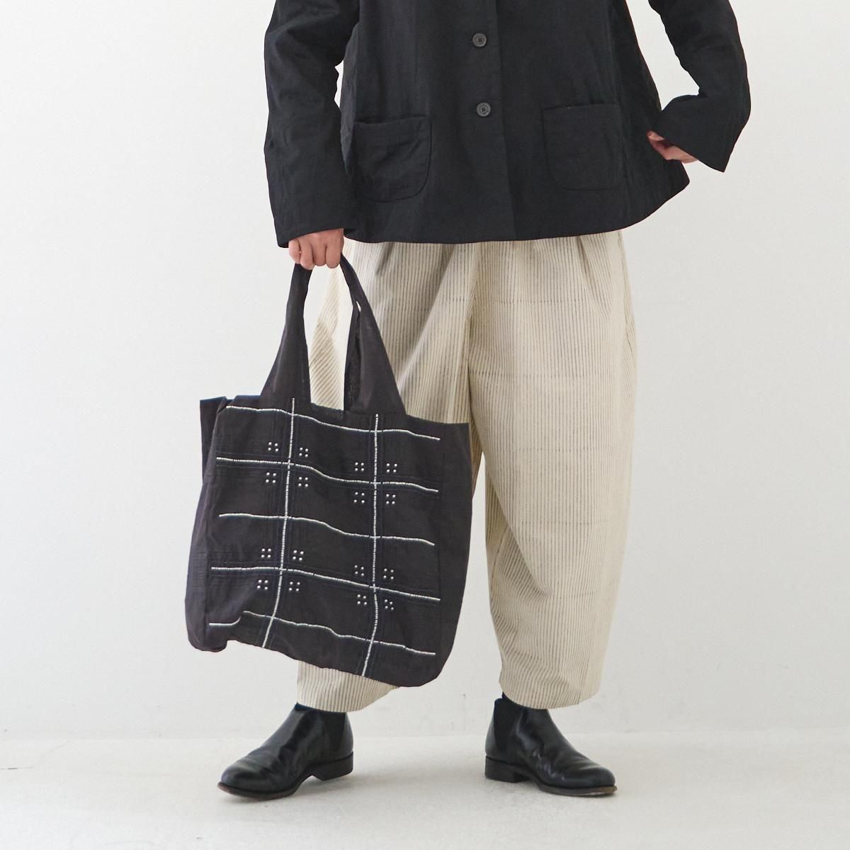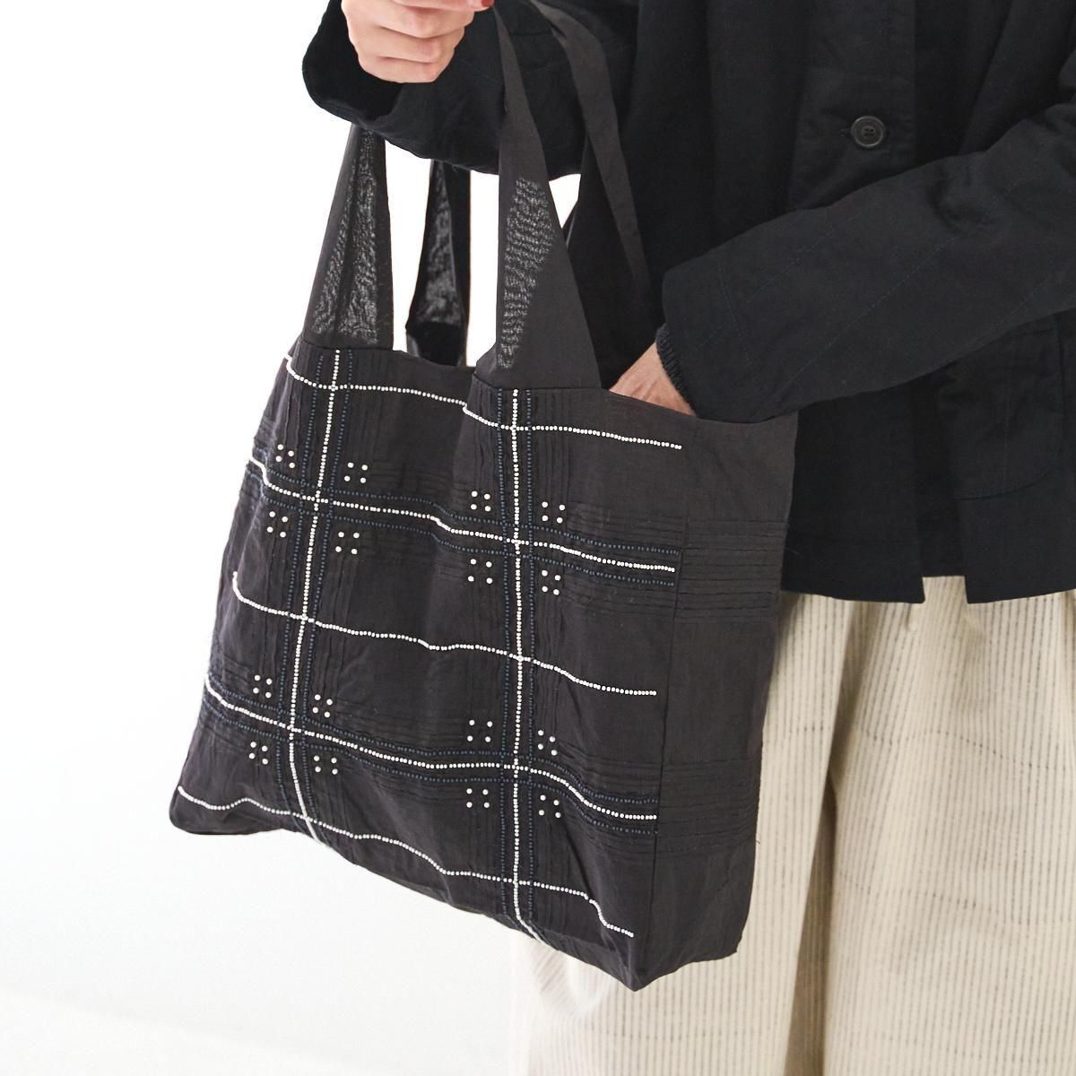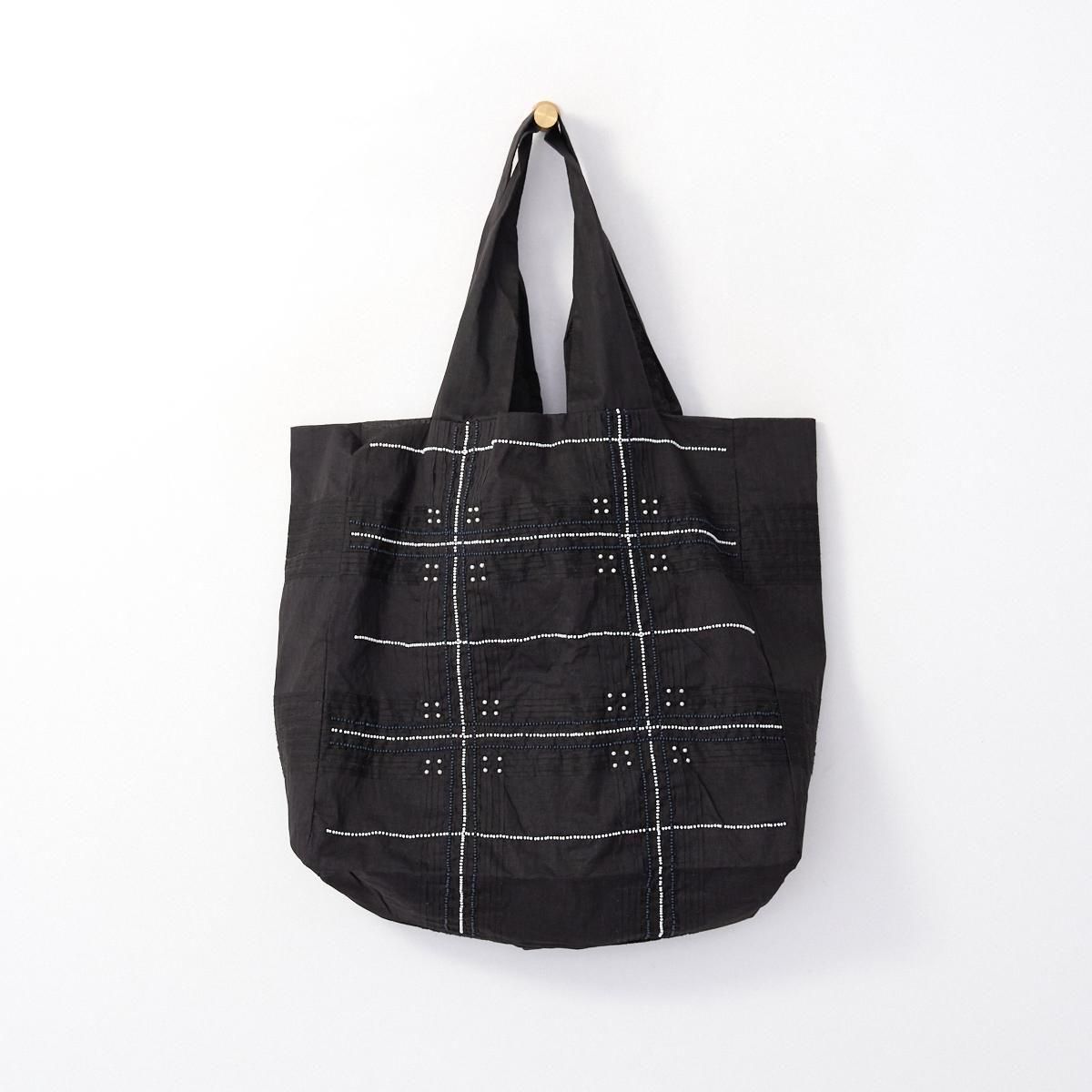 Khadi and Co(カディ アンド コー) はデザイナーのベス・ニールセンが立ち上げたフランス、パリのファブリックブランド。 インド伝統の手紡ぎによるカディを使用しているため、不均一な織りから生まれる独特の美しい風合いを持つ。ハンドメイドならではの使い込むごとにます美しさも魅力のひとつです。 ジュート生地に手仕事を感じるビーズ刺繍が施され、 軽量ながらたっぷりとした容量が嬉しいバッグです。 コーディネートのアクセントにもなります。 インド製 color:BLACK size: W35cm/H34cm/D13cm/持ち手50cm ※サイズ計測の多少の誤差はご了承下さい。 material: Jute100% ※手織り生地の為、ネップやほつれなどが見られる場合がございますが、手仕事の特性としてご理解くださいませ。柄の出方には個体差がございます。ご了承くださいませ。 お洗濯は、漂白剤や蛍光剤入り洗剤のご使用は避け、単独手洗いして下さい。 お取り扱い店舗・・・dieci芝川ビル店 size_chart
